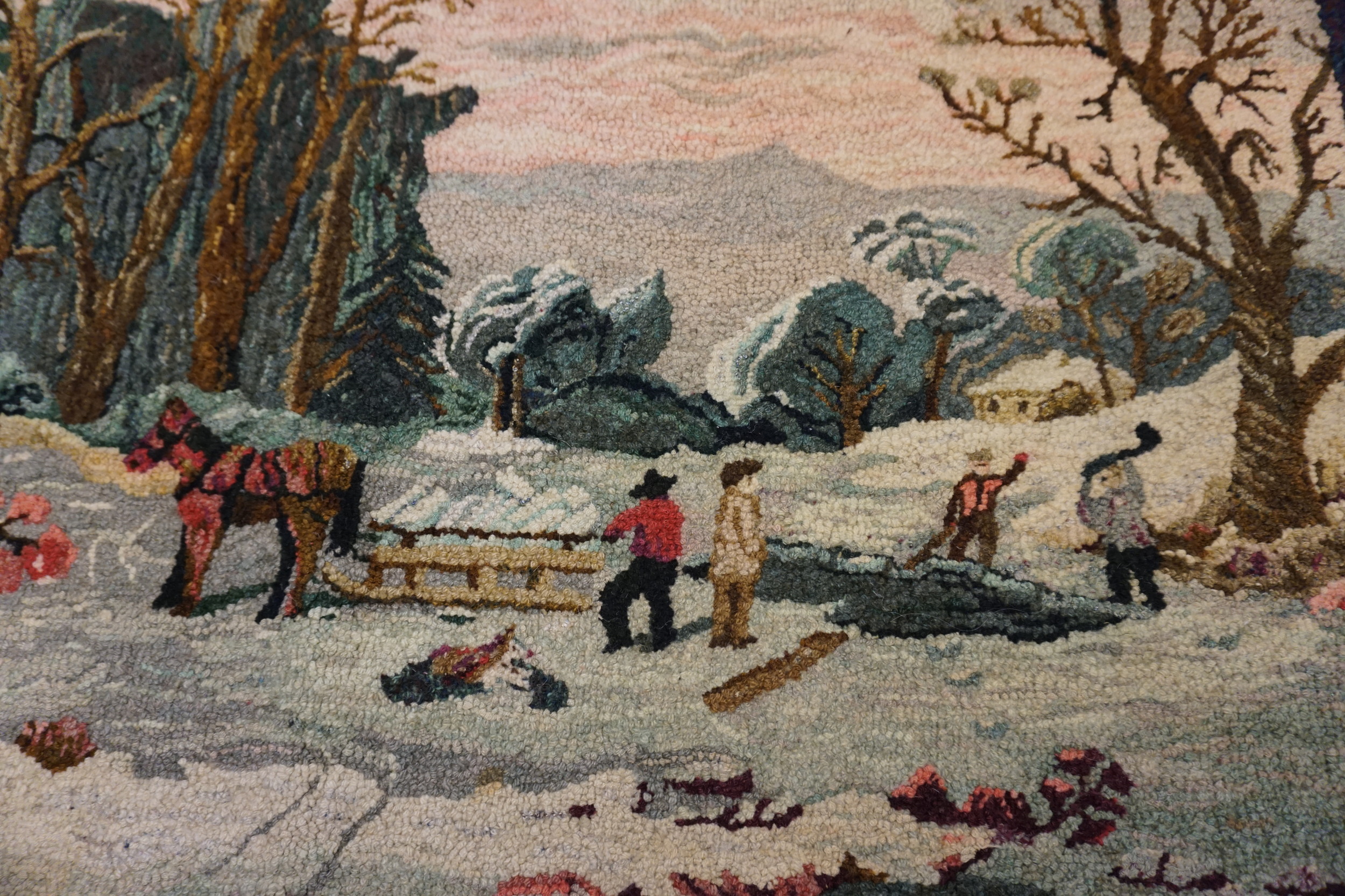 Executed in the traditional hooked technique, the dense, textural pile creates an almost three-dimensional quality, enhancing the depth of the landscape. The composition features a dramatic, snow-laden forest clearing, where figures engage in labor, possibly logging or trapping, lending the piece a narrative quality rarely seen in allover rugs or geometric designs.