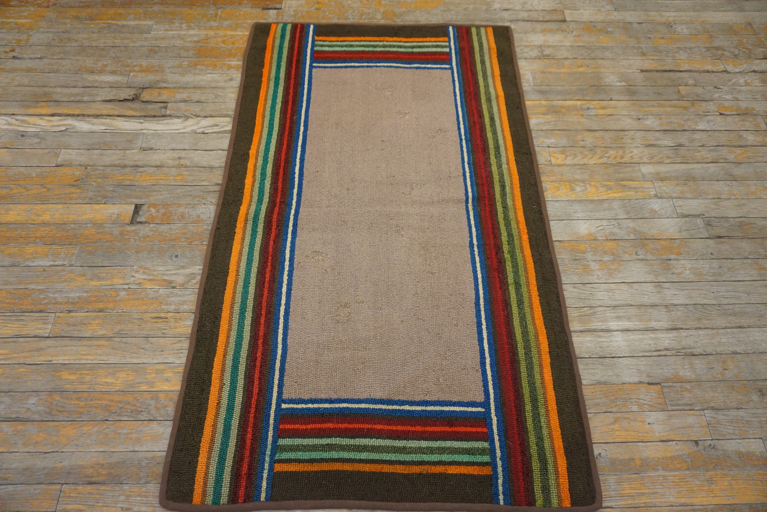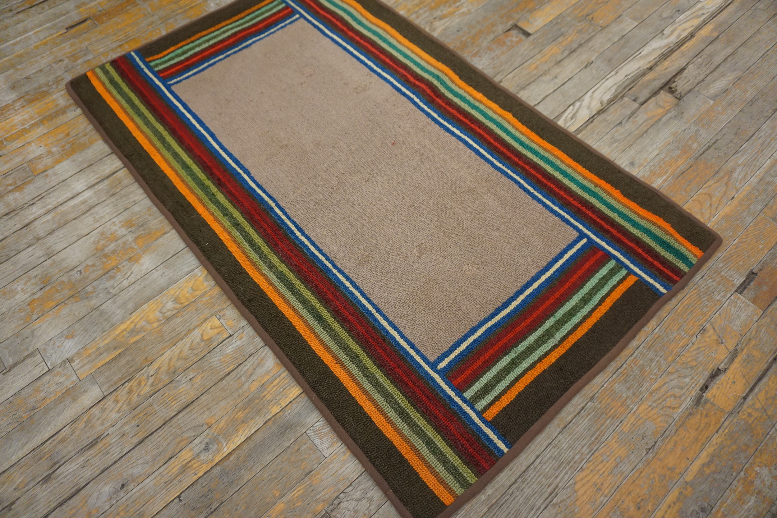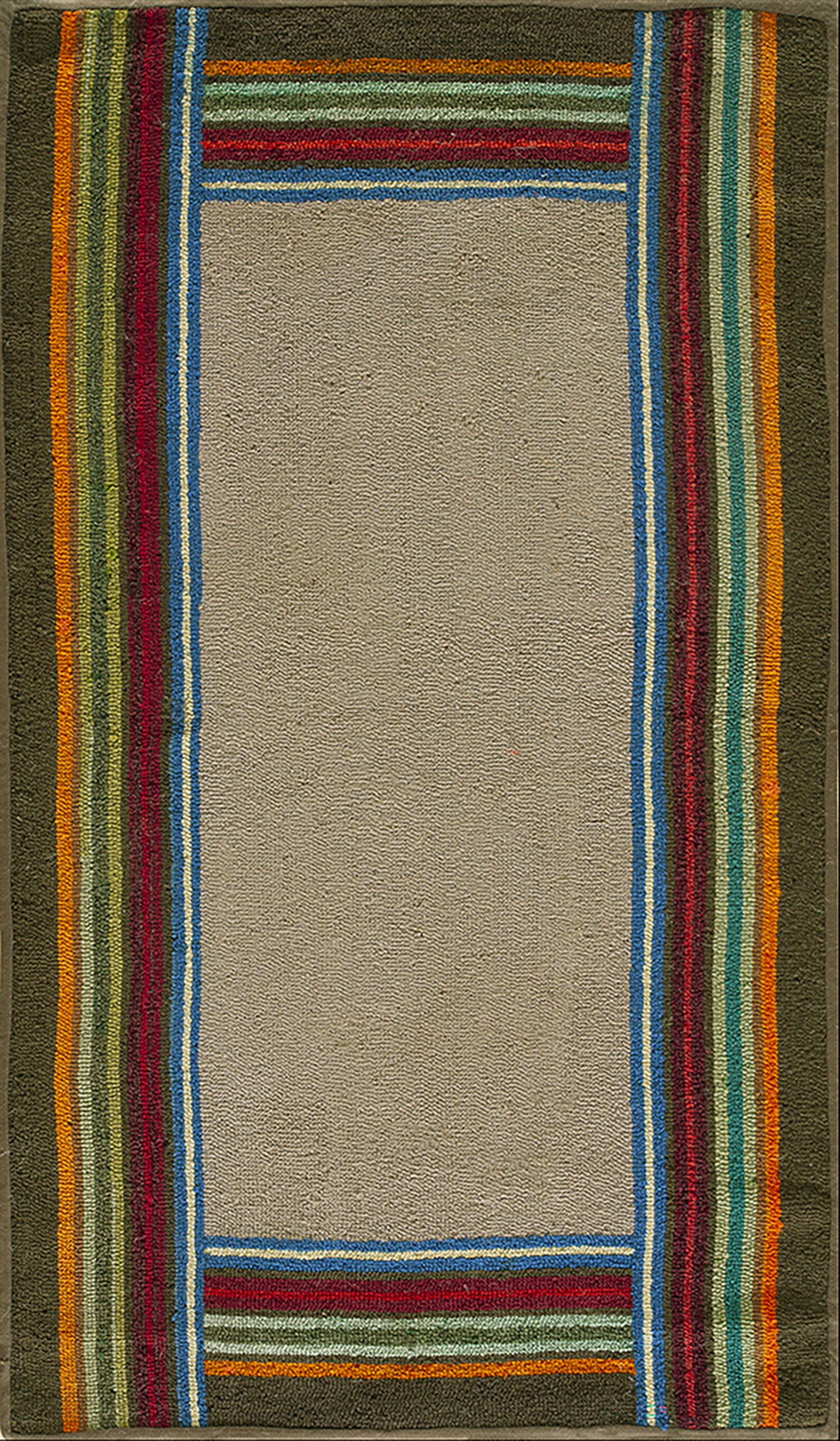 The central field presents a sophisticated, muted taupe that aligns closely with popular ivory color rugs of the era, offering a grounding neutrality. This subtle ground is framed by a striking, multi-hued border composed of tightly packed vertical bands of crimson, deep blue, olive green, and brilliant orange, providing a vibrant contrast.