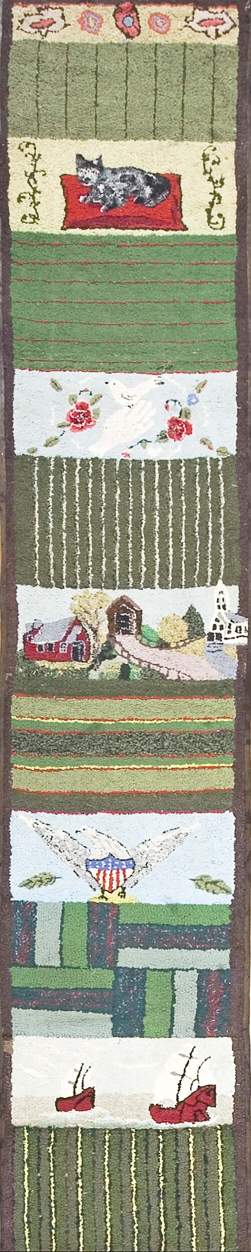 The design is organized into a series of distinct vertical panels, reminiscent of a sampler quilt, each showcasing unique pictorial elements. Motifs range from bold geometric stripes and checkerboard patterns to stylized floral vignettes and patriotic iconography. The dominant palette features various shades of green color rugs, balanced by creamy whites and deep reds, providing a grounding, organic aesthetic suitable for many interiors.