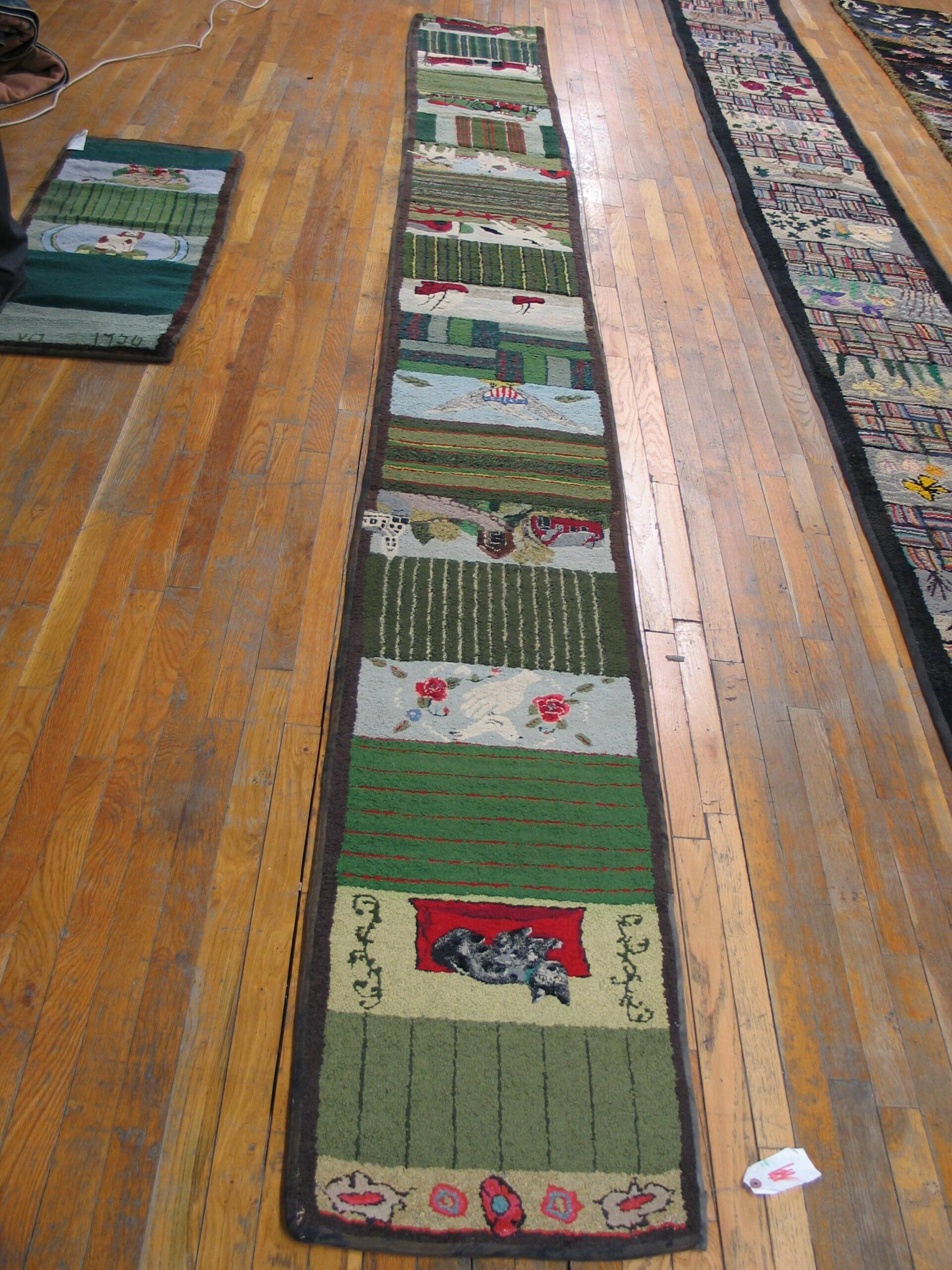 Hallway Runner Rugs (1.08ft x 15.02ft), Country of Origin: American USA Rugs, Circa Date: 1950s. This exceptional piece is a testament to mid-century folk craftsmanship. The technique utilized here is the traditional American hooked rug method, resulting in a rich, textural pile that emphasizes the handmade nature of the artwork. Originating from the American USA Rugs tradition, this runner perfectly captures the whimsical, narrative style popular during the mid-century period.