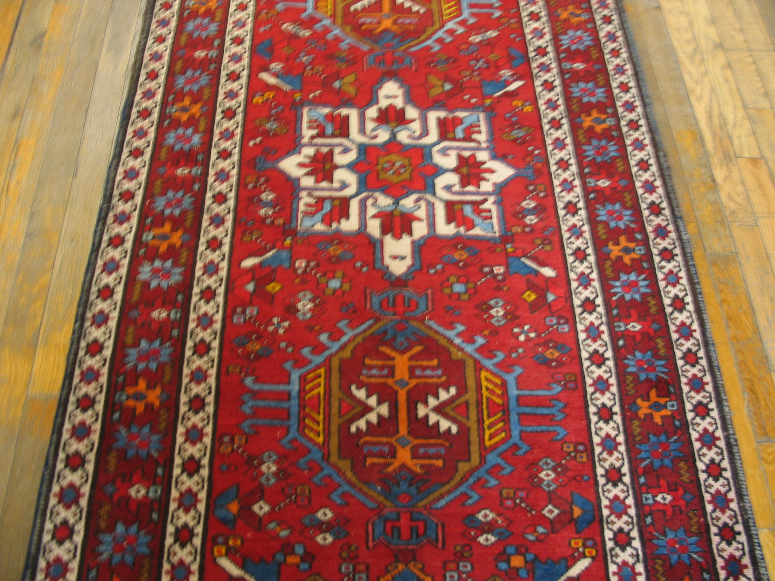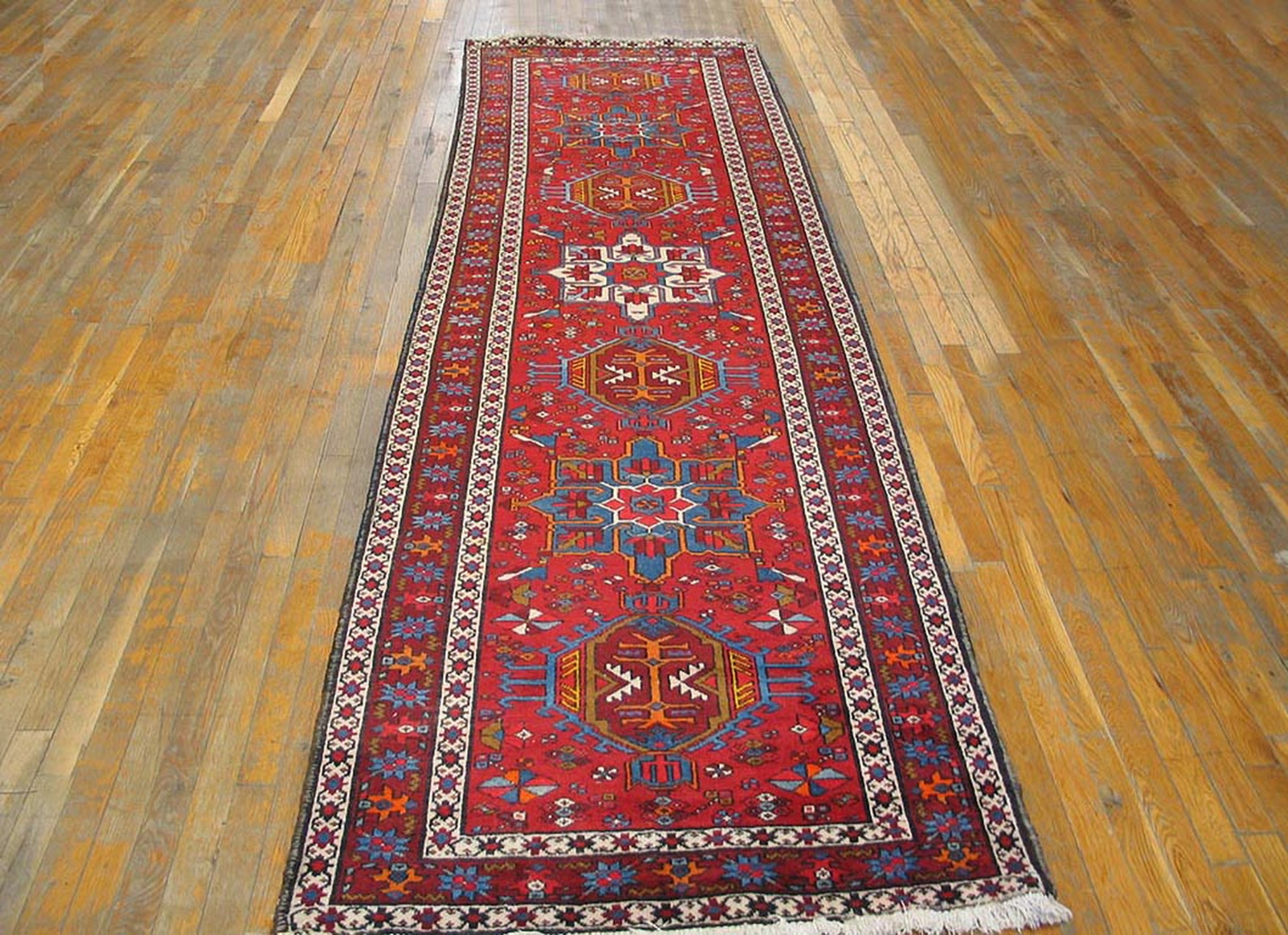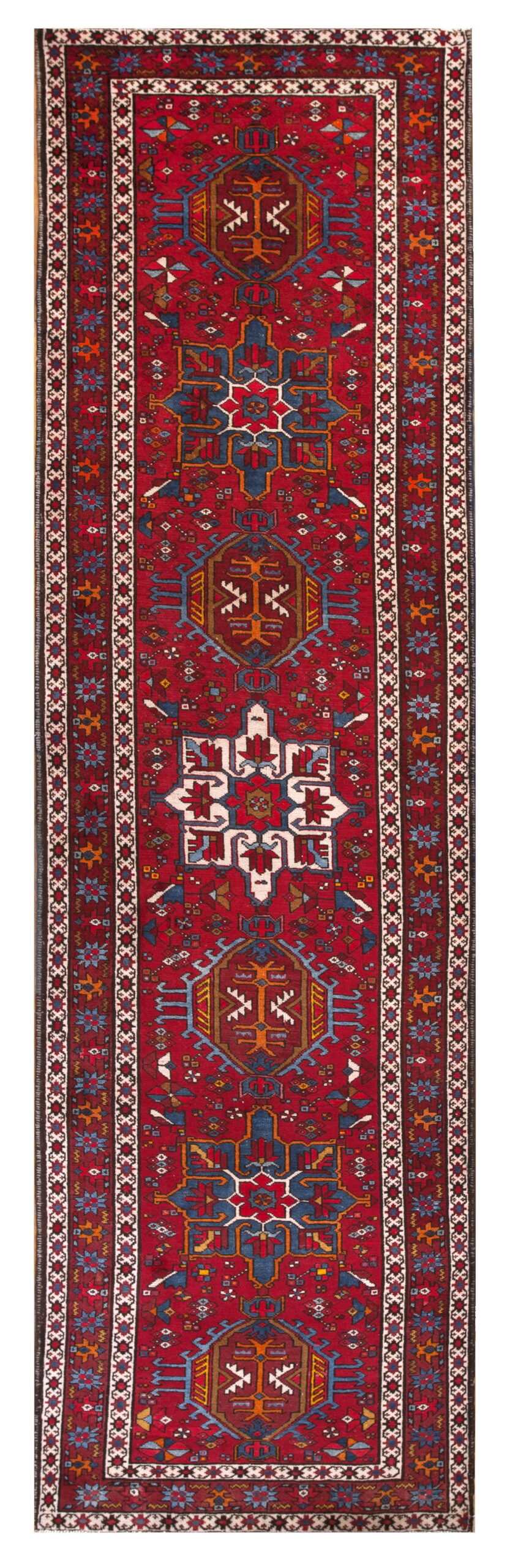 Vintage Karajeh Hallway Runner Wool Red Rug, Circa Date: 1950s. This stunning piece showcases the robust character typical of vintage area rugs from the mid-20th century. Woven with durable, high-quality wool, the textile presents a dense, sturdy structure that speaks to the enduring craftsmanship of Northwest Persian weaving traditions, making it ideal for high-traffic transitional spaces.