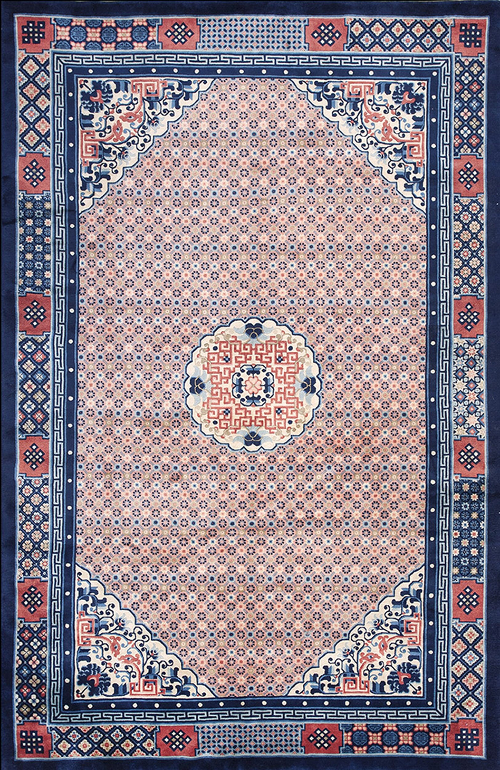 The complex border system employs multiple guard stripes, including a precise Greek key fret, flanking a main border filled with stylized corner spandrels and traditional medallions. This careful arrangement of motifs highlights the inherent balance and structural integrity found within classical geometric rugs of the Chinese tradition.