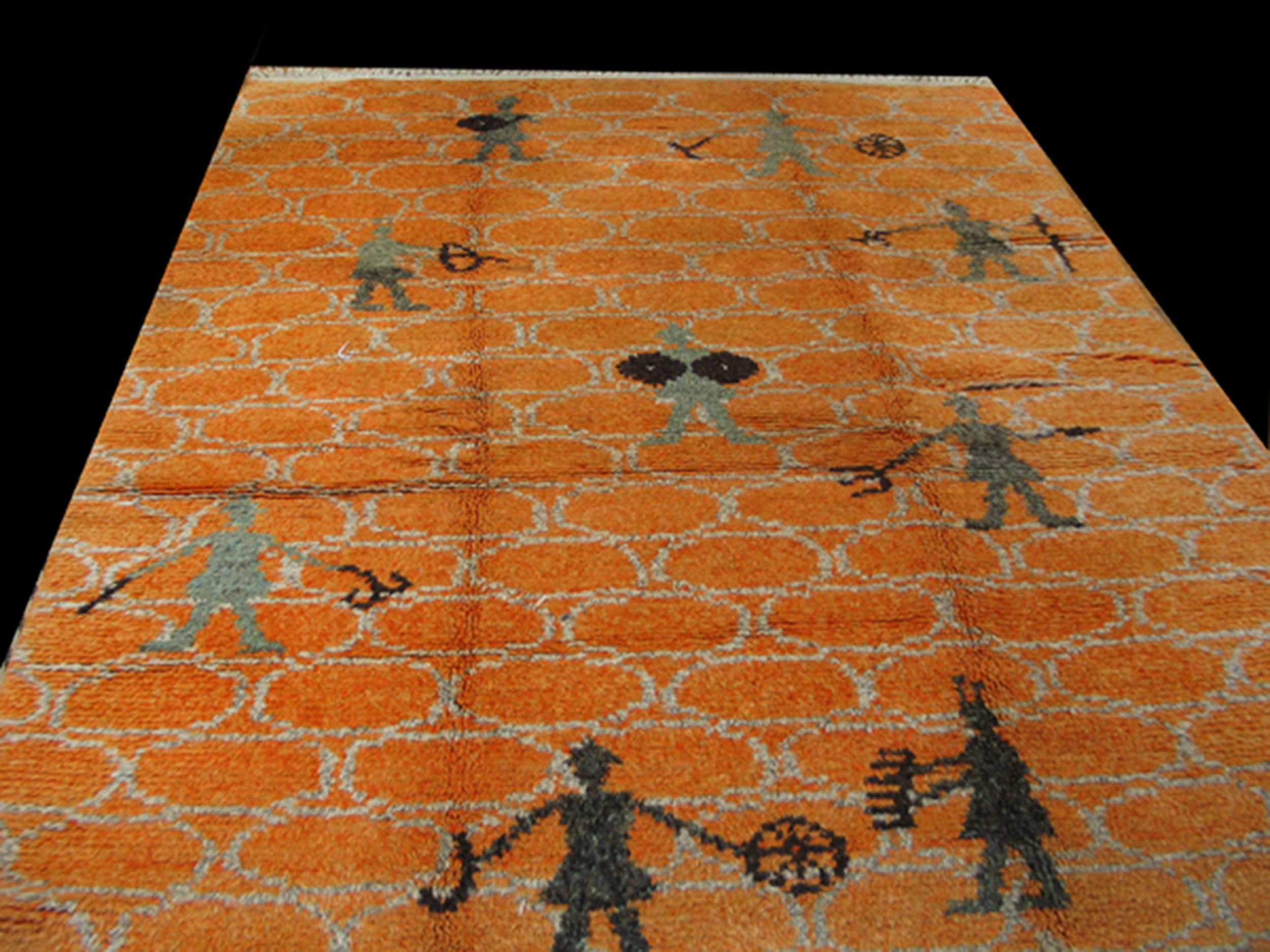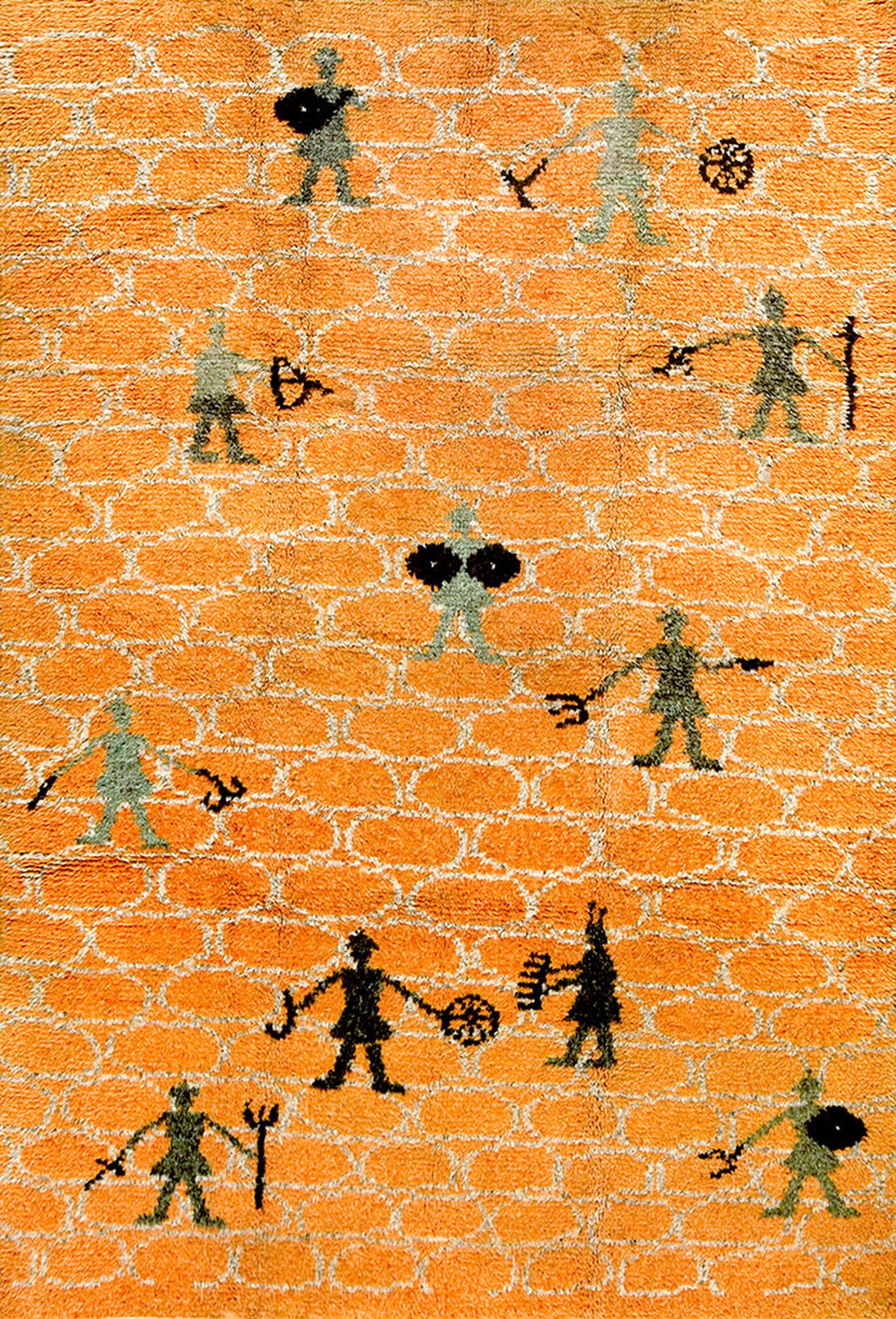 A subtle, repeating geometric grid pattern forms the foundation, upon which highly stylized, primitive figures are scattered. These abstract, dark silhouettes—some appearing to hold implements—create a playful yet mysterious rhythm across the surface, defining the unique charm of its allover rugs composition.