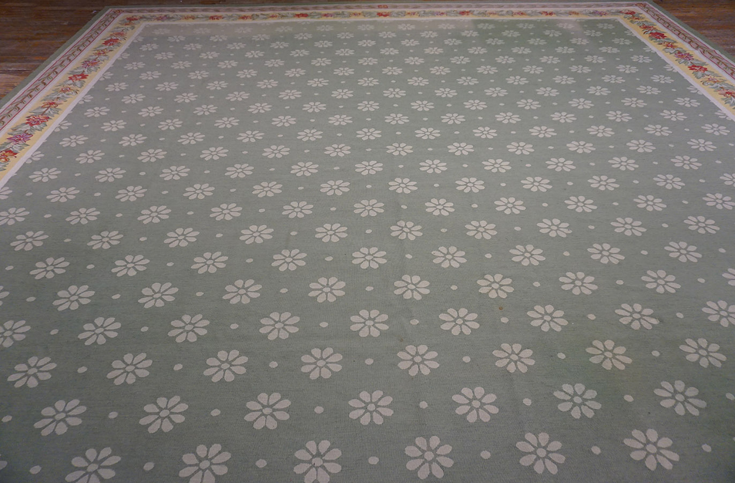 The field presents a soothing, muted sage tone, placing it squarely within the category of green color rugs. This soft backdrop is adorned with a delicate, repeating floral motif that ensures visual consistency across the entire surface without a dominant central medallion.