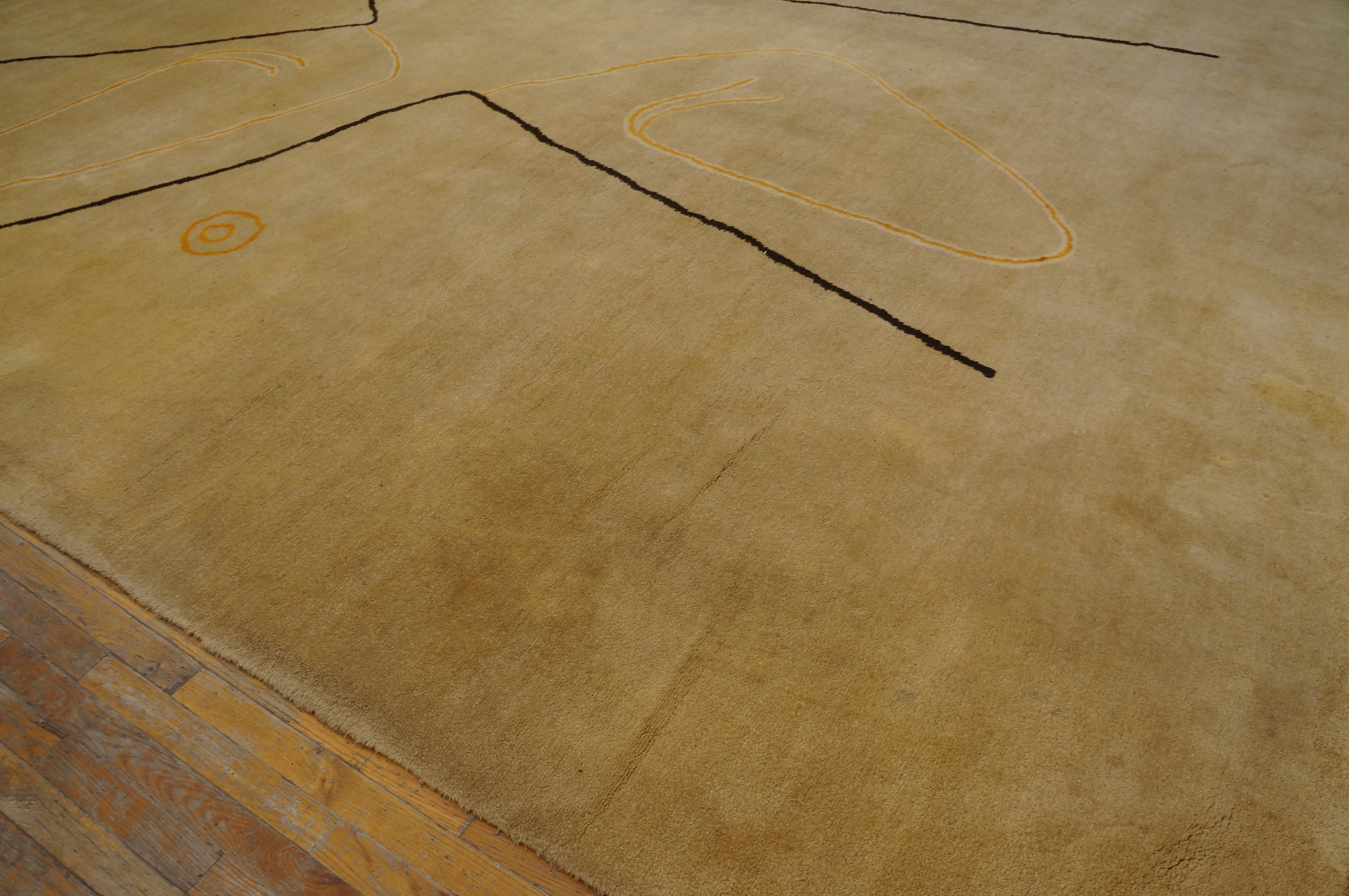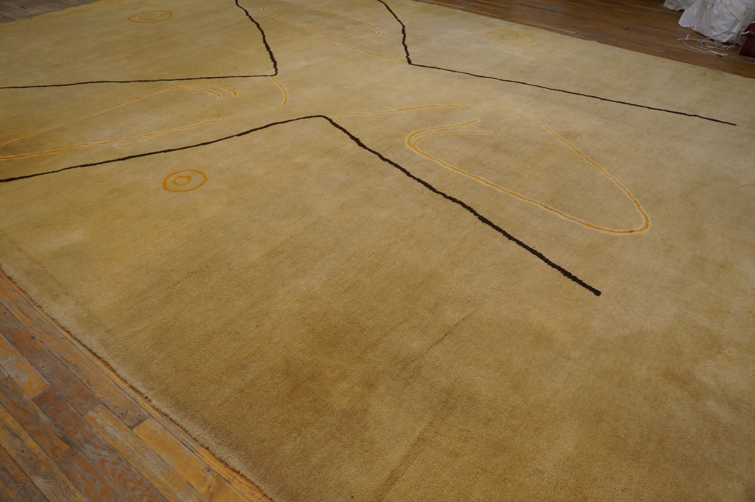The design is characterized by an allover pattern of spontaneous, calligraphic lines. Thick, dark strokes intersect with fluid, looping ochre elements, creating a dynamic composition reminiscent of abstract expressionism. As a prime example of vintage area rugs, this piece showcases how traditional weaving techniques adapted seamlessly to modernist sensibilities.
