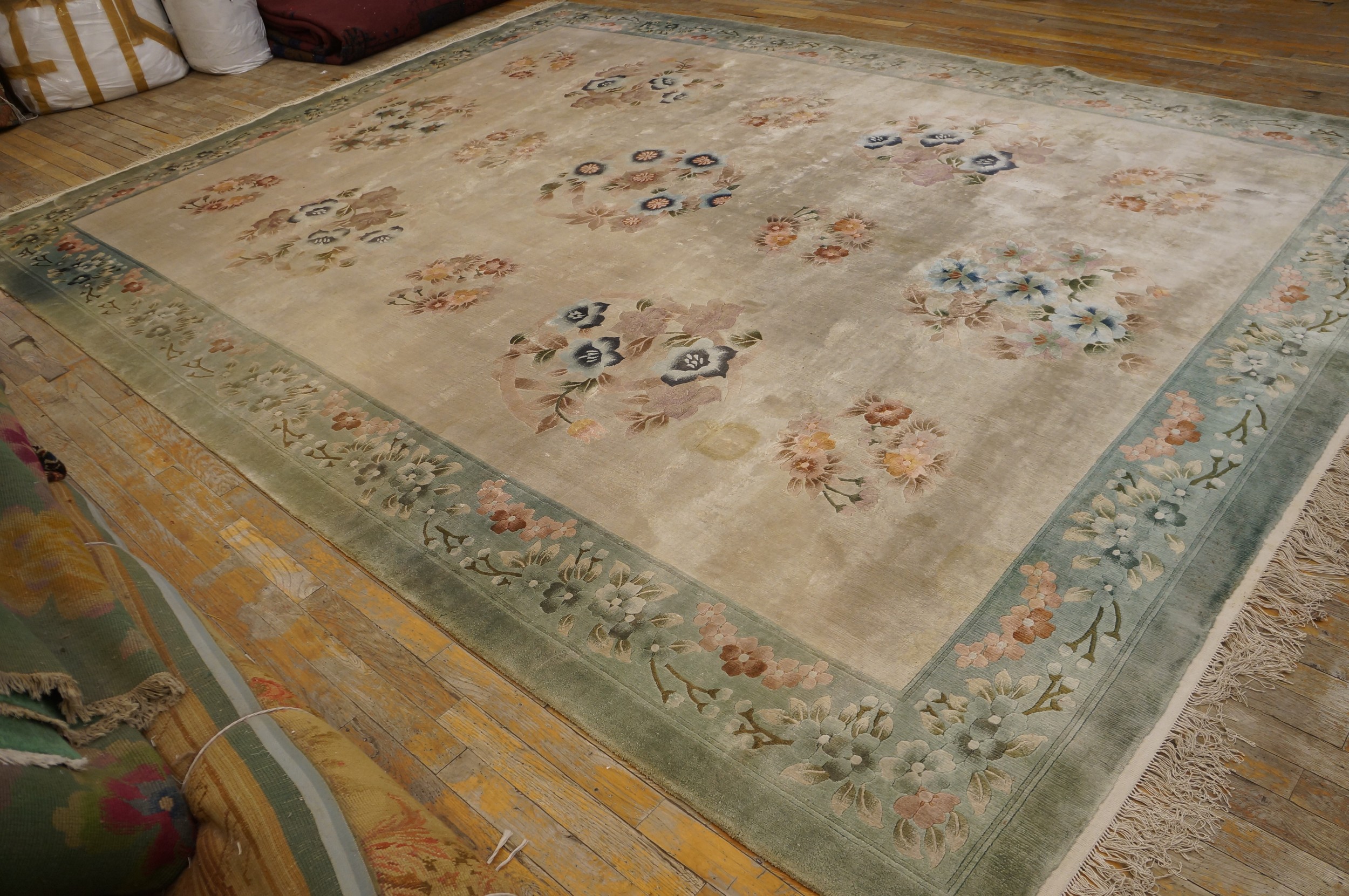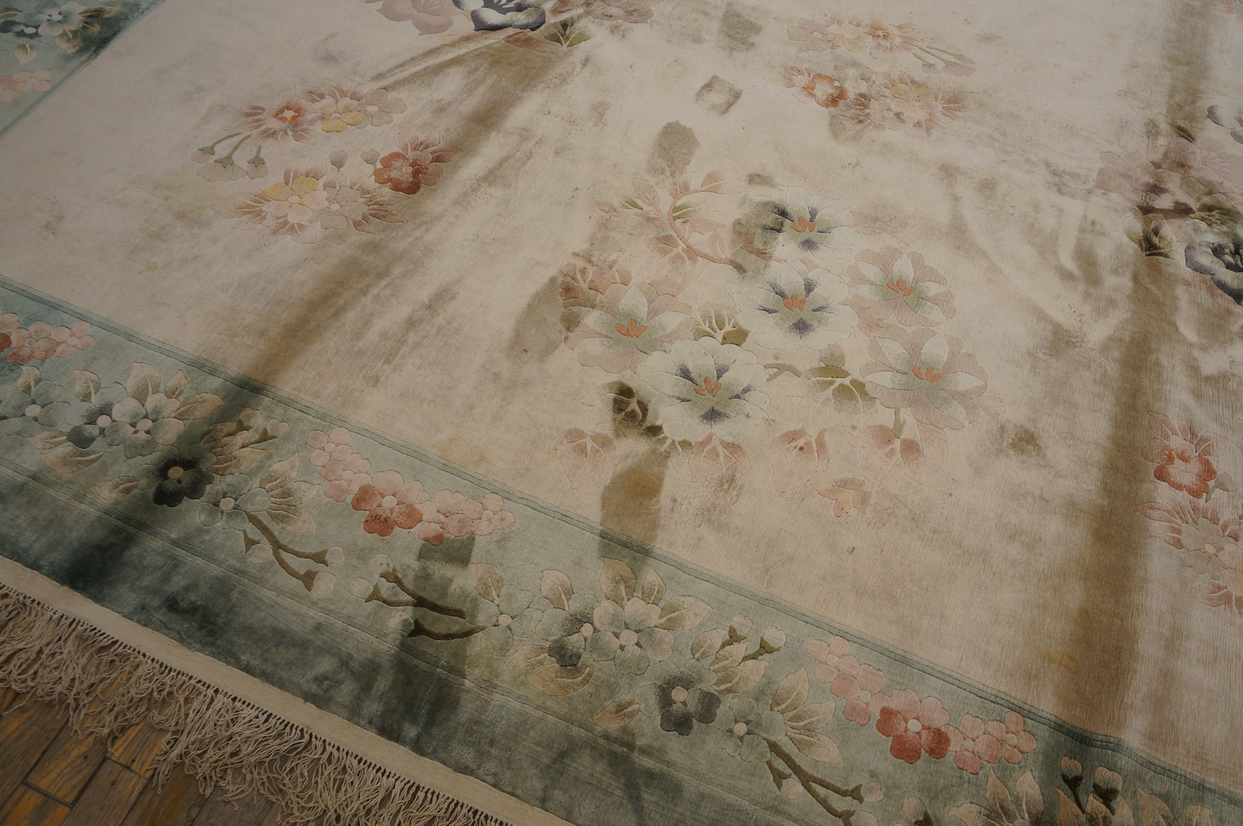 Vintage Silk Room Size Silk Ivory Rug, Circa Date: 1980s. This exquisite example of vintage area rugs showcases the finest quality silk construction, resulting in a luminous, low-pile surface that catches the light beautifully. The design is characterized by a sophisticated, open-field layout, typical of high-end Chinese production from this era.