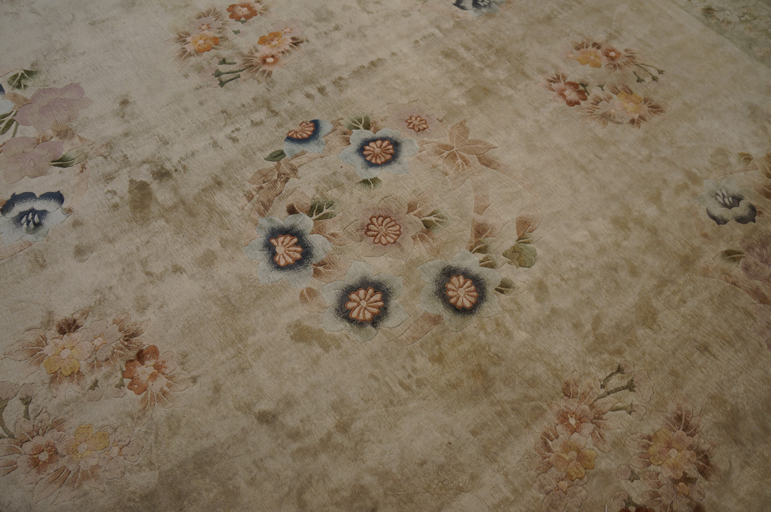 The expansive field is rendered in a delicate, shifting shade of ivory color, providing a neutral yet rich foundation for the scattered floral motifs. The subtle patina achieved through age enhances the silk’s natural luster, creating an almost painterly quality across the surface, softening the transition between the field and the primary elements.