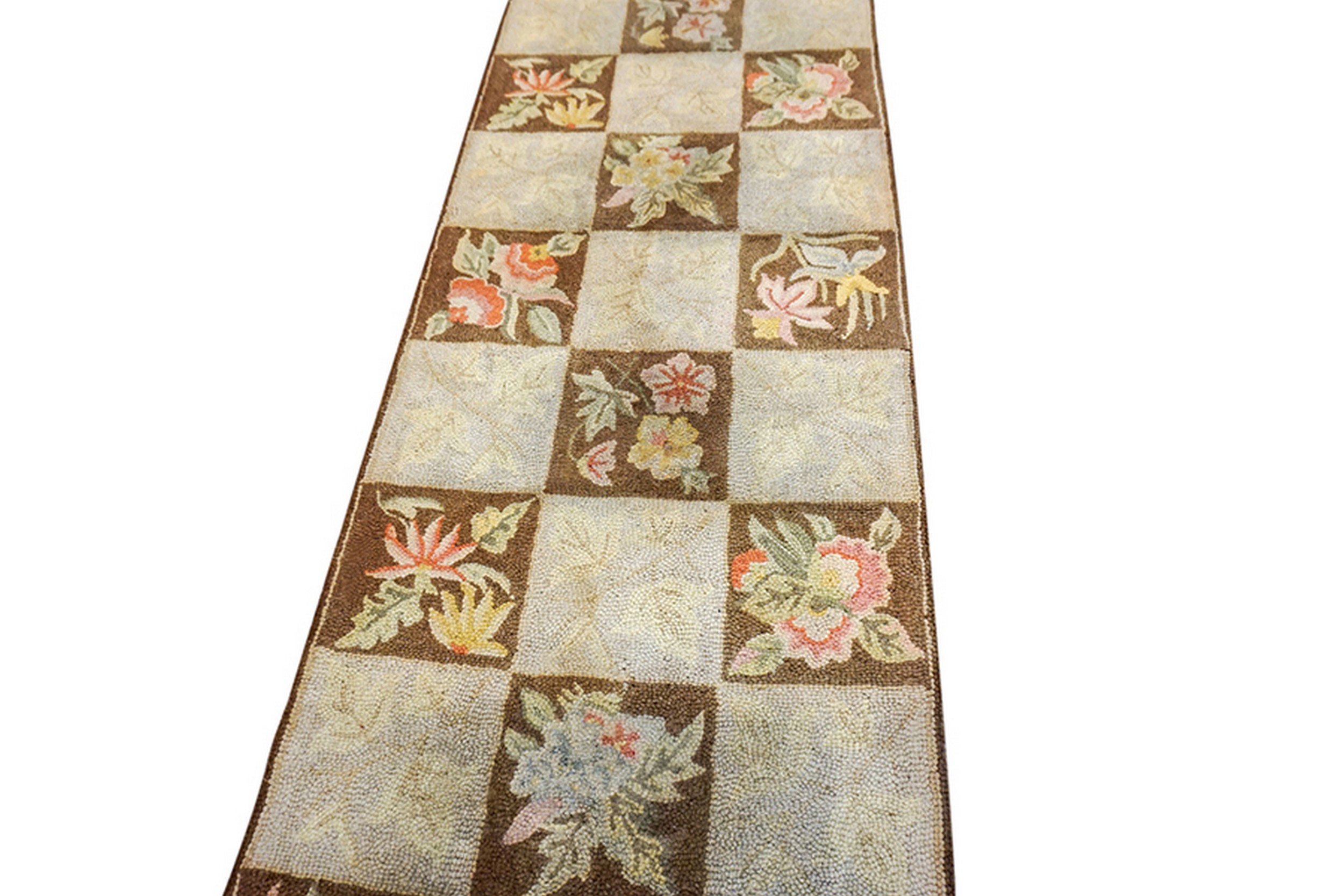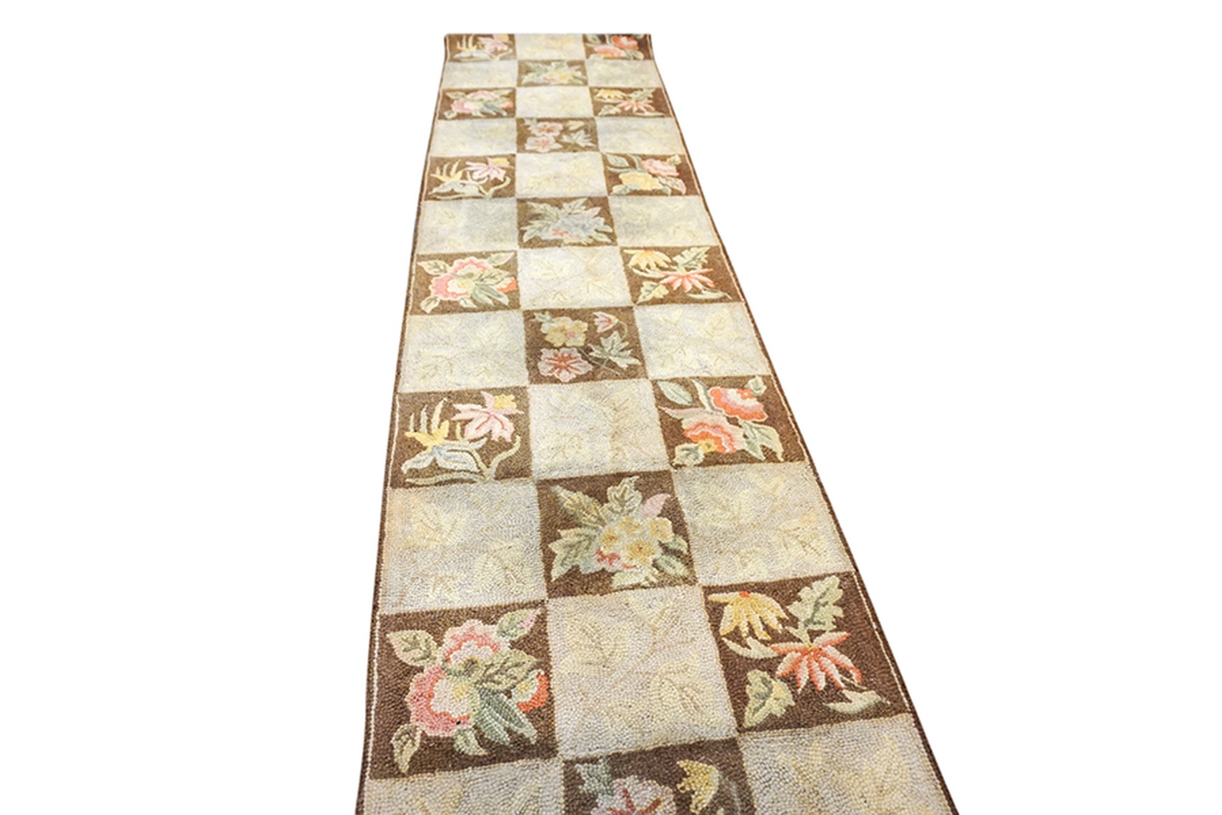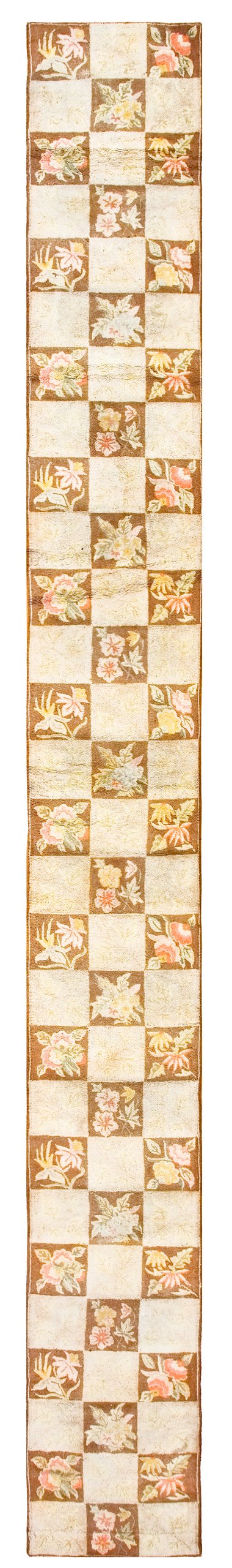 The borders act as a simple but necessary architectural frame, “locking in” the rhythmic energy of the repeating tiles and providing a sense of permanence. To possess this Vintage Checkerboard American Hooked runner is to own a monument to mid-century domestic ingenuity. It is a work that bridges the gap between the structured “Modernist” aesthetic and the warmth of traditional folk art—transforming a long hallway into a sanctuary of historical symmetry and soulful, botanical grace.