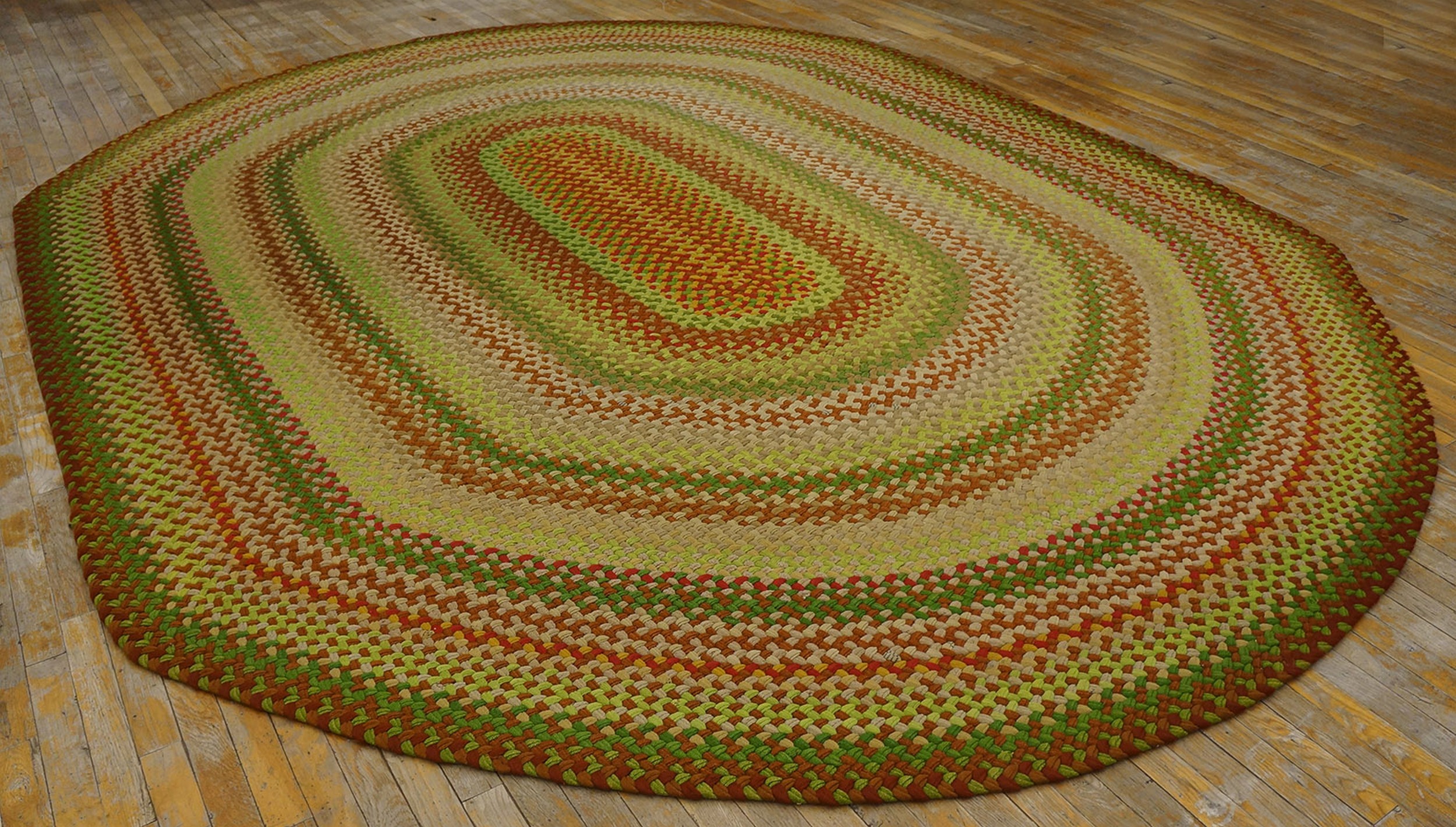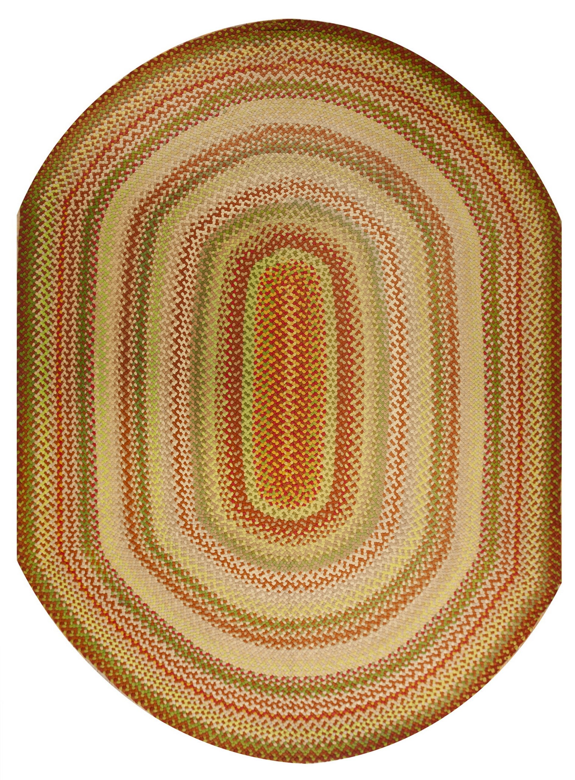 The palette is a sophisticated blend of autumnal hues, featuring concentric rings of deep terracotta, olive green, and muted gold, interspersed with creamy beige braids. This careful layering of tones achieves a vibrant yet grounded aesthetic, making it a true example of multicolor jewel tone rugs.
