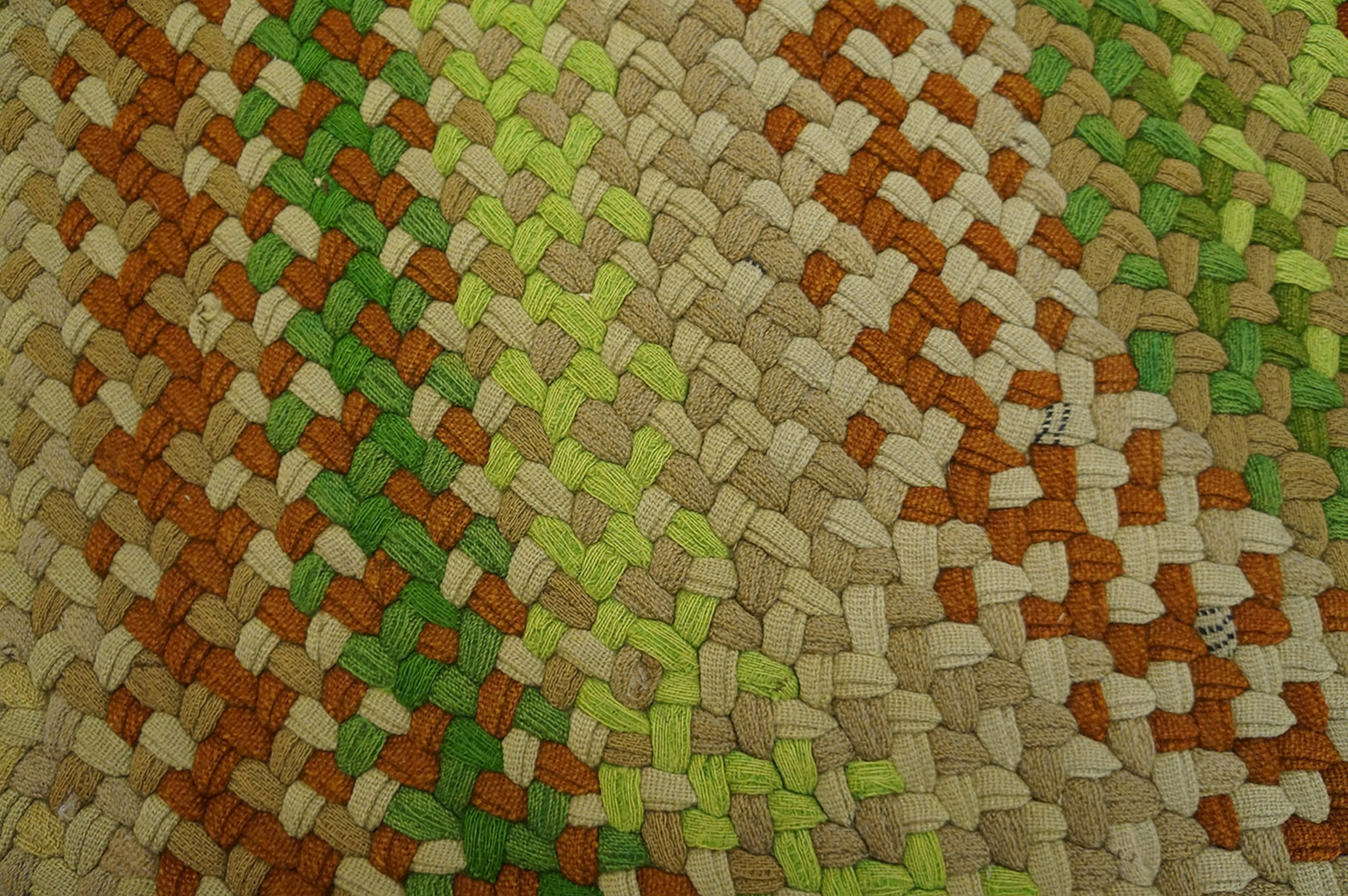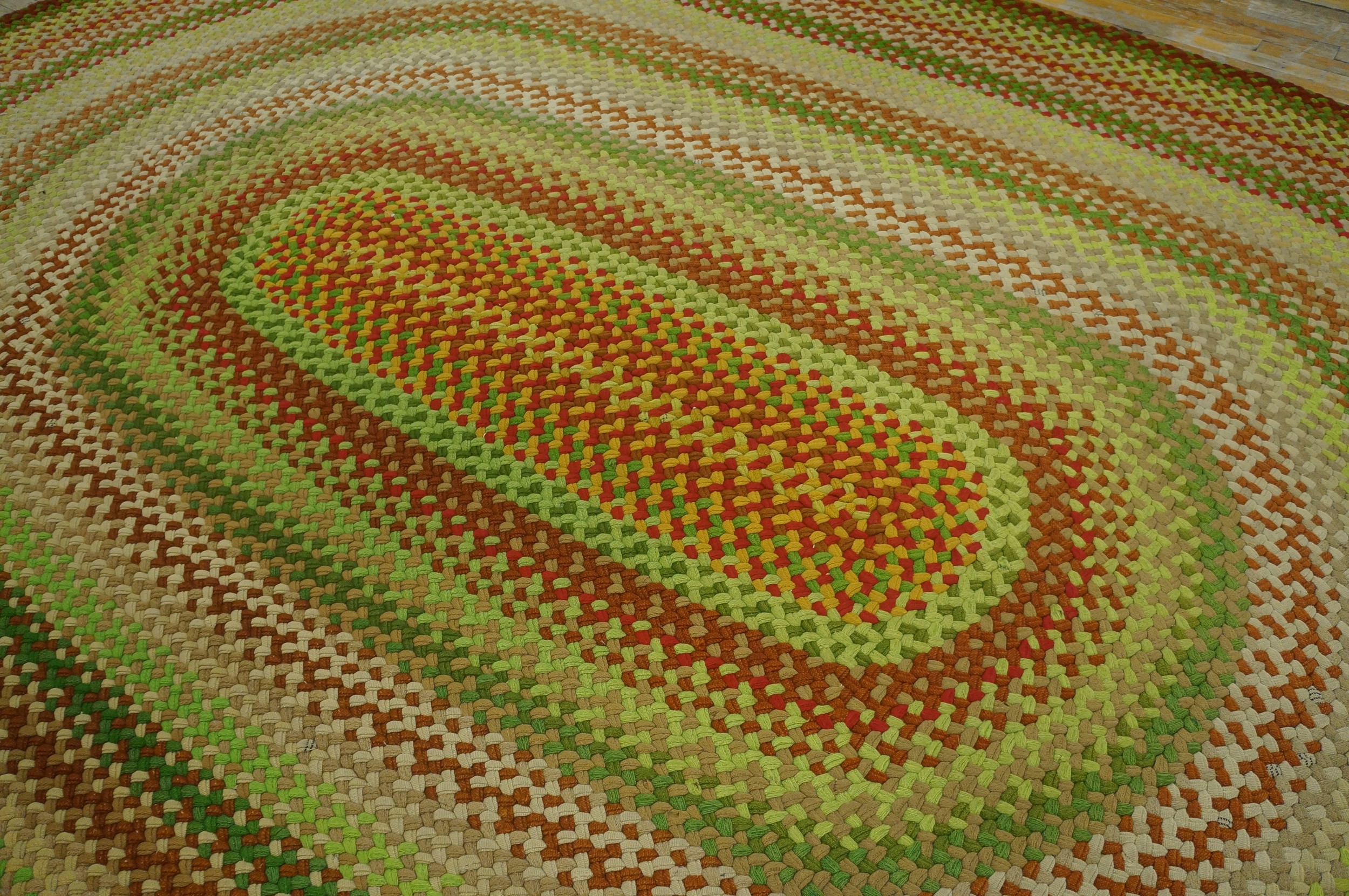 Vintage Braided Room Size Wool Multi Rug, Circa Date: 1950s. This exceptional piece captures the enduring charm of mid-century American textile artistry. Constructed entirely of durable wool, the braided technique creates a highly textural surface, ideal for high-traffic areas. We specialize in finding unique vintage area rugs from this period.