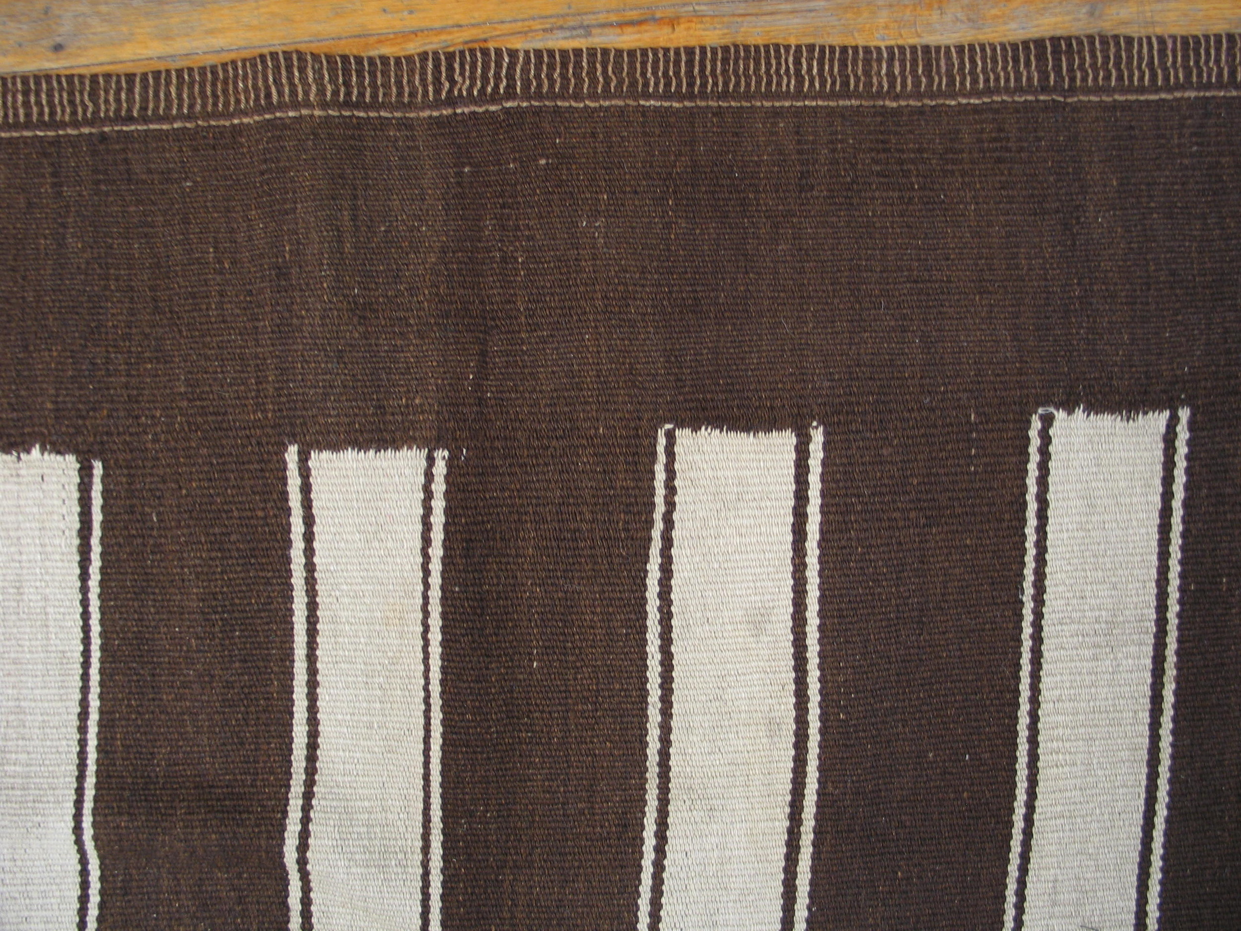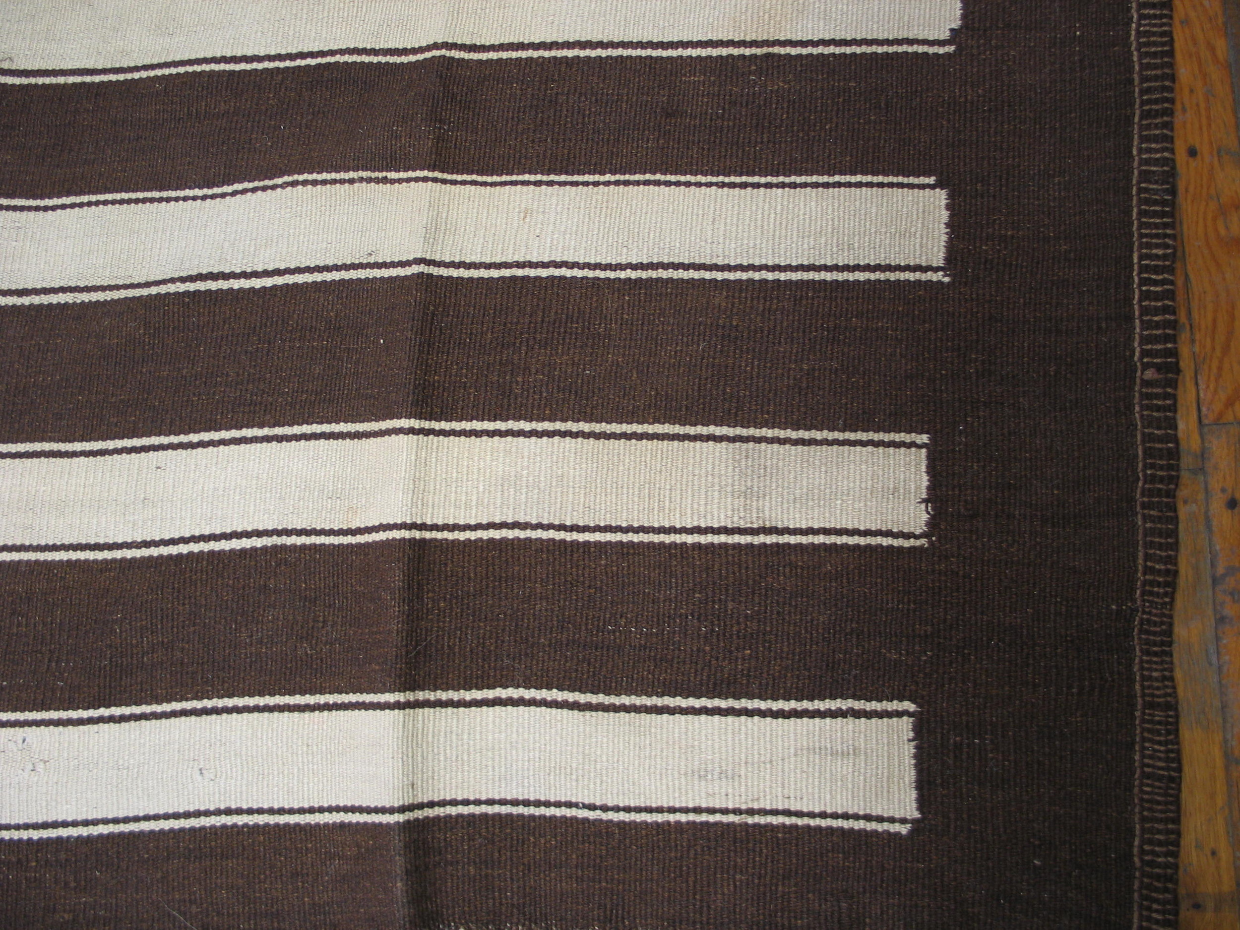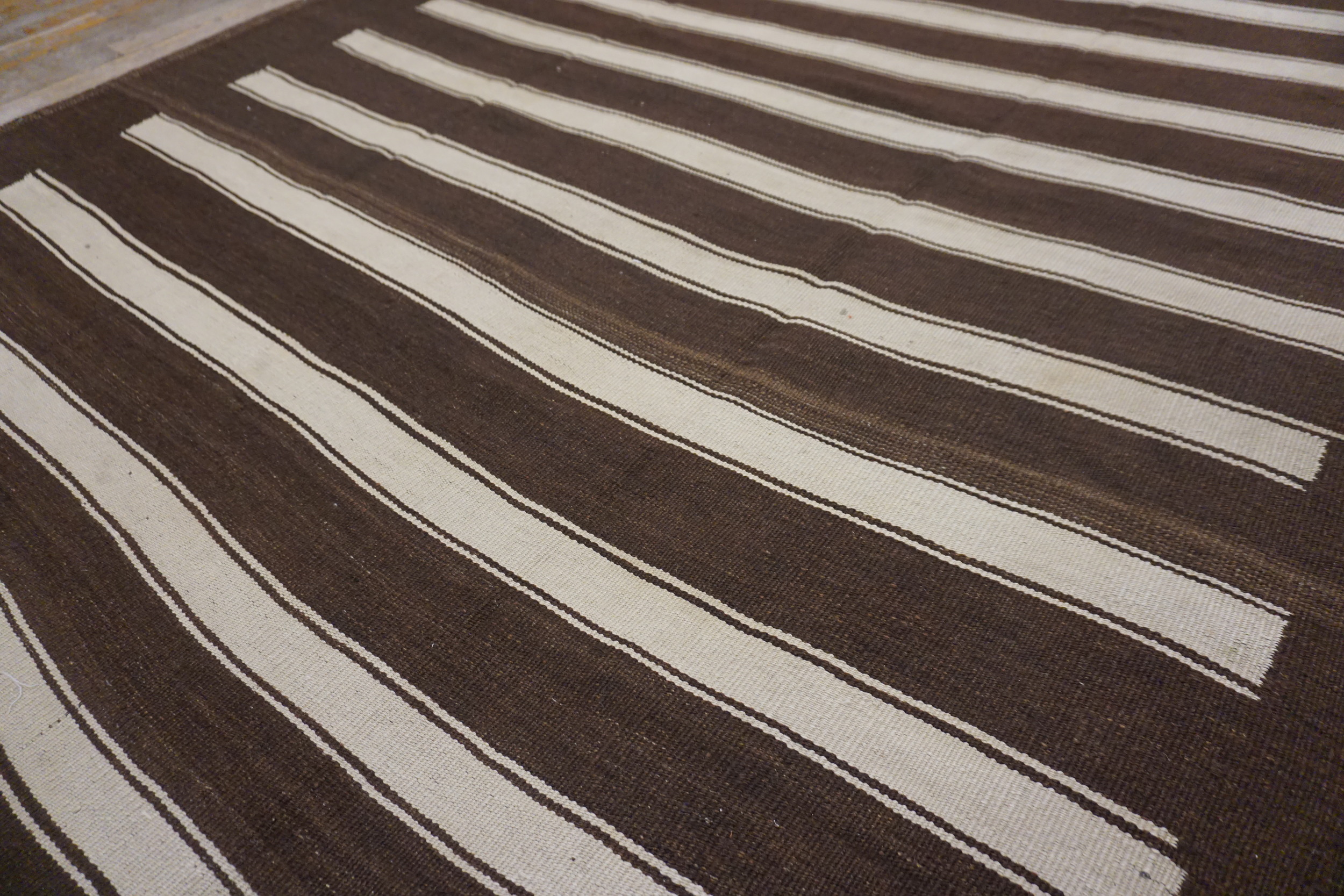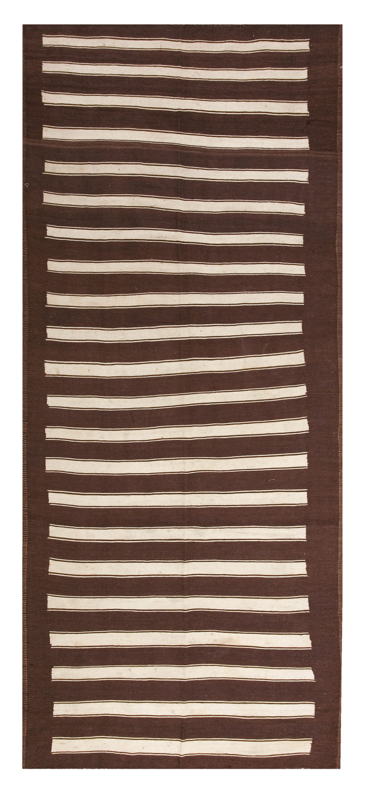 The design features wide, alternating bands of deep, saturated chocolate brown and creamy natural ivory. This highly graphic composition creates a rhythmic, linear flow across the entire field. The resulting pattern is classified among allover rugs, where the design repeats consistently without a central focal point, maximizing the perceived length of the textile.
