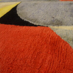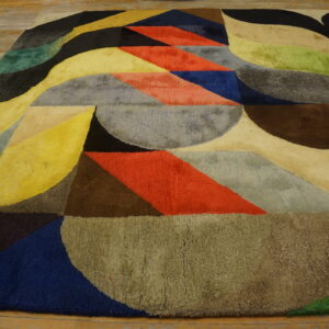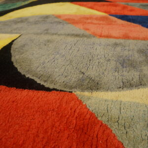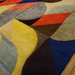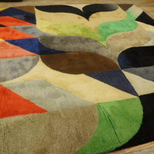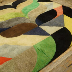 This striking carpet features a lively composition of curved and angular shapes arranged in a rhythmic modernist pattern. Rich jewel tones blend with earthy accents to create a balanced yet energetic color palette that brings warmth, depth, and movement to any room. The artistic layout draws the eye across the surface, making the rug both a functional floor covering and a visual centerpiece.