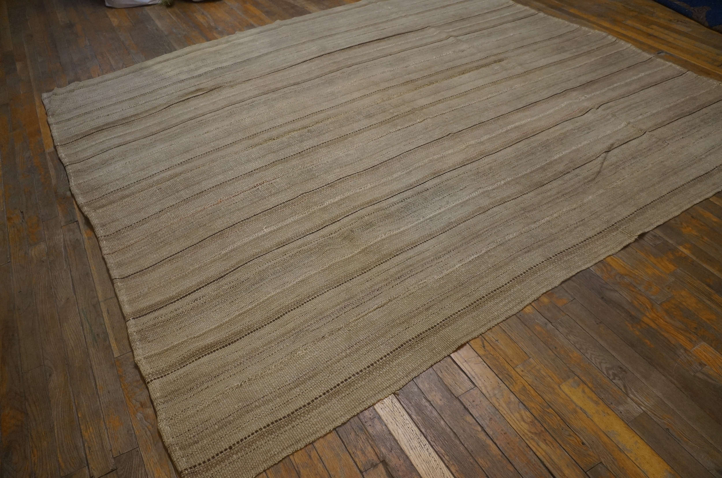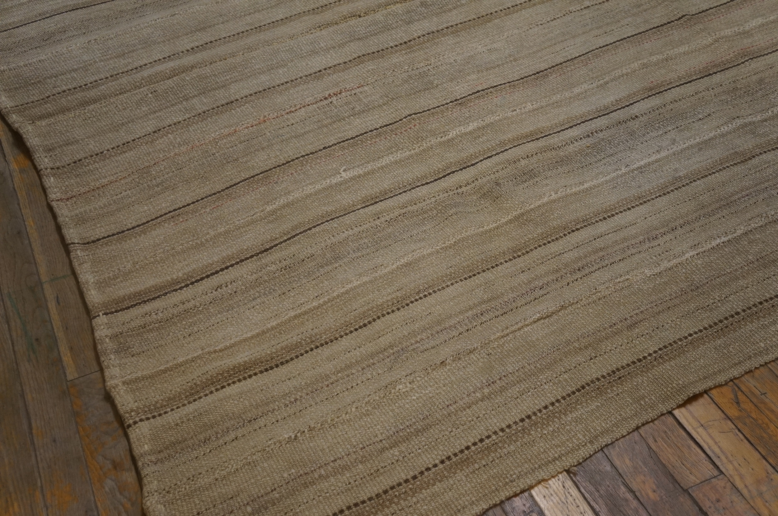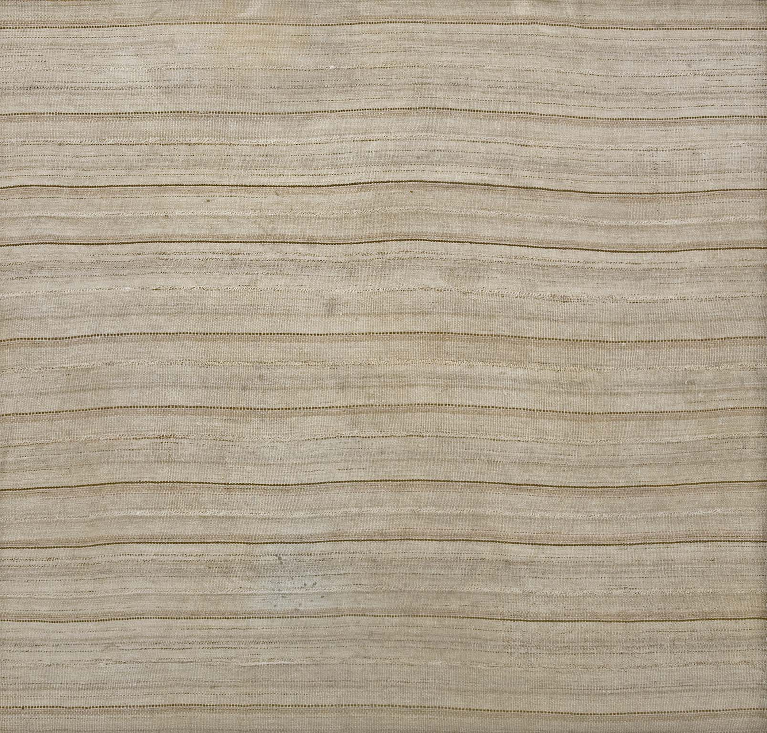 Constructed using the durable kilim technique, the surface presents a subtle, textural variation across the horizontal plane. The pattern is minimalist yet dynamic, utilizing the natural shift in wool tone to create an understated allover rugs design that relies on the integrity of the weave rather than complex geometry for its visual interest.