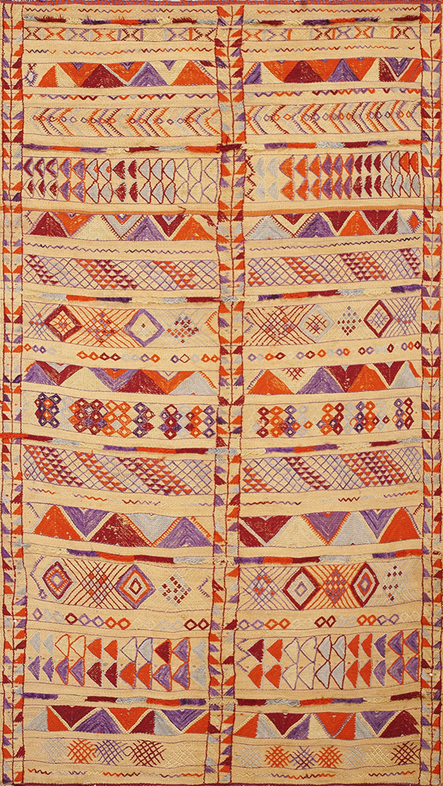 The palette centers on a soft, natural wool ground, providing a neutral canvas for the highly saturated, contrasting geometric motifs. Hues of deep crimson, fiery orange, and rich amethyst create a compelling interplay, classifying this as a stunning example of multicolor jewel tone rugs.