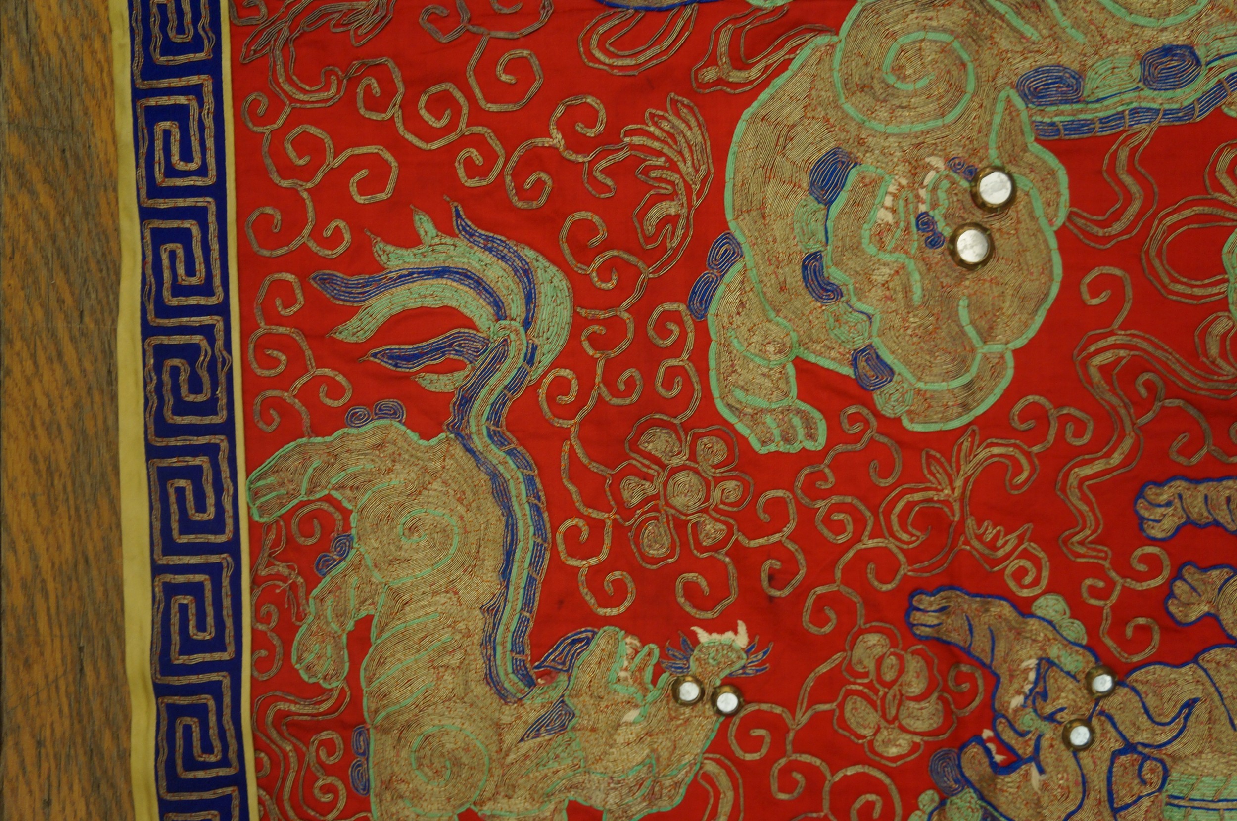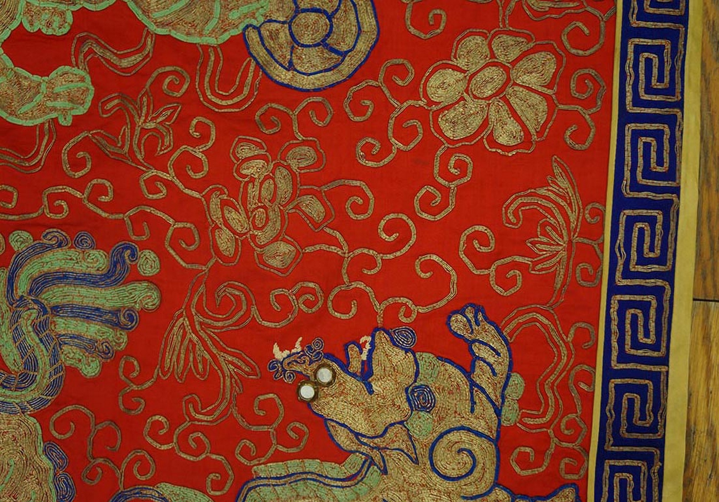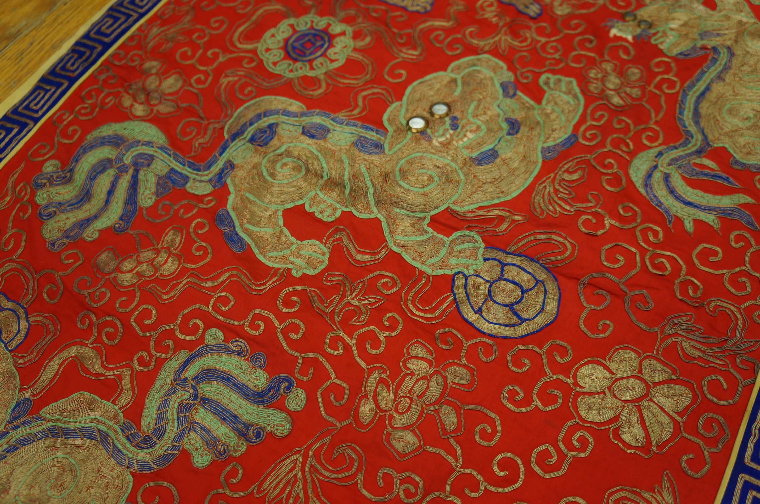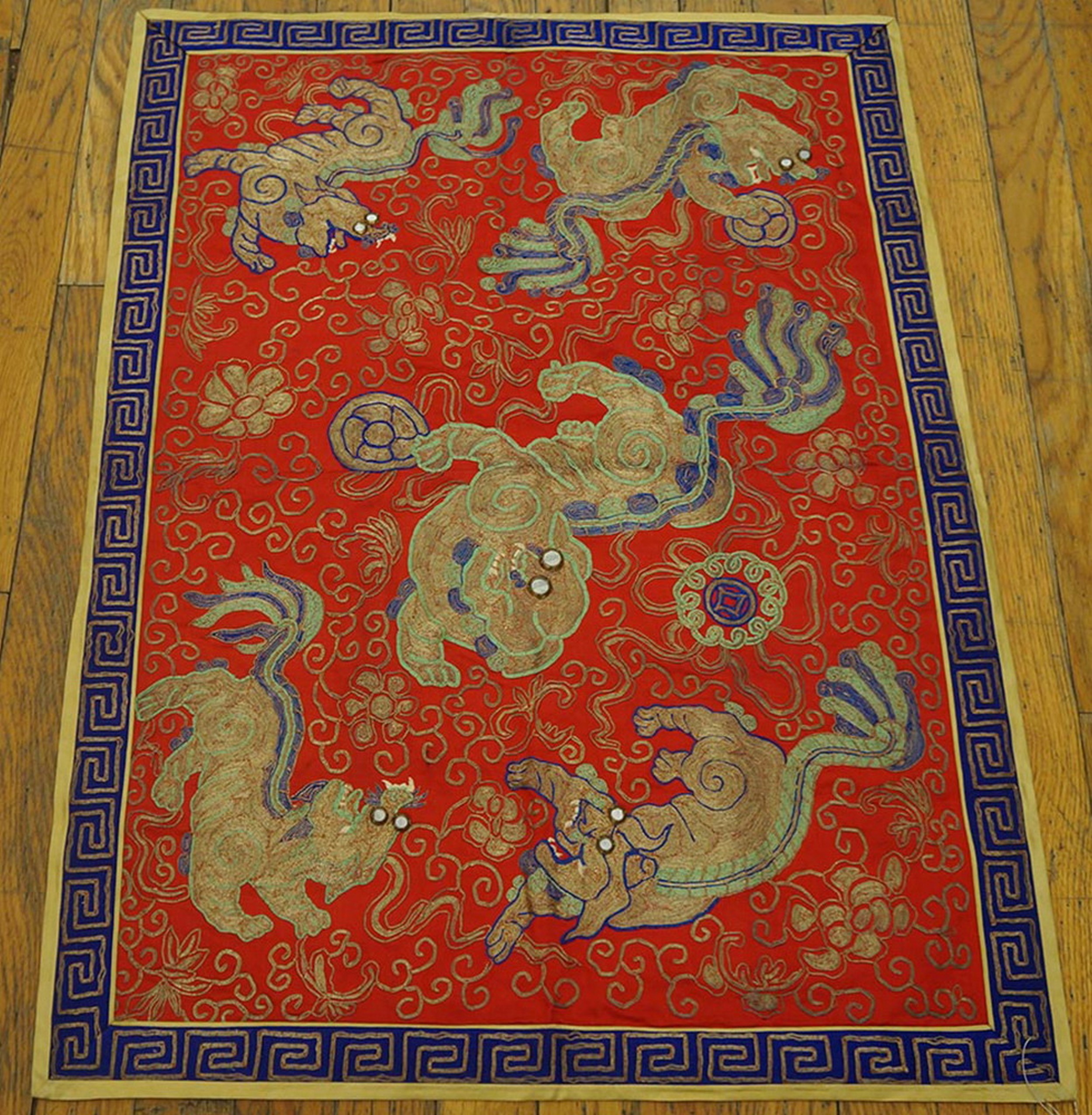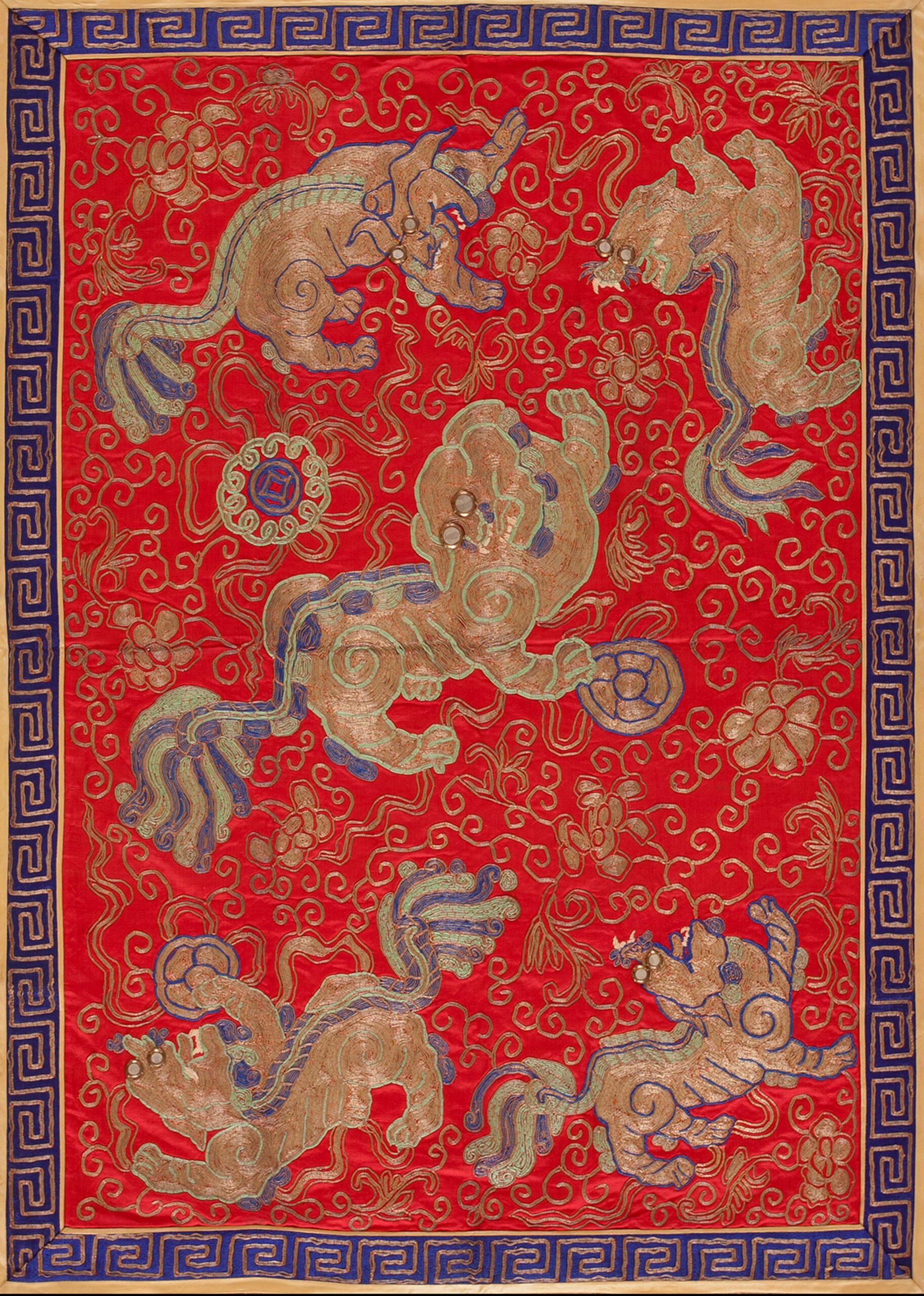 The central field features an allover pattern of stylized, dynamic Foo Dogs or celestial lions, executed in shimmering gold and tan thread, highlighted with subtle blue and pale green accents. This intricate needlework contrasts sharply with the deep, saturated ground, creating a powerful visual effect. The intensity of this specific rust red color immediately draws the eye, reflecting the boldness characteristic of Chinese textiles from this period.