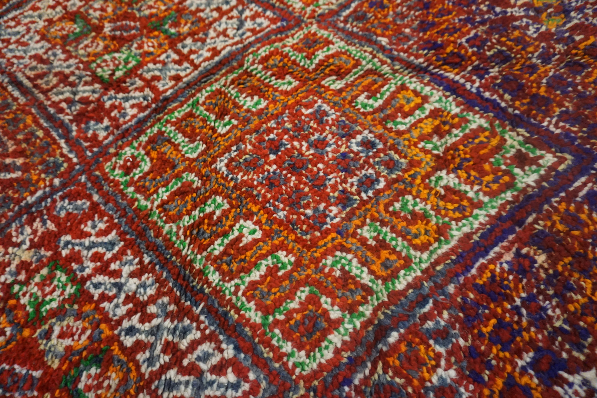 The field is dominated by a complex, repeating diamond lattice that creates a visually dynamic allover design. The dense, tightly packed motifs within each lozenge are rendered in a rich palette defined by saturated crimson and deep burgundy, highlighted by accents of saffron, indigo, and ivory. This geometric complexity is a hallmark of high-quality Morocco rugs.