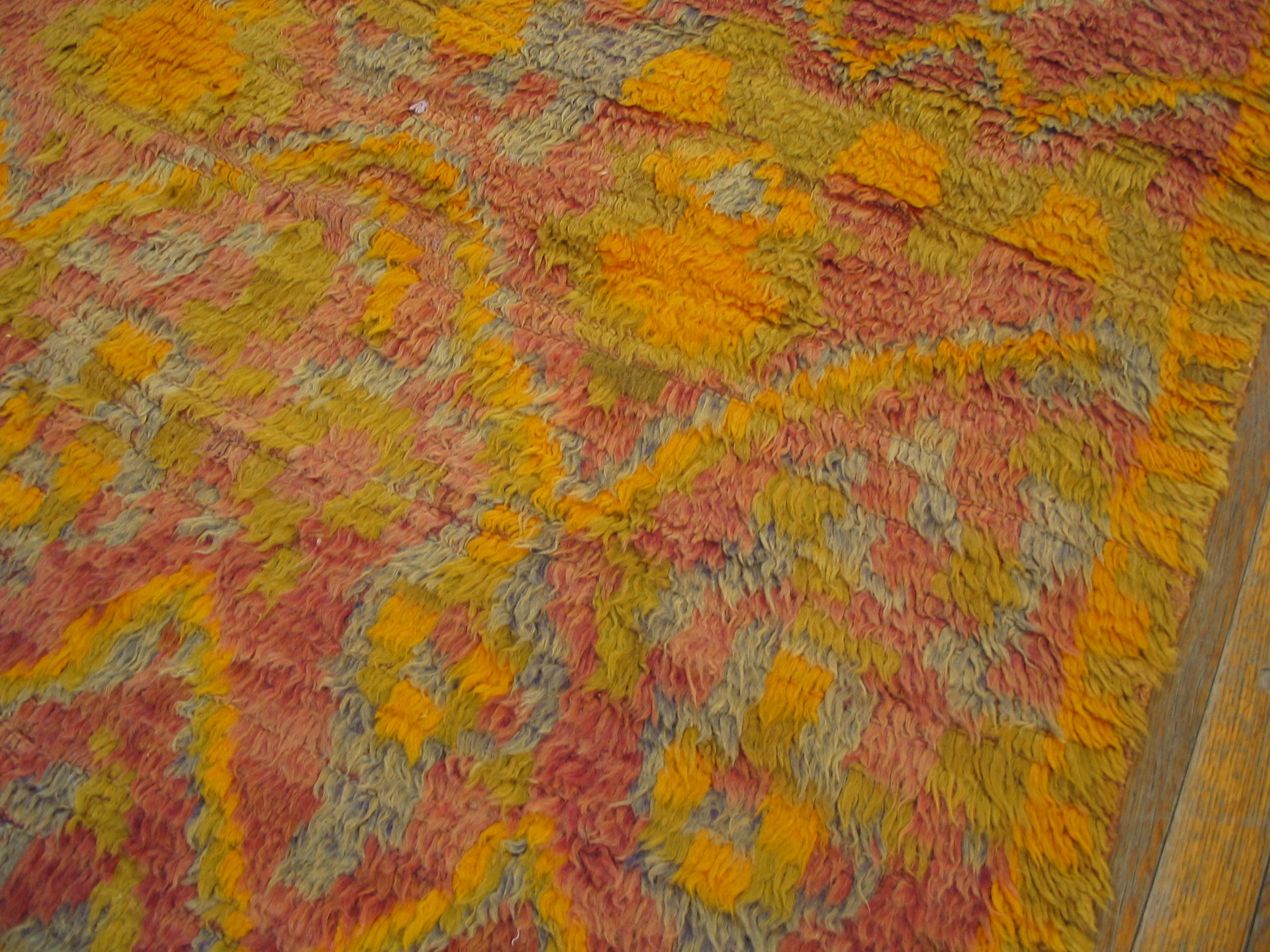 Antique Allover Geometric Wool Hand Knotted Pile Yellow / Gold Orange 1940s Berber Carpet, Circa Date: 1940s. This exceptional example of mid-century textile art offers a vibrant yet sophisticated palette, characteristic of the period’s departure from classical designs. The dense, hand-knotted wool pile ensures a luxurious texture, making it a desirable piece among antique rugs.