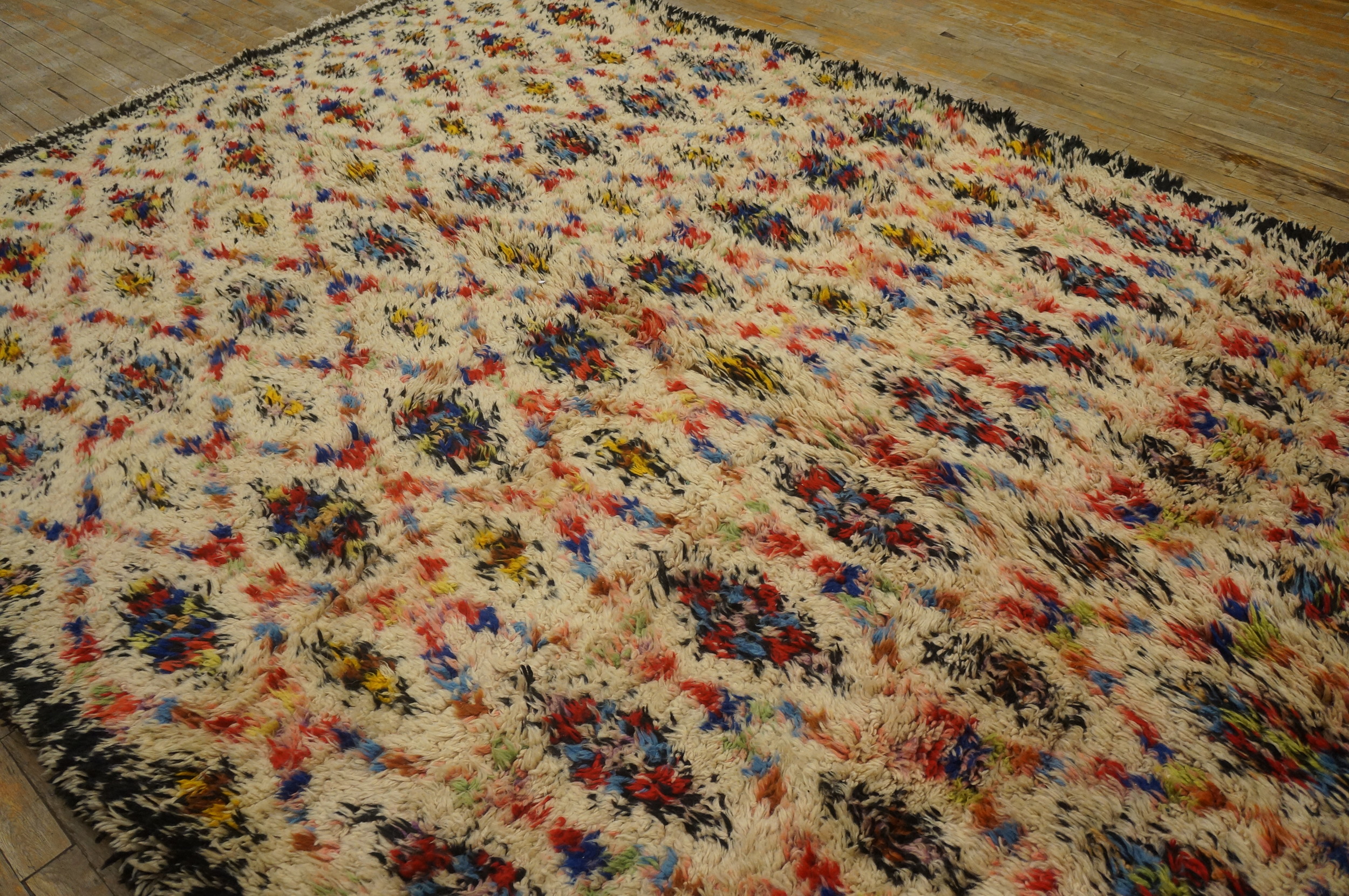 Vintage Moroccan – Rabat Moroccan Ivory 1960s Rug, Circa Date: 1960s. This exceptional example of mid-century textile art belongs to our curated collection of vintage area rugs, showcasing the vibrant, abstract aesthetic popular during the post-war era.