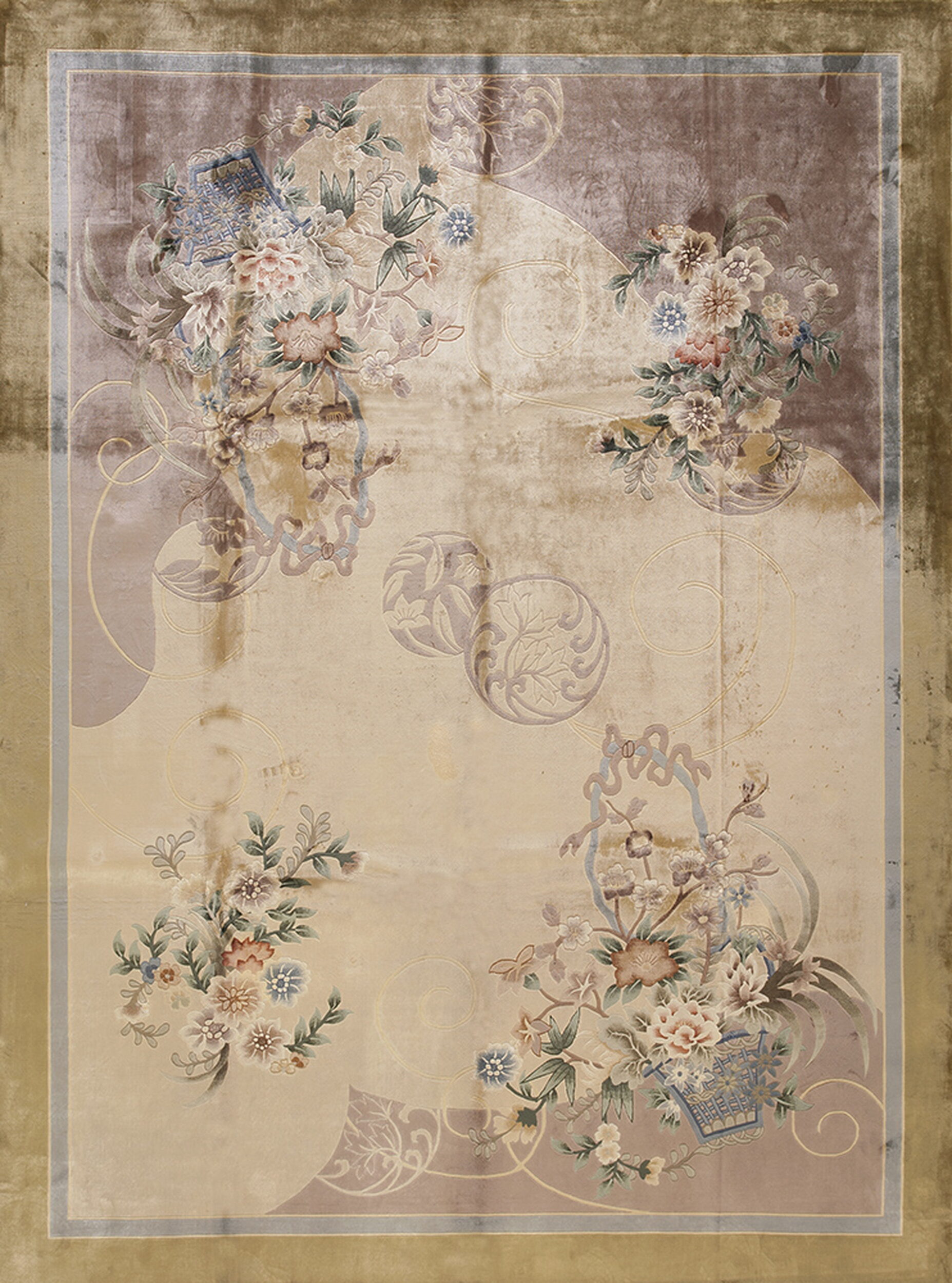 The central field is dominated by elegantly rendered bouquets, placed strategically in the corners and along the vertical axis. These stylized floral rugs motifs, featuring peonies and delicate blossoms emerging from woven baskets, are masterfully executed, contrasting the raised pile texture against the flat, shimmering background.