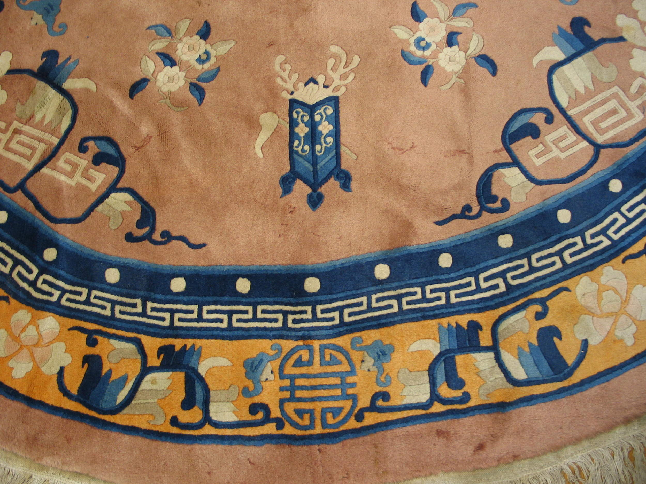 Vintage Chinese – Peking Chinese 1980s Rug, Country of Origin: China, Circa Date: 1980s. This exquisite circular piece exemplifies the refined aesthetic of Chinese rugs produced during this era. The field is dominated by a soft, muted rose tone, providing a sophisticated backdrop for the highly stylized motifs rendered in deep indigo and pale ivory.