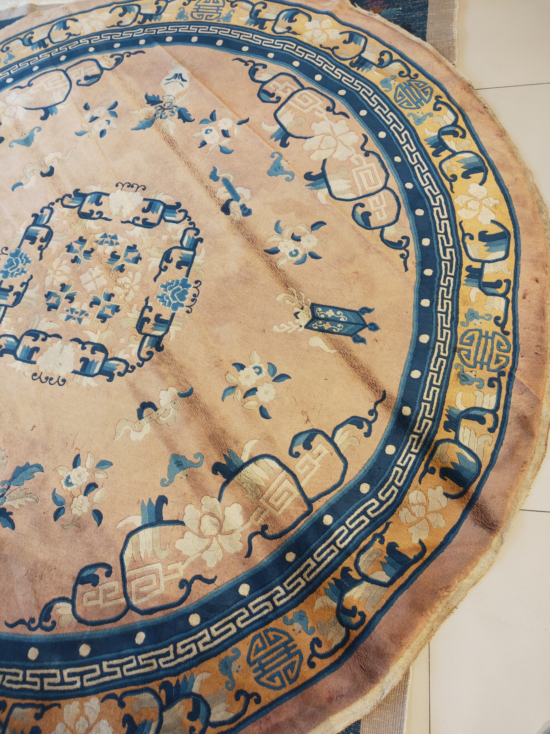 As a fine example of vintage area rugs, this piece showcases excellent craftsmanship typical of 20th-century Chinese weaving. The circular format is particularly desirable, offering a unique architectural accent that defines a space without relying on traditional rectangular boundaries.