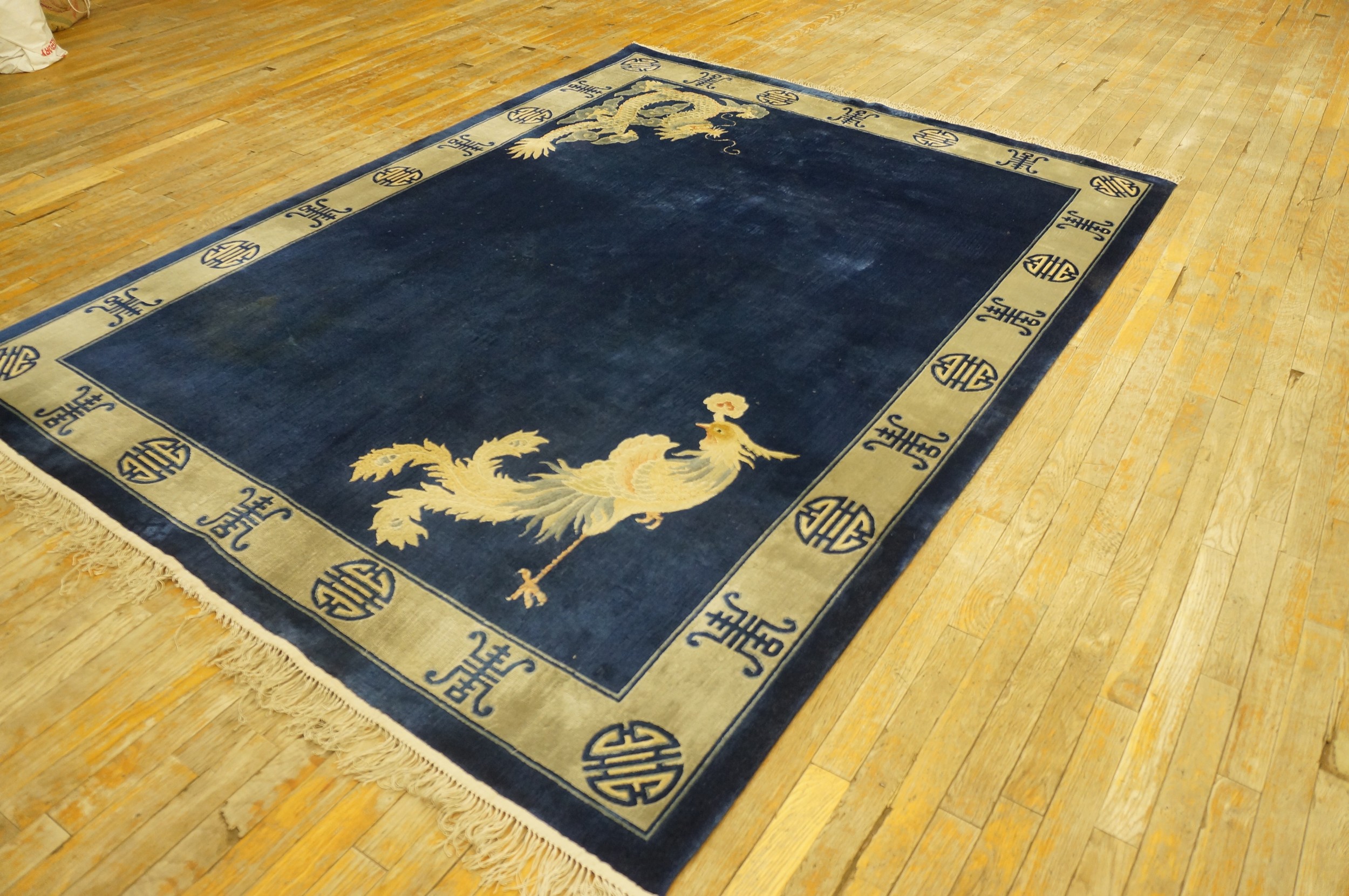 A broad, contrasting border frames the central design, featuring repeating Shou symbols—representing longevity and good fortune—in dark blue against a distressed gold ground. While produced in the 1980s, the design draws heavily upon the Art Deco Chinese styles of the 1920s, making it a sophisticated addition to our collection of vintage area rugs.