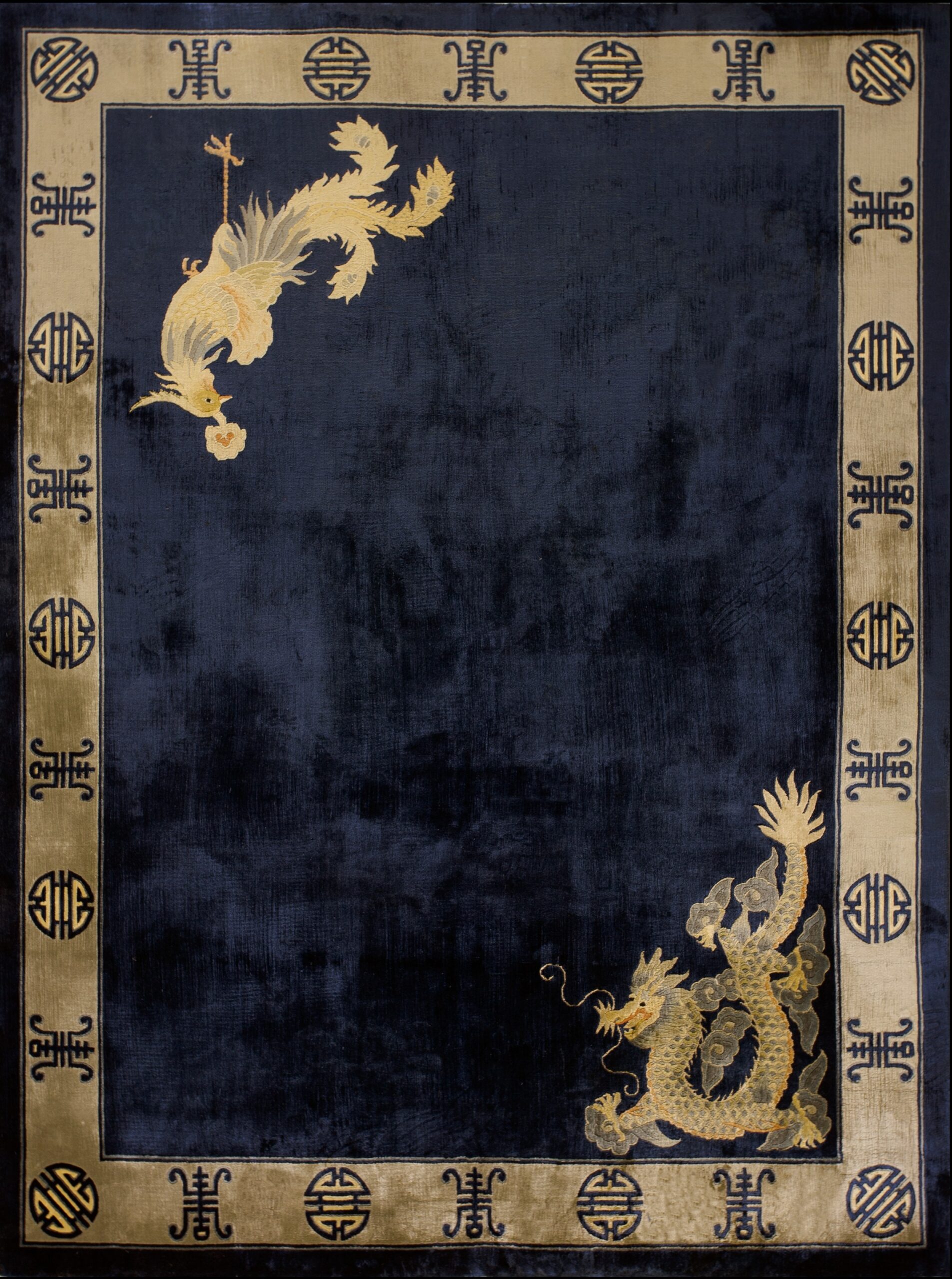 The field is masterfully adorned with classical Chinese iconography: a powerful, stylized dragon and a graceful phoenix, rendered in shimmering gold and pale tan silk. These opposing yet complementary mythical creatures symbolize balance, prosperity, and harmony, executed with a precision that highlights the luxurious sheen of the silk pile against the dense wool foundation.