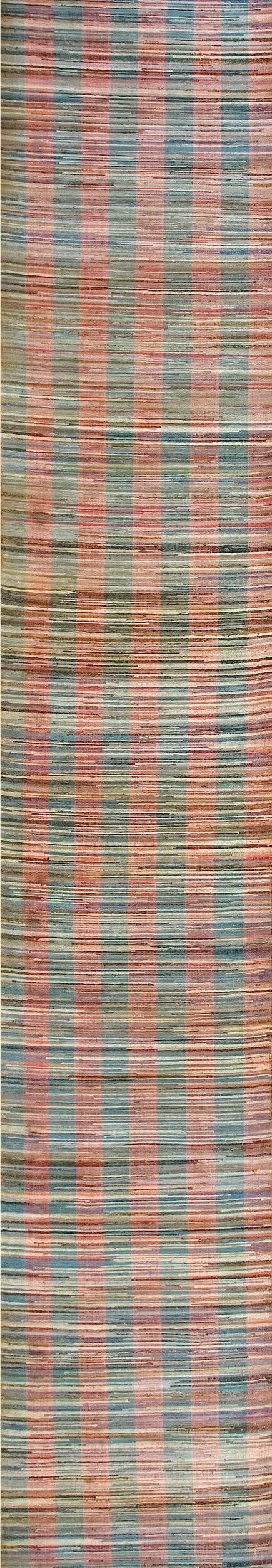 The design features a simple yet dynamic vertical stripe configuration, rendered in a palette of faded rose, muted teal, and soft cream. This effective use of color creates an allover pattern that is both grounding and visually engaging, avoiding the need for complex medallions or formal borders. The inherent irregularity of the woven rags adds depth and a unique, tactile quality to the textile.
