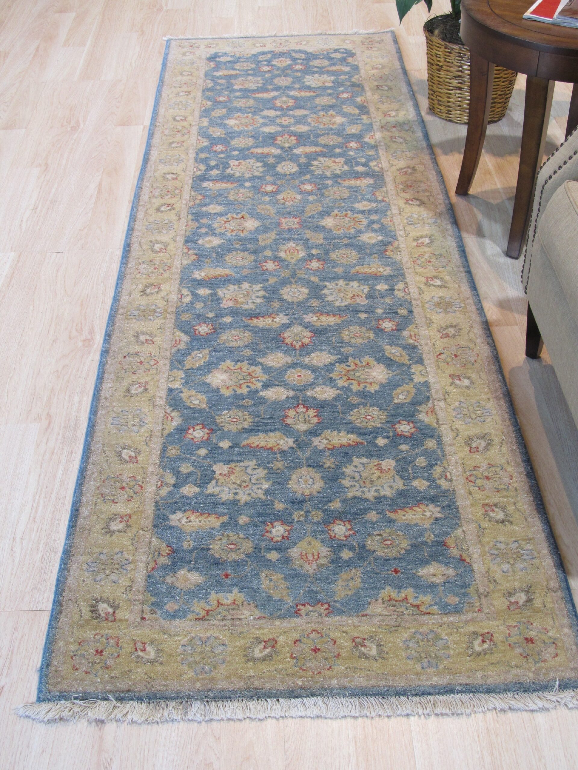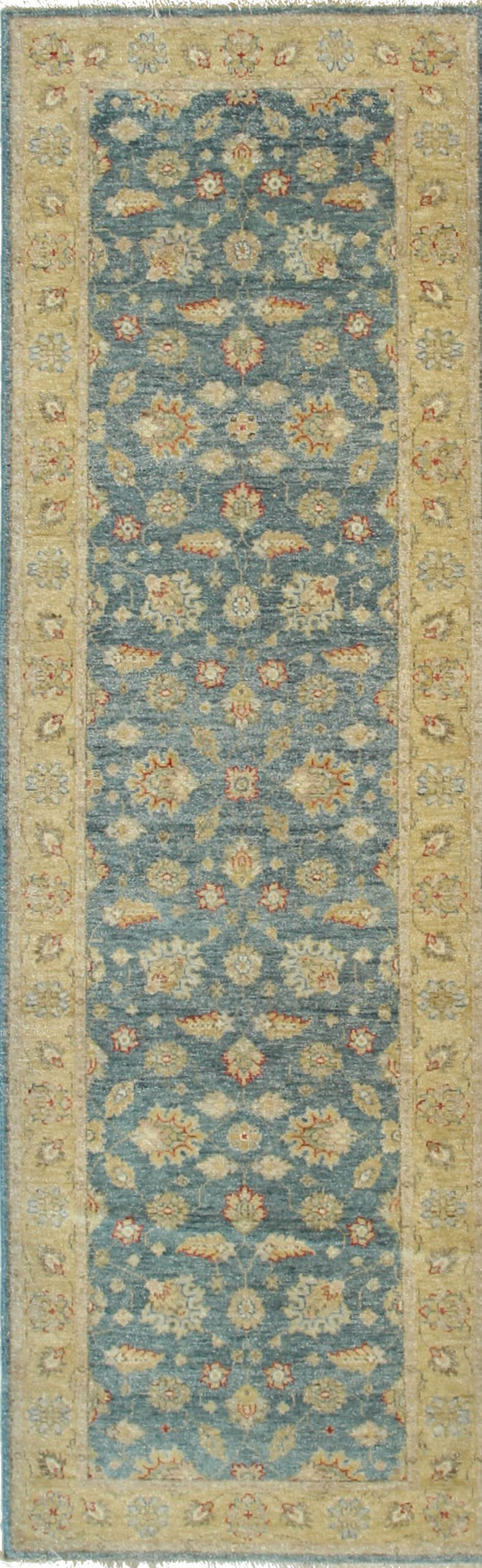 The central field presents a captivating, muted slate or dusty blue, a hue that provides a grounding backdrop for the intricate, repeating floral pattern. This careful selection of color ensures the rug harmonizes beautifully with both antique furnishings and modern interiors, distinguishing it among other blue color rugs.