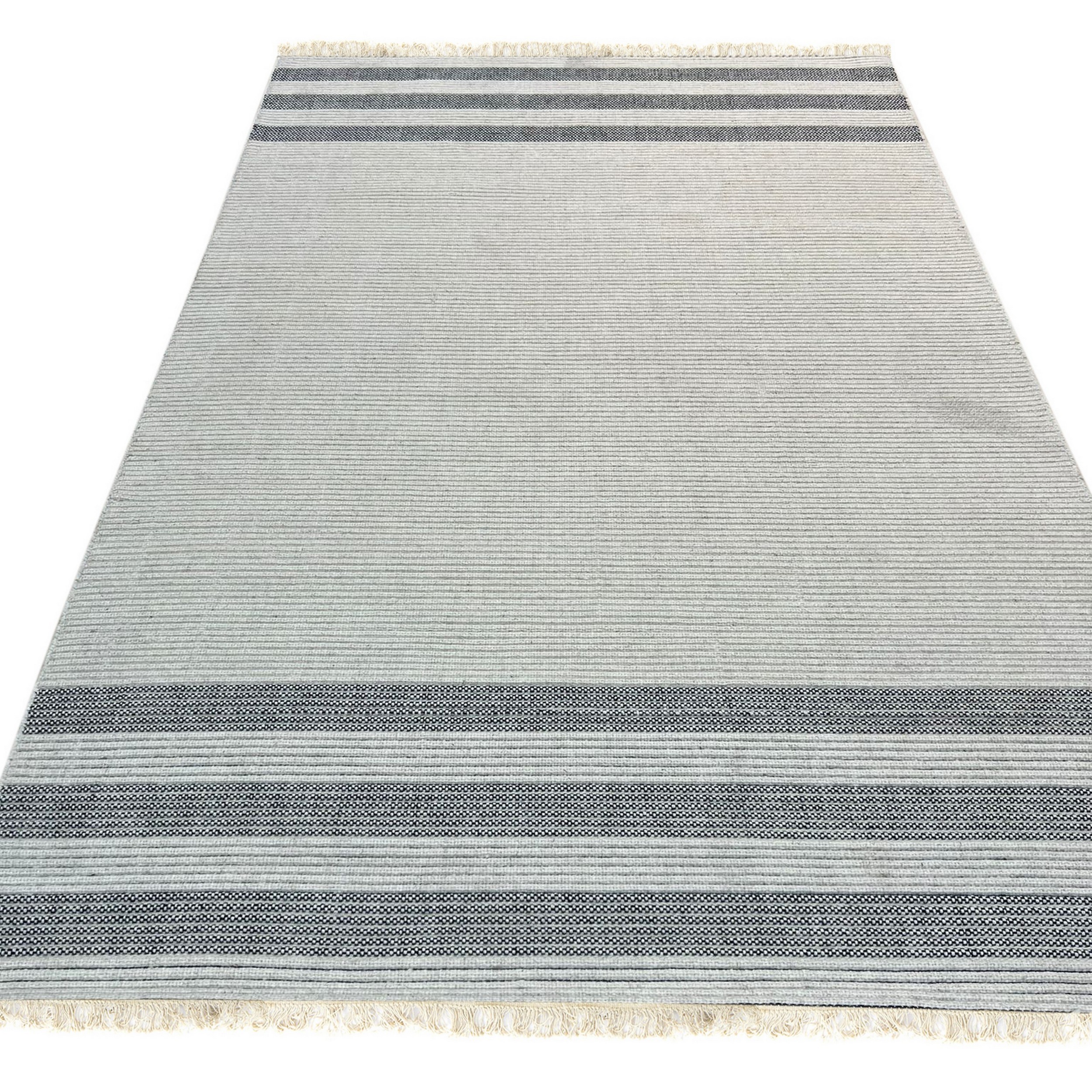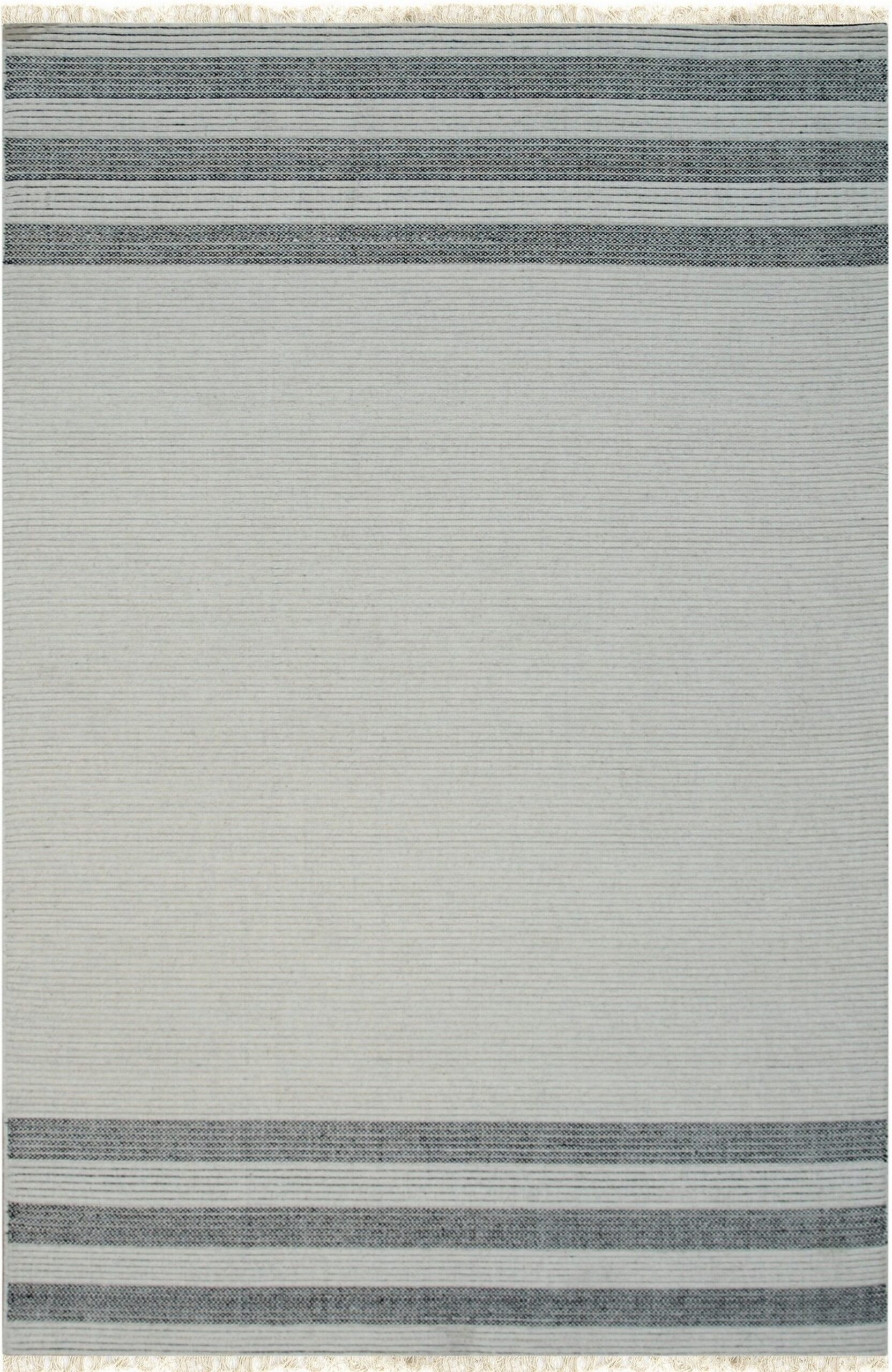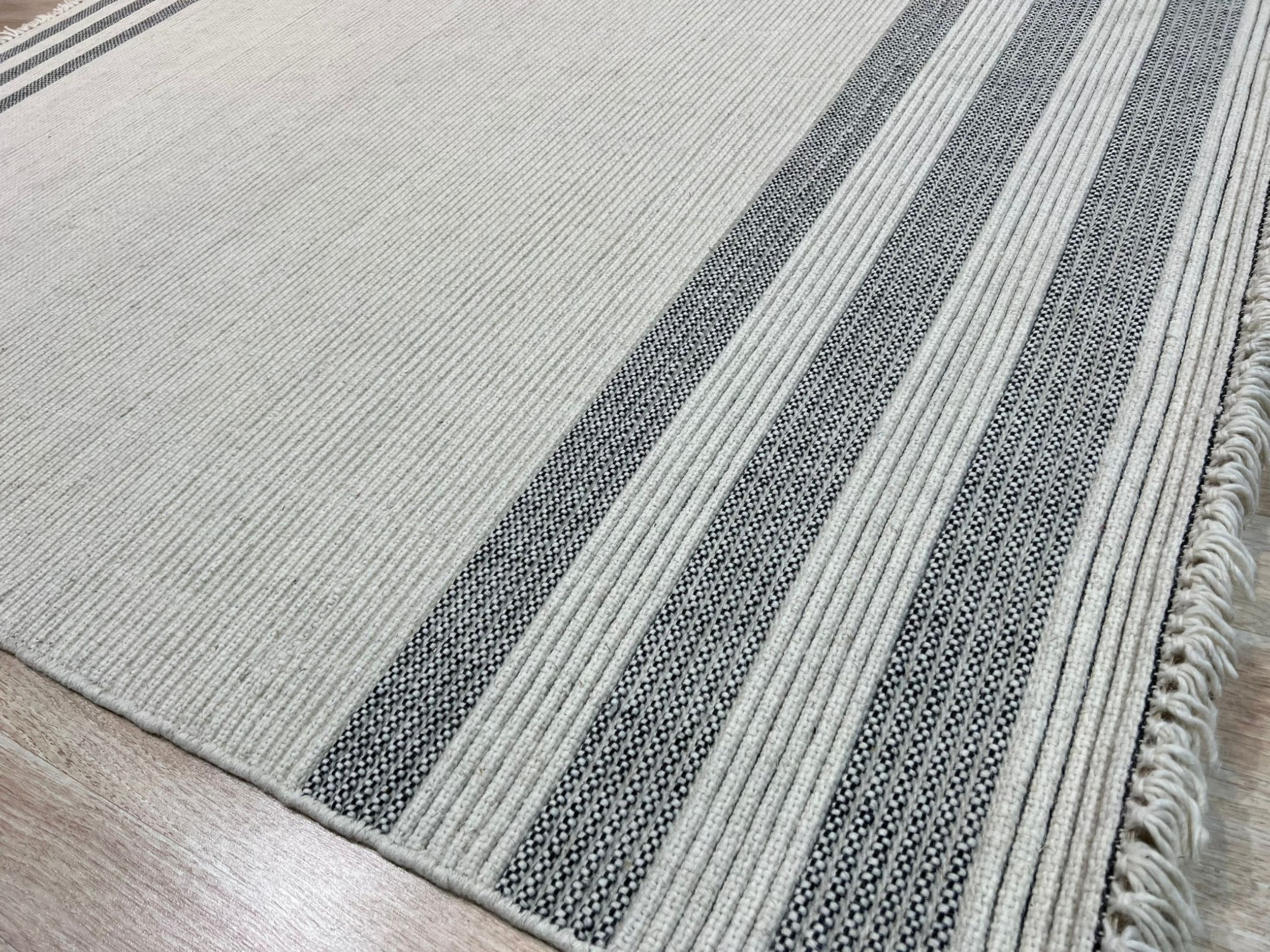 Defined by thin, charcoal-grey bands at either end, the design maintains strict geometric restraint. Its low pile and durable construction make it suitable for high-traffic areas, including kitchens, entryways, or as one of our sophisticated hallway runner rugs.