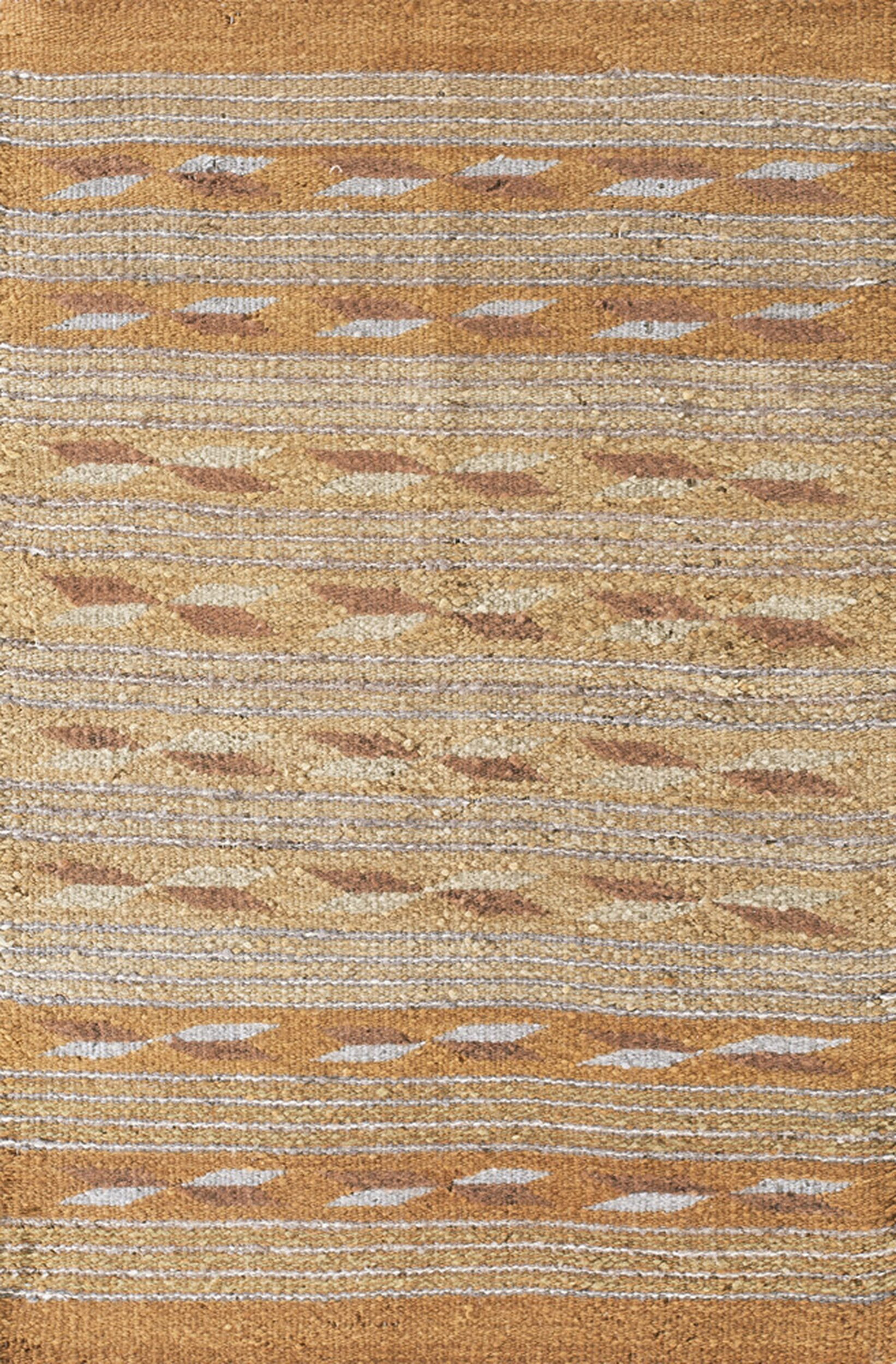 Characterized by a strong, linear structure, the design utilizes horizontal striping overlaid with repeating, stylized lozenge motifs. This balanced presentation, where pattern elements cover the entire field without a defined medallion, places it within the category of allover rugs. The weaving technique highlights the appealing, slightly coarse texture of the hand-spun fiber.