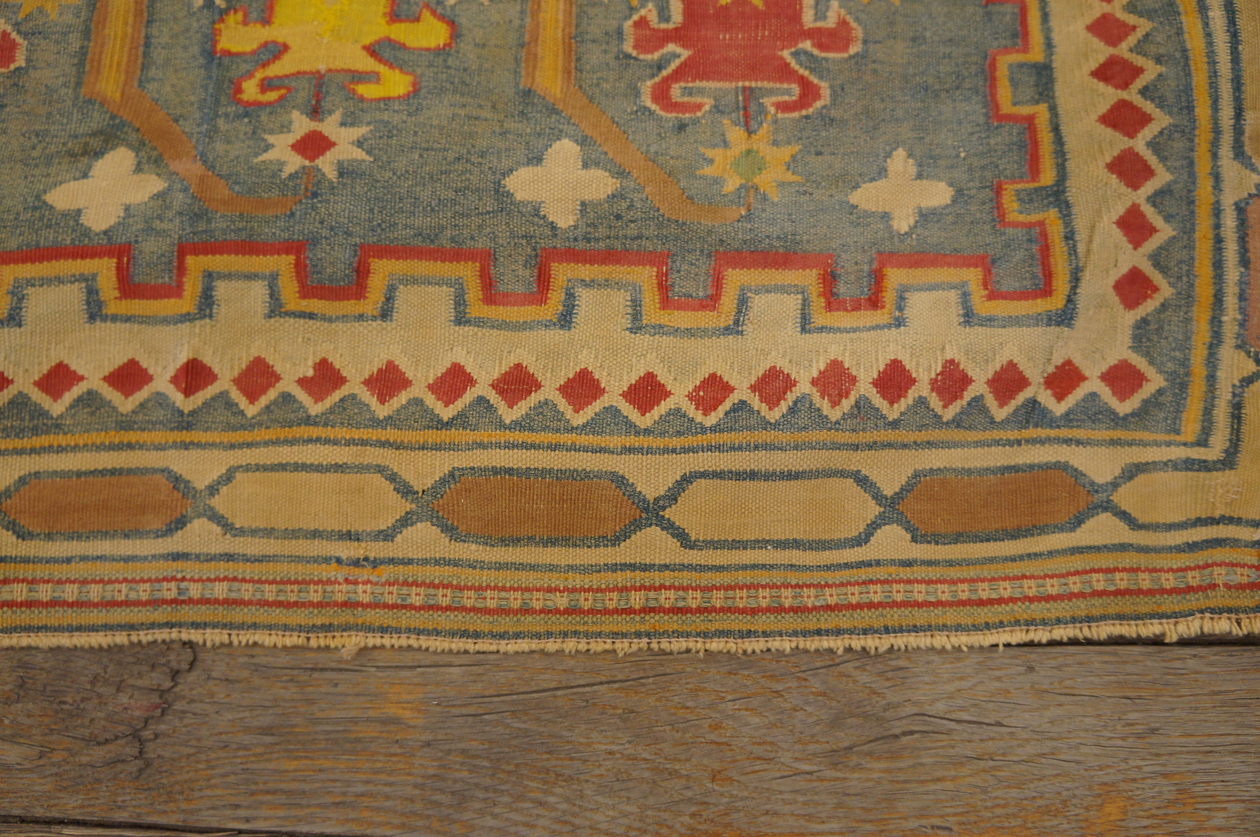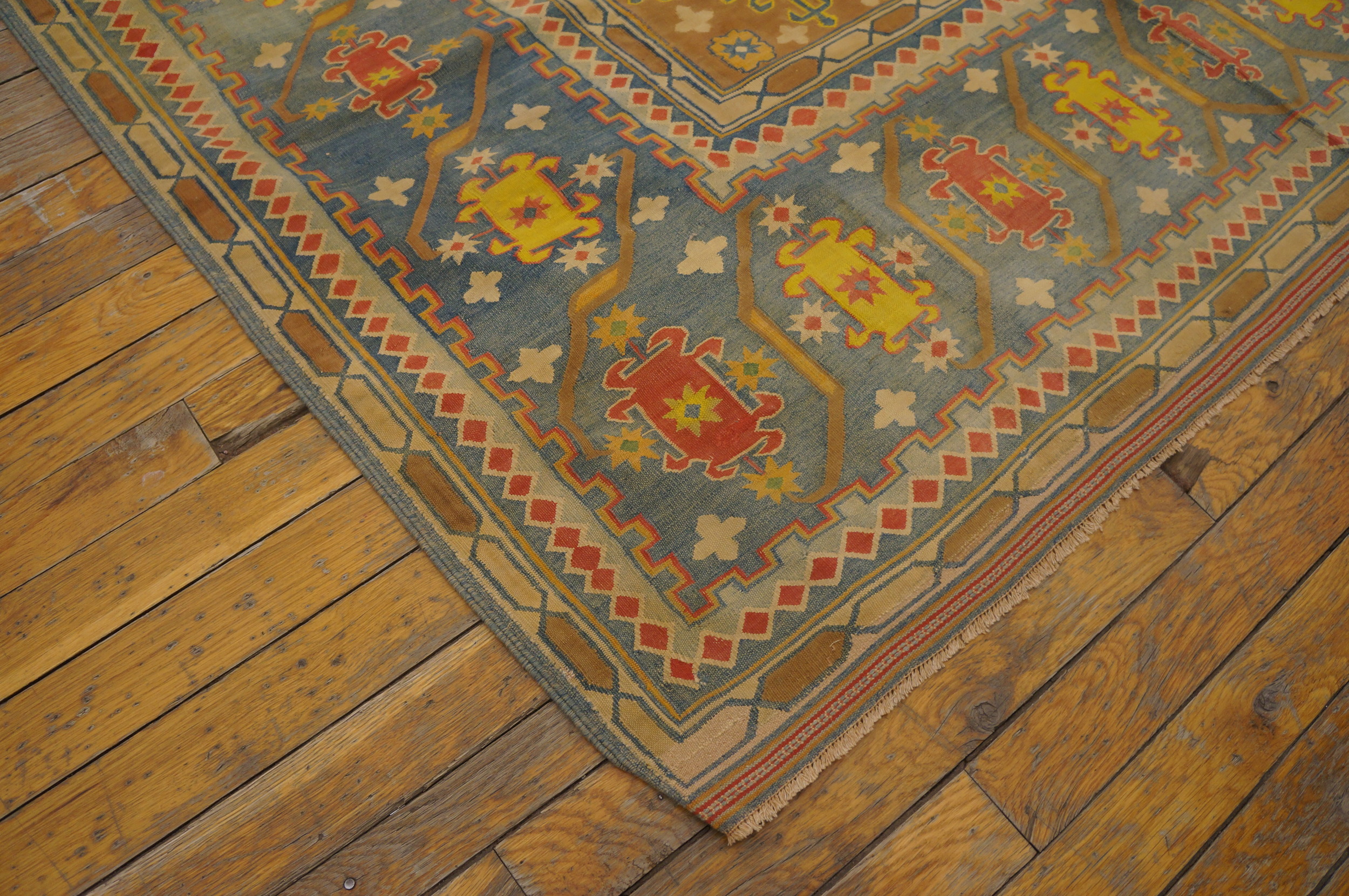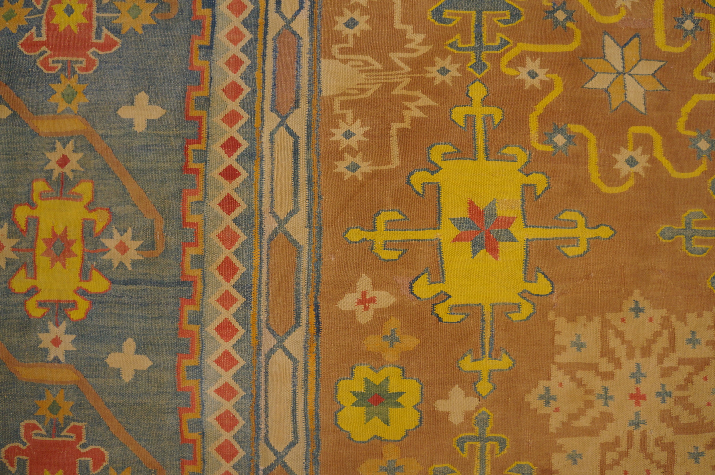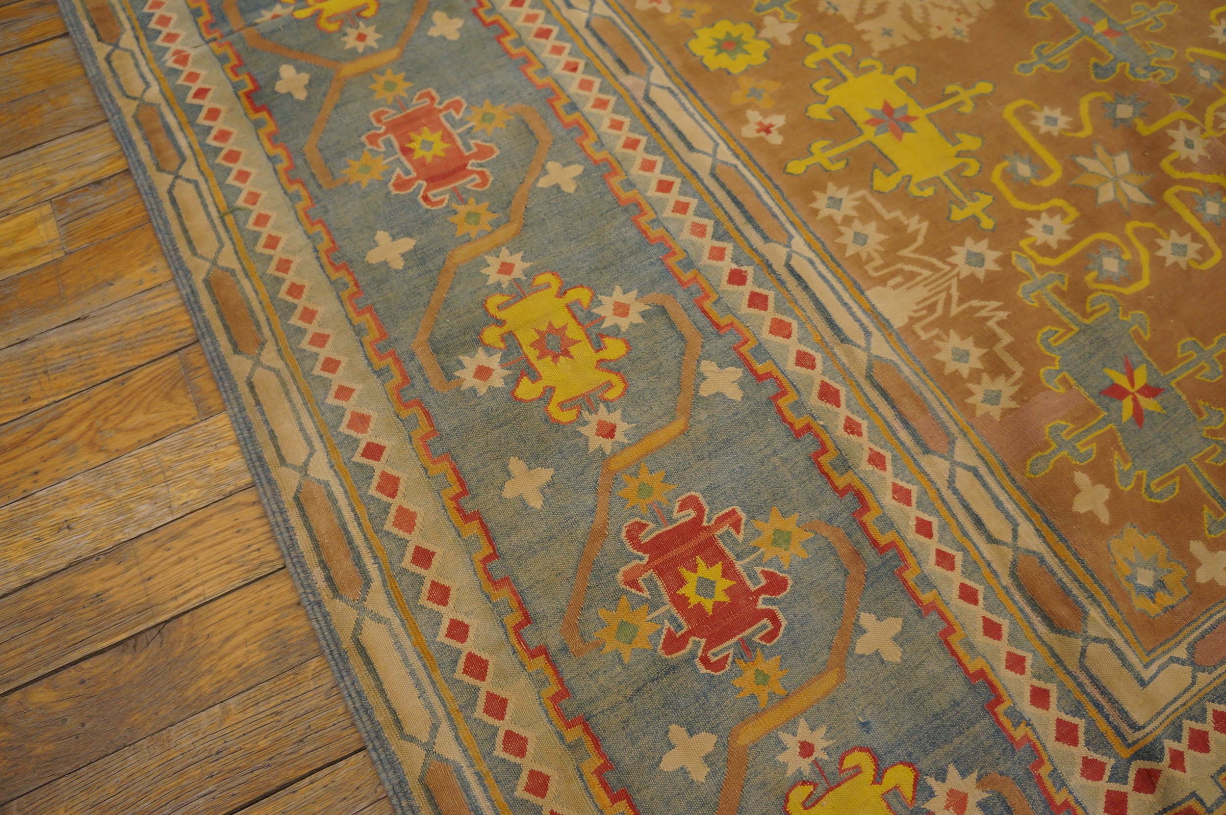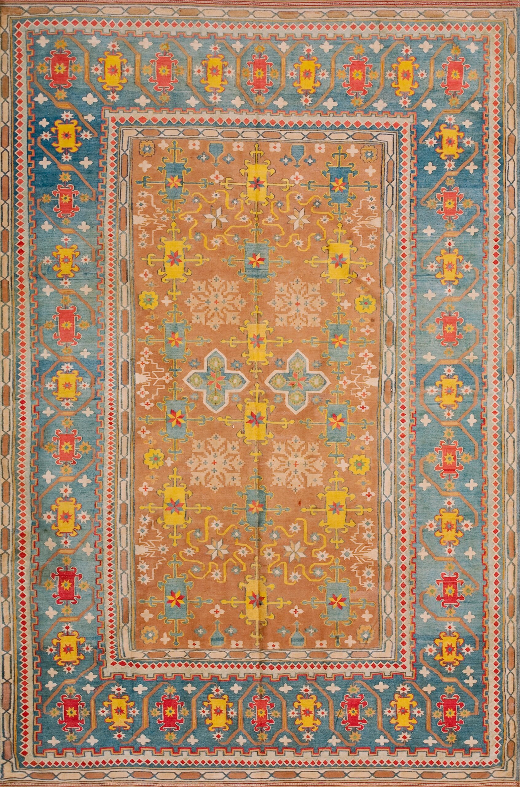 The field is dominated by a rich, variegated camel hue, placing it firmly within the desirable category of earth tone color rugs. This warm, grounding color provides a perfect foil for the vibrant secondary palette of saffron yellow, soft sky blue, and deep terracotta accents, creating a high-contrast visual experience rarely achieved in turn-of-the-century weaves.