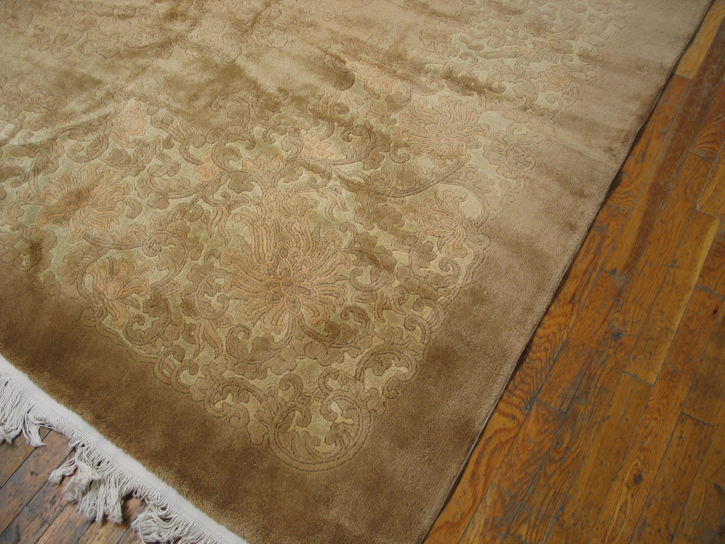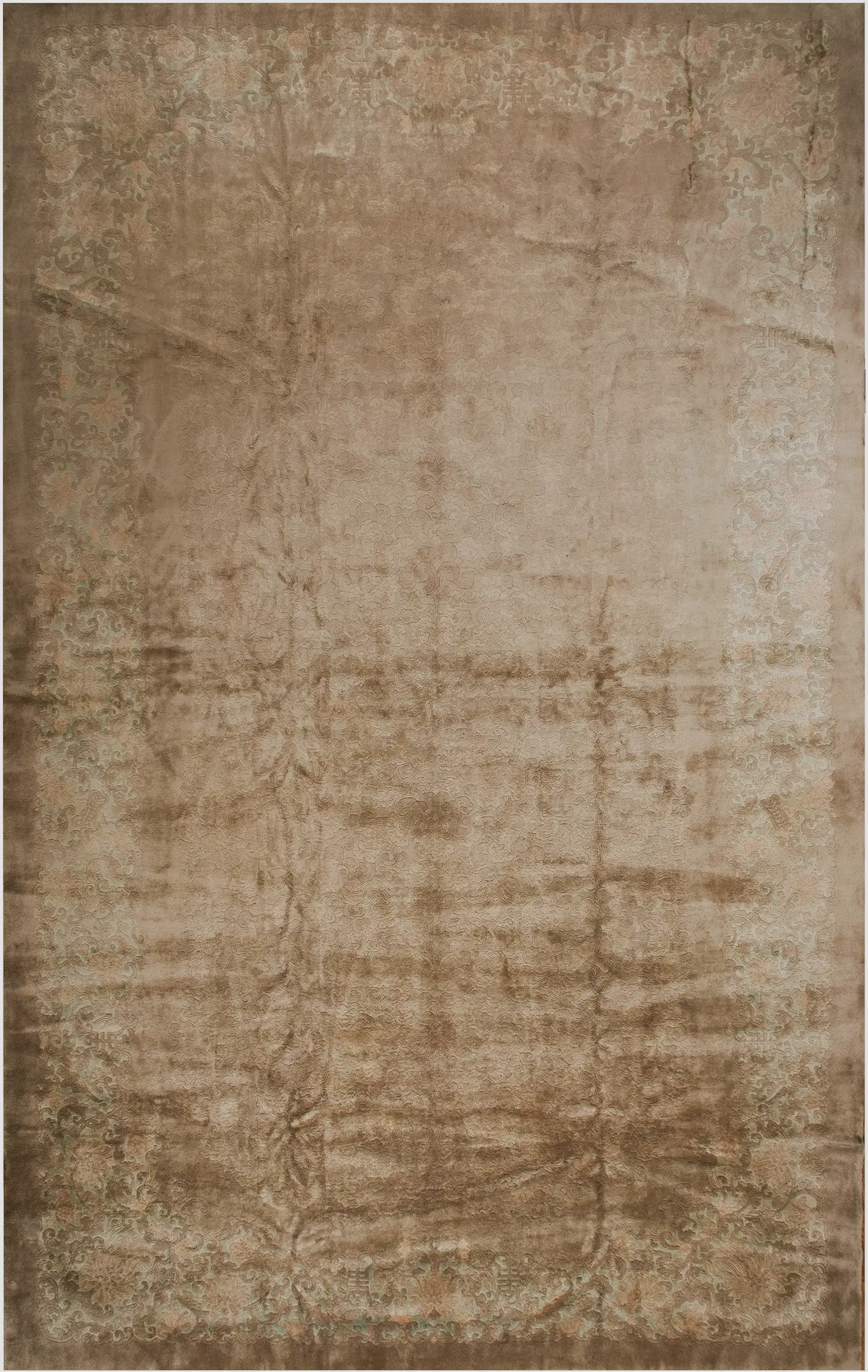 The palette is restrained yet profoundly rich, featuring a dominant field of warm camel and taupe wool. The subtle, tone-on-tone border motifs are rendered in contrasting tones, hinting at the sophisticated use of ivory color rugs during this era, providing a monochromatic depth that complements diverse interior styles.