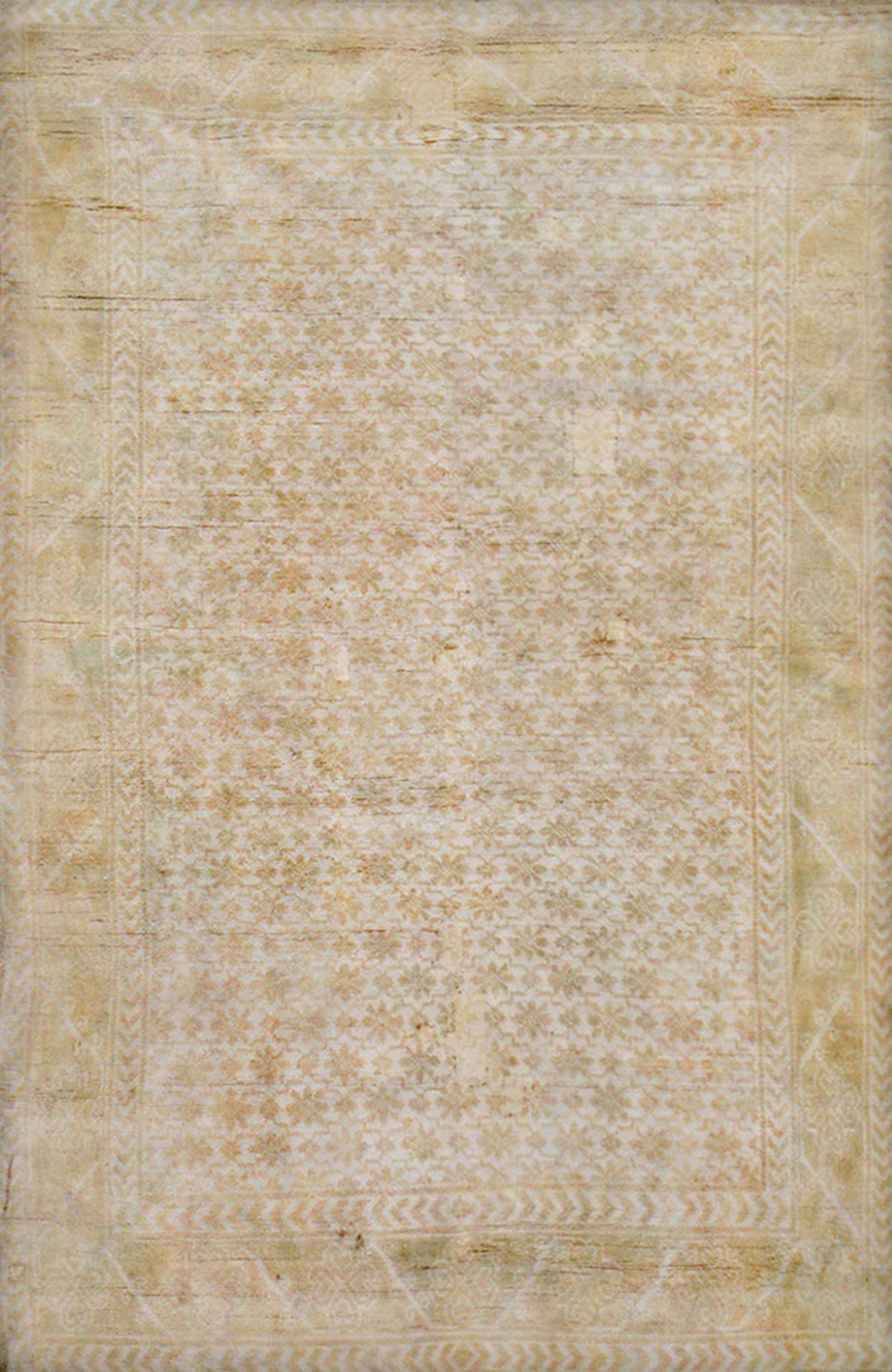 The borders typically serve as a soft architectural frame, echoing the central botanical themes to “lock in” the airy elegance of the field. To possess this antique washed-out Agra rug is to own a monument to Indian textile history. It bridges the gap between the grandeur of the Mughal courts and the sophisticated requirements of the contemporary interior—transforming a small space into a sanctuary of historical gravity and serene, floral grace.