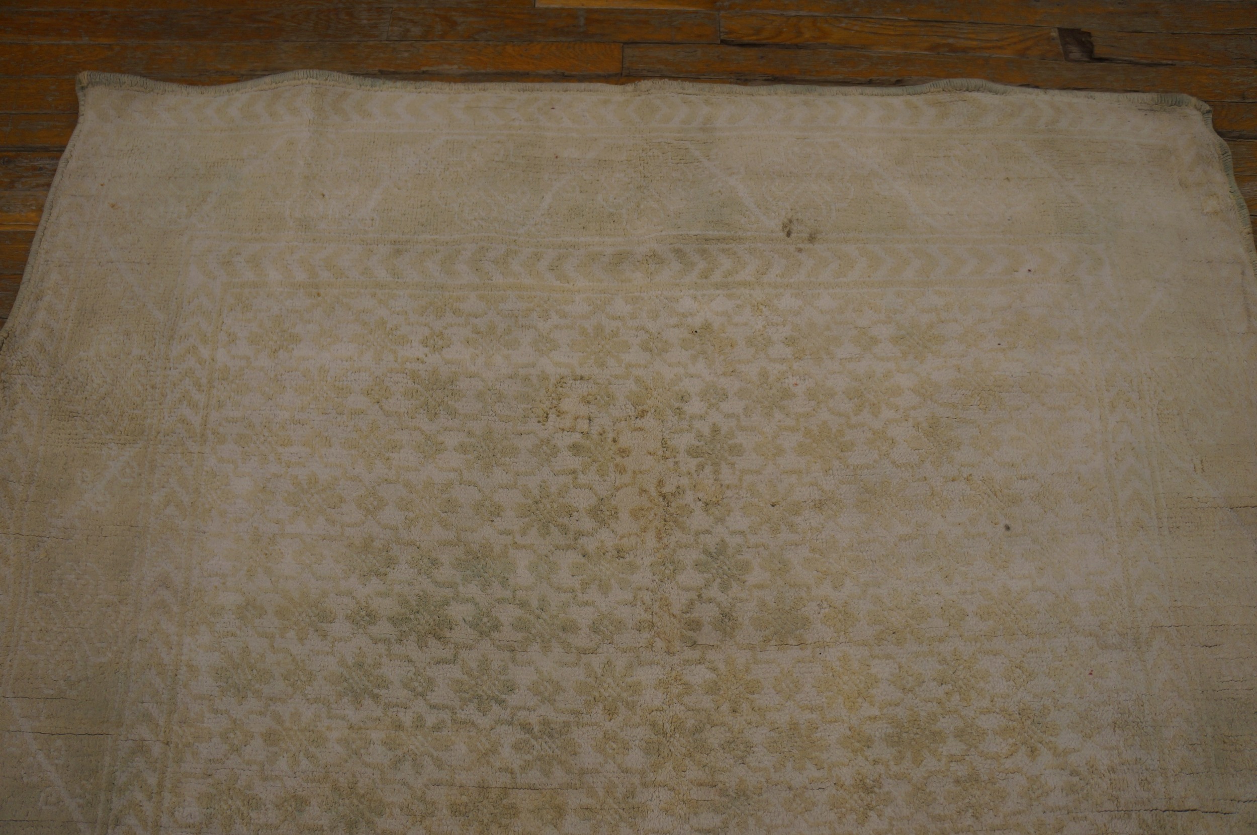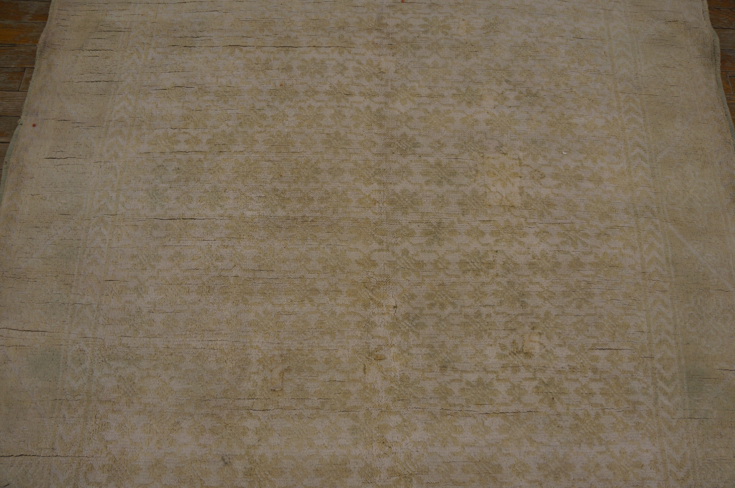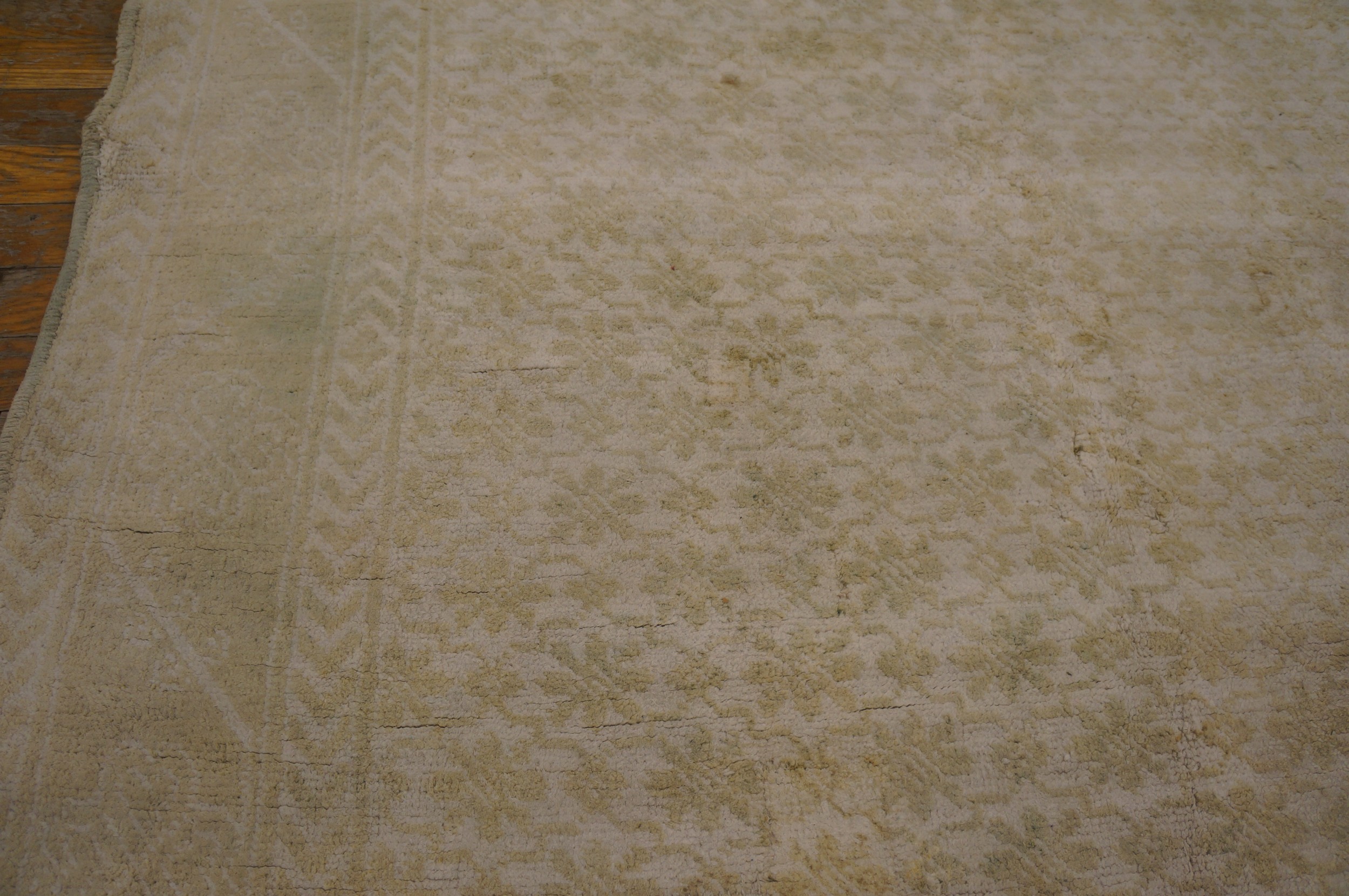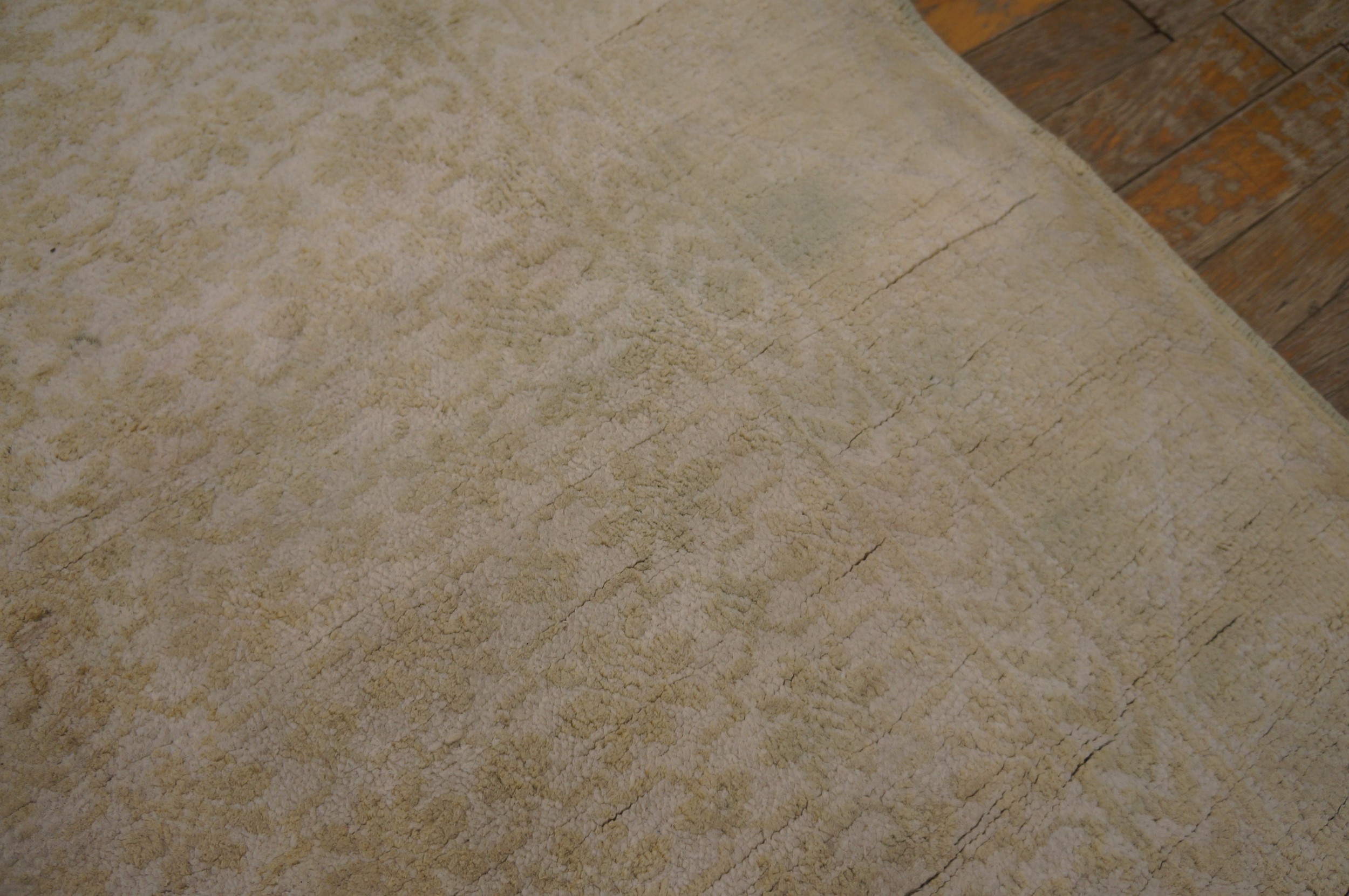 The palette is anchored by a luminous light ivory and cream foundation. This “parchment” ground has been softened by over a century of natural oxidation and a professional “luster wash,” resulting in a distressed, sun-drenched patina. The secondary floral accents—rendered in “ghost-like” tones of faint rose, pale sage, and whispers of sky blue—possess a magnificent “marbled” variegation. This “washed-out” quality gives the rug a watercolor-like depth, allowing it to function as a neutral but soulful anchor for a room.
