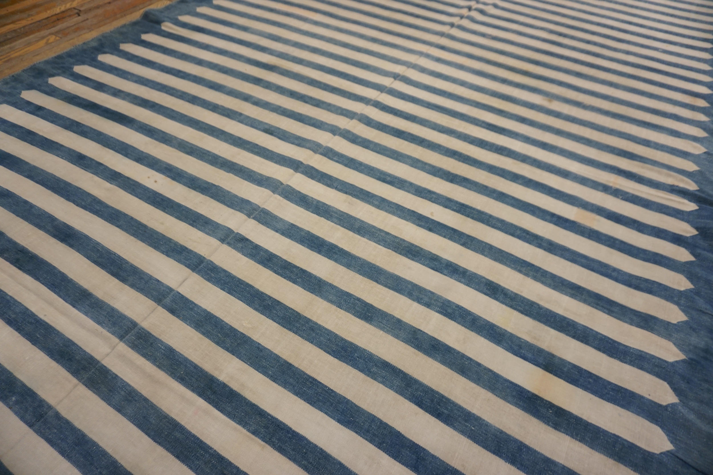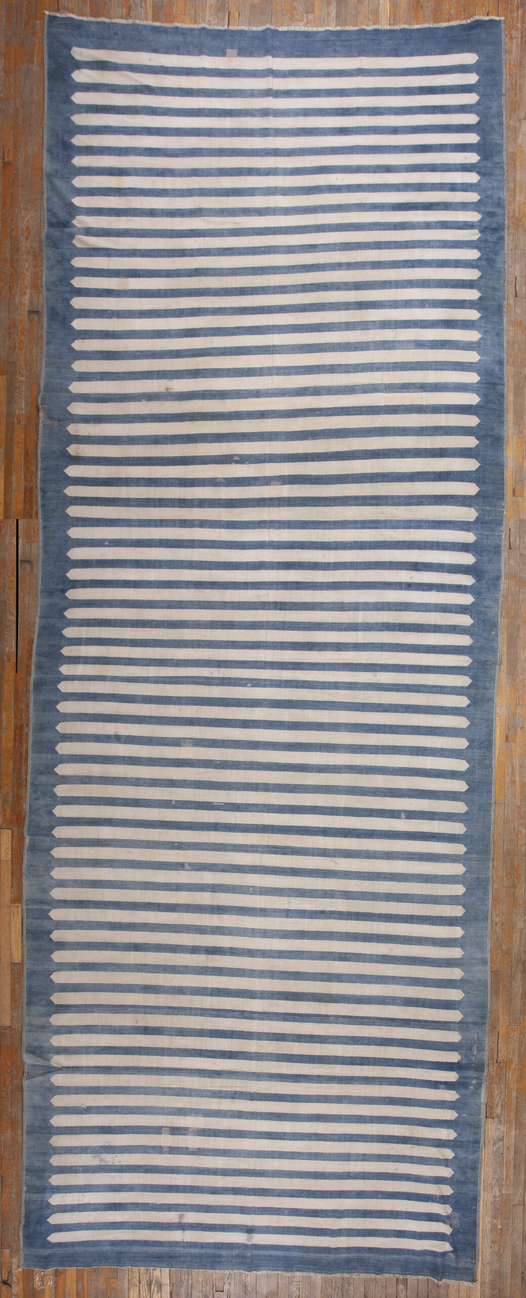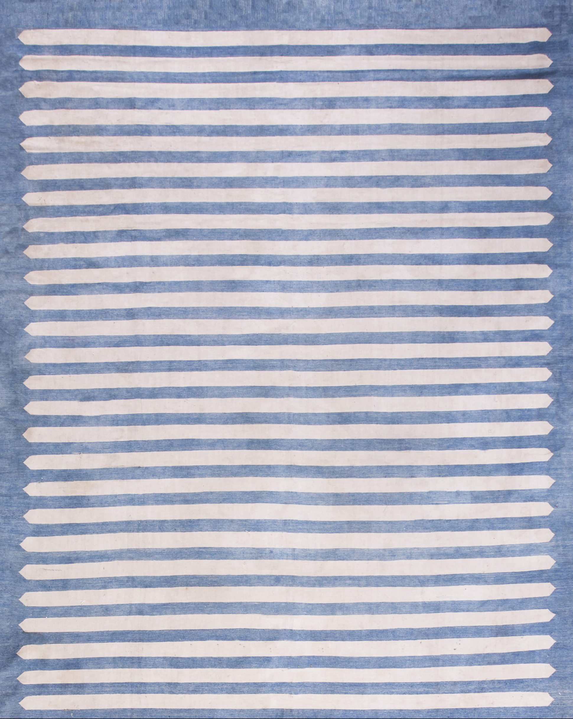 Woven to an impressive scale, this Dhurrie rug functions perfectly as a foundational element for a major living space, classifying it among the most desirable room size rugs. The horizontal striping, while minimalist, features a subtle complexity where the cream bands meet the solid blue field, terminating in sharp, arrow-like points along the vertical axis.