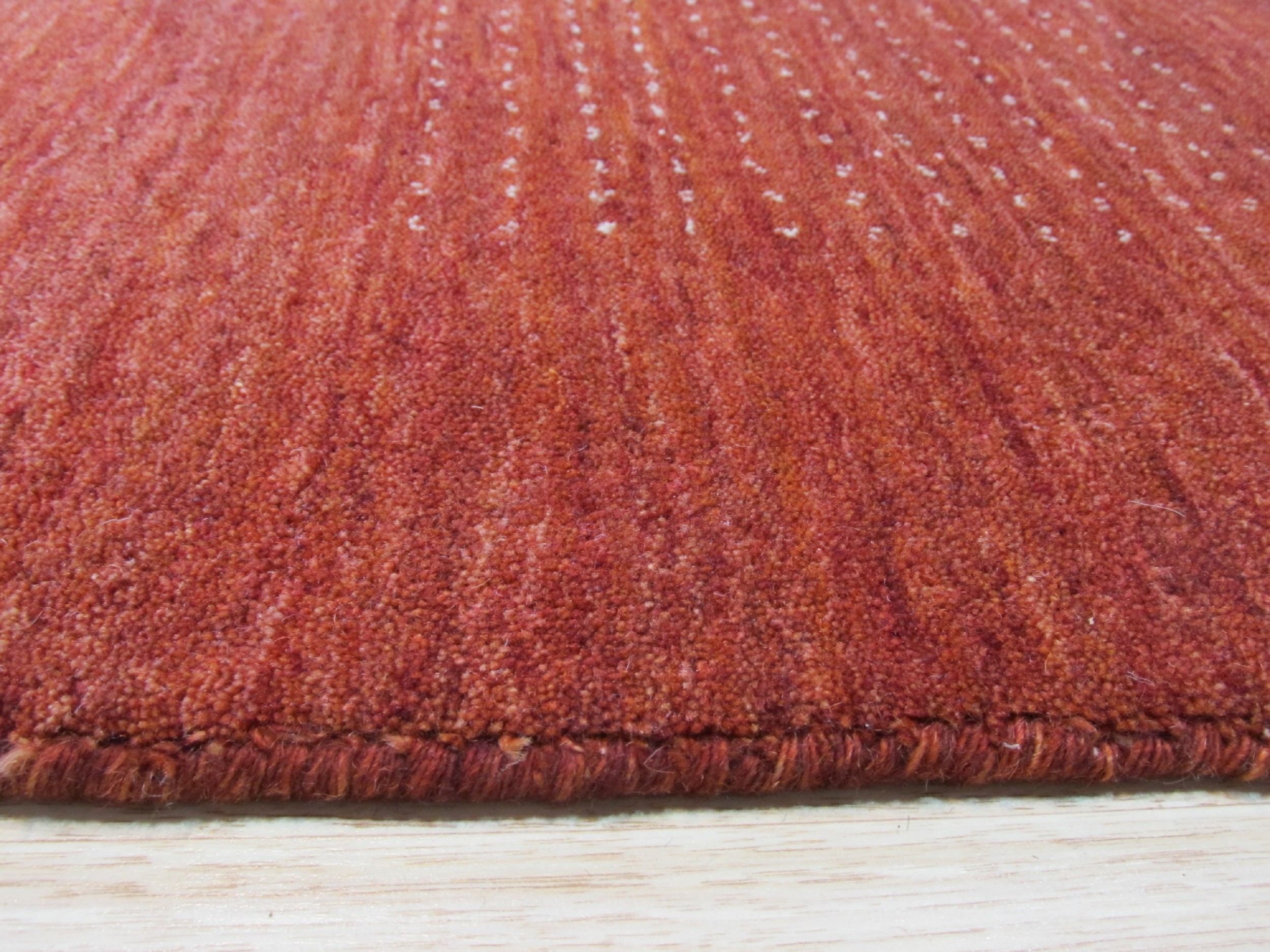 The dominant hue is a stunning, saturated red, leaning toward deep terracotta or rust, which provides warmth without overwhelming the room. Subtle variations in the wool’s dye lot create a gentle abrash effect, adding depth and organic movement across the field. This specific shade is highly sought after in modern color palettes.