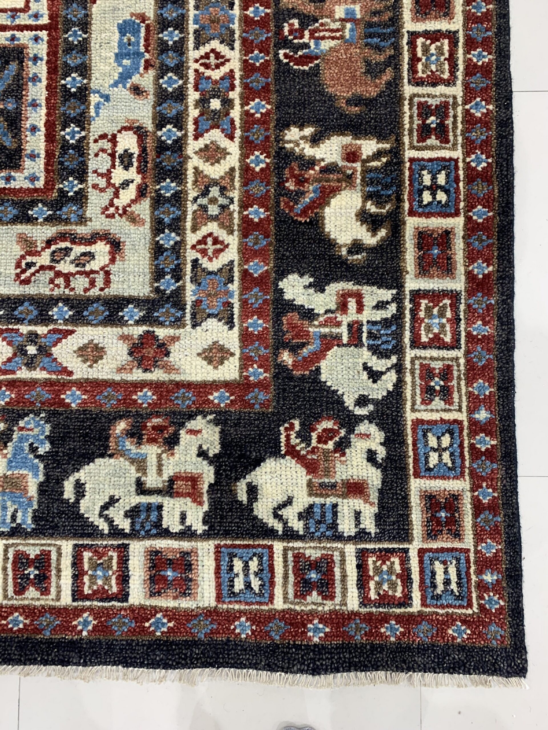 A fascinating narrative unfolds within the multiple borders, where stylized figures of riders on horseback and various fauna are depicted in a primitive, yet charming, folk art style. This intricate use of traditional iconography, combined with the dense knotting technique, showcases the enduring skill and artistic heritage found within Indian rugs.