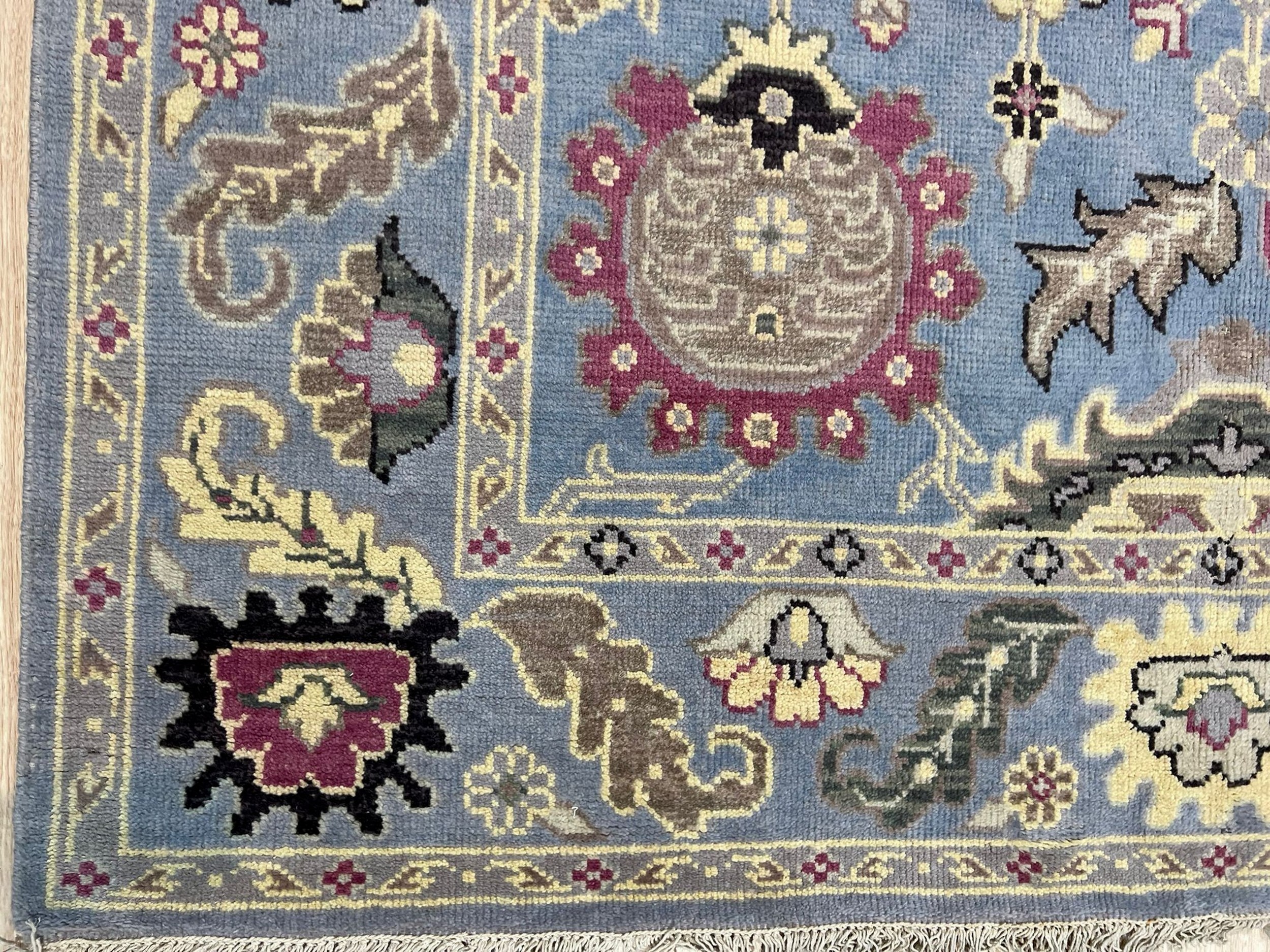 The Nan style, a hallmark of high-quality weaving from Indian rugs, often draws inspiration from classic European and Persian court designs. The intricate field features stylized palmettes, scrolling vines, and delicate floral sprays, which are carefully dispersed to maintain visual lightness and balance across the composition.