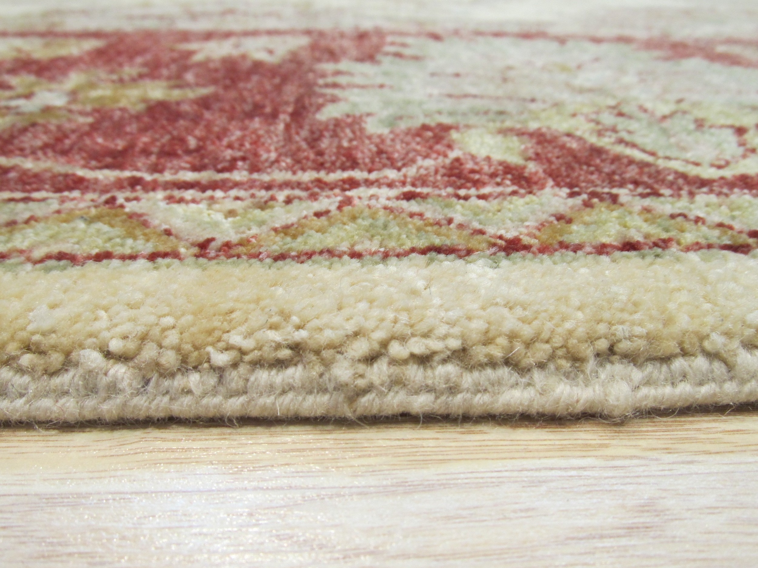 A dramatic, wide border in rich madder red frames the composition, featuring repeating floral medallions that anchor the overall design. The hand-knotted wool construction speaks to exceptional durability and a luxurious texture underfoot, making it a worthy addition to our curated collection of new area rugs.