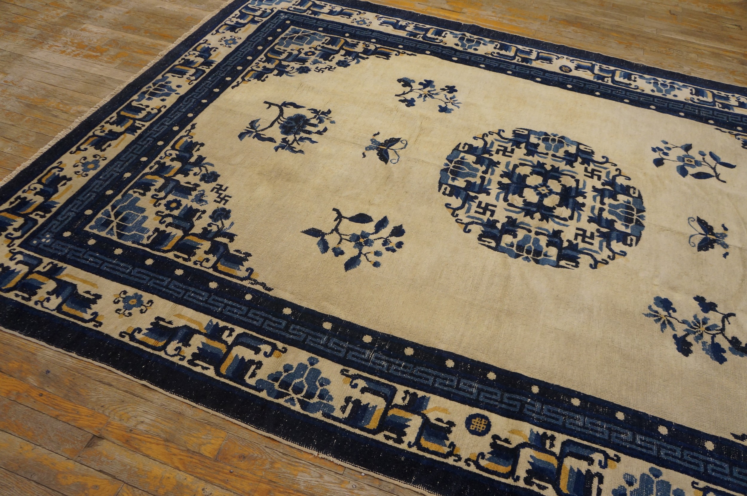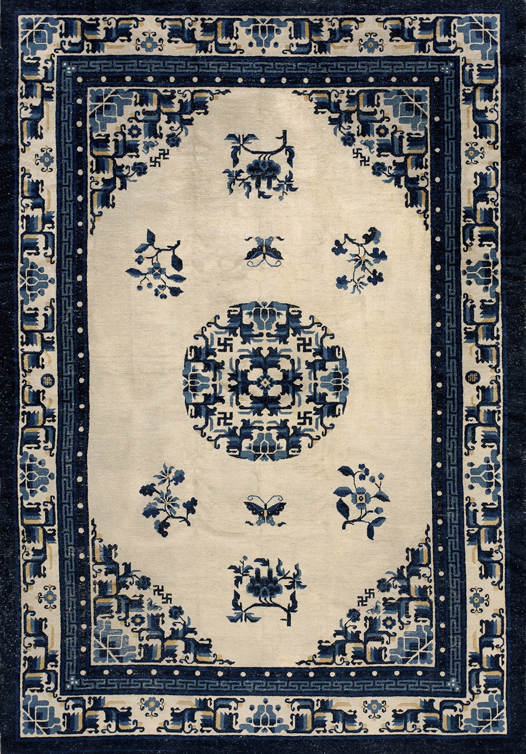 Wool 1920s Blue Ivory Beige Cream White Hand Knotted Pile Rectangle Antique Rug, Circa Date: 1920s. This exquisite example of a Chinese Peking rug showcases the refined aesthetic popular during the early 20th century, characterized by simplified designs and luxurious wool pile. Such pieces represent the pinnacle of antique rugs produced for the Western export market.