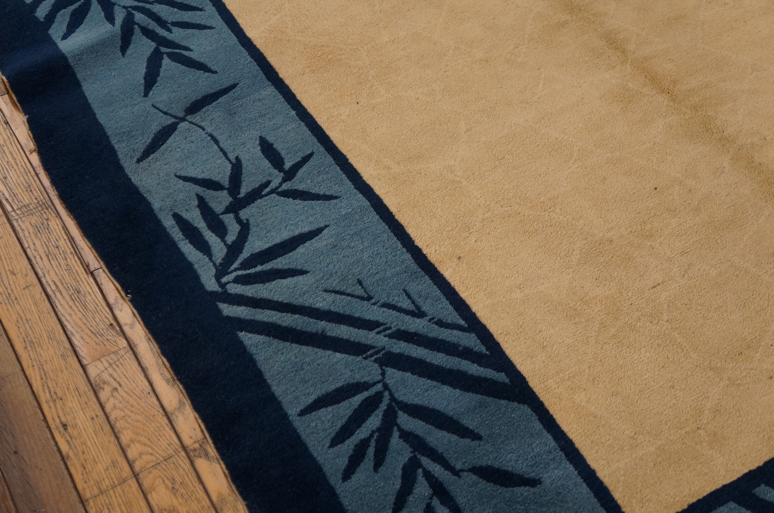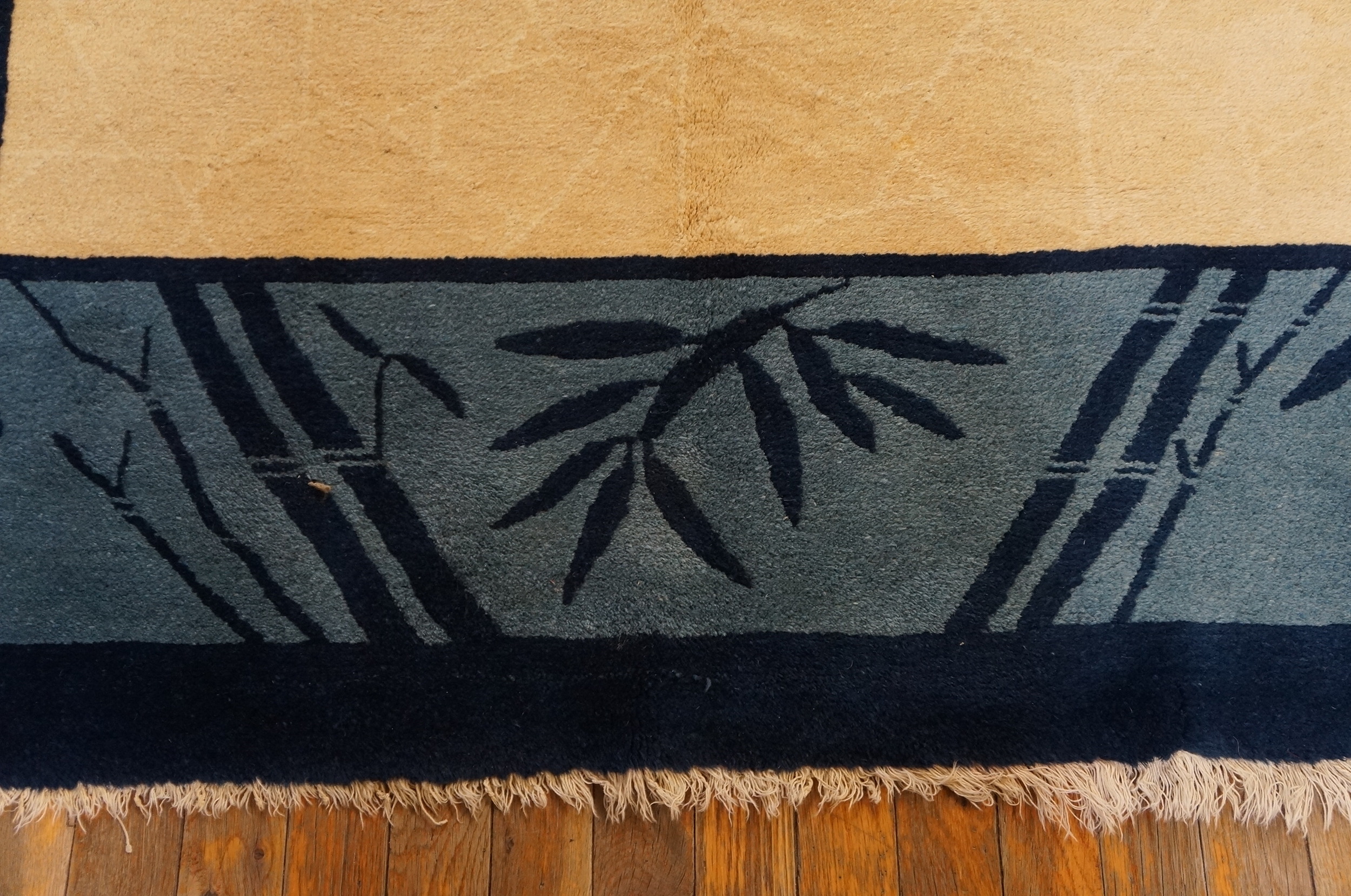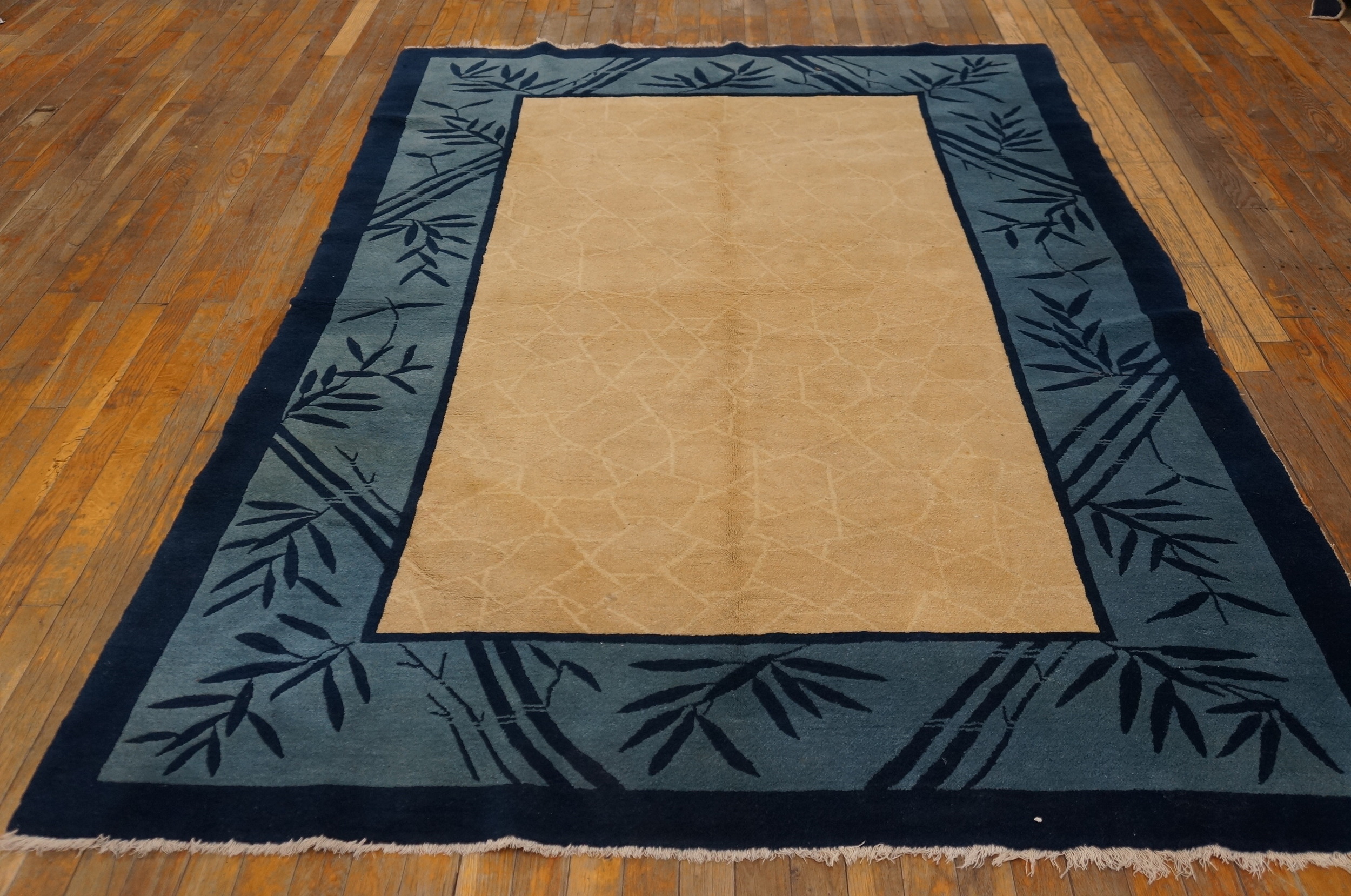 The striking border utilizes deep navy and slate blue tones, framing the field with bold, stylized motifs of bamboo stalks and leaves. This botanical interpretation, characteristic of the Chinese Art Deco movement, elevates the piece beyond simple geometry, placing it firmly within the tradition of floral rugs.