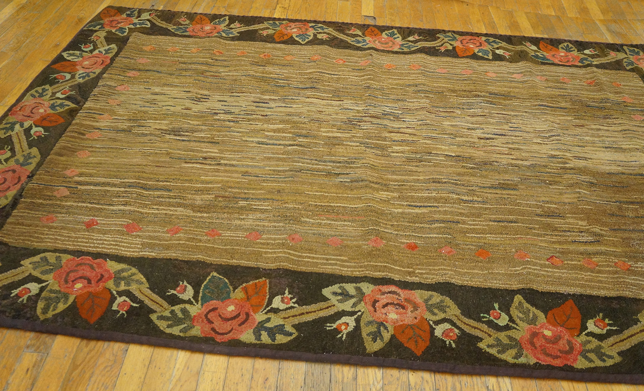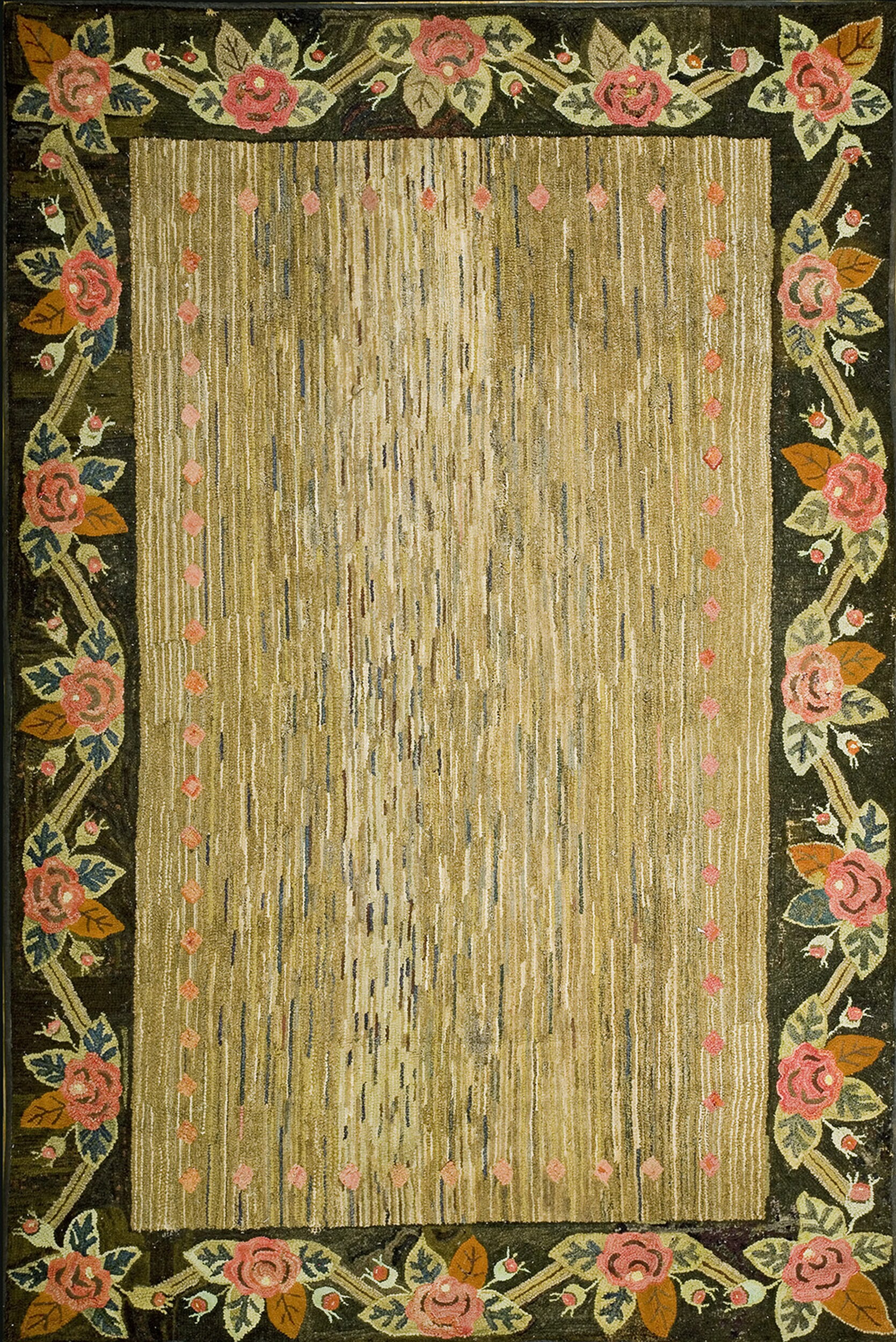 The design features a bold, dark border, likely deep olive or forest green, which sharply contrasts with the striated, golden-ochre field. This field texture, achieved through the hooking process, gives the piece an appealing, rustic abstraction. The border is heavily embellished with stylized rose garlands and trailing vines, a characteristic element often seen in floral rugs of the period.