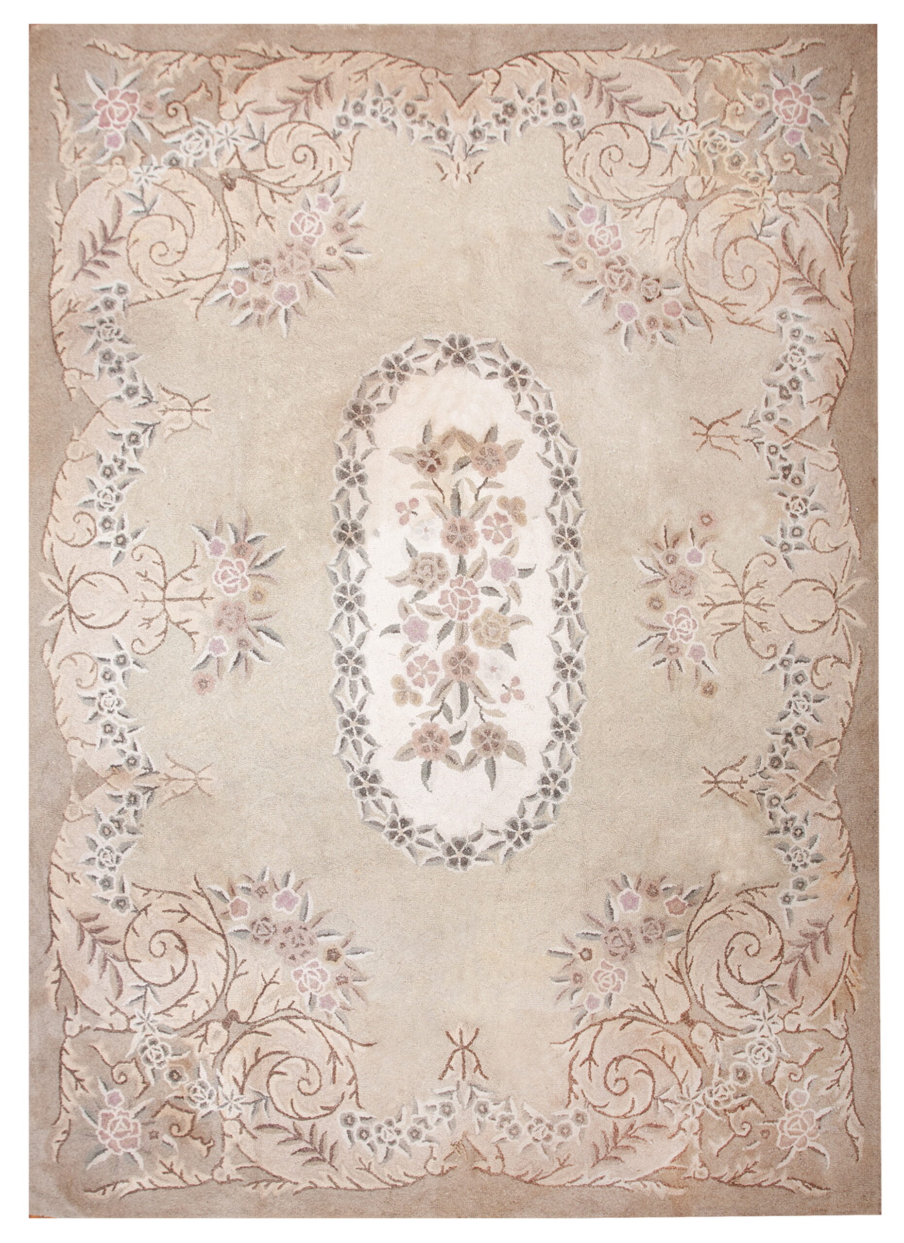 The sophisticated ivory color palette dominates the field, providing a neutral yet warm foundation that allows the subtle secondary colors—soft rose, muted taupe, and pale sage—to emerge gracefully. The central medallion features a delicate bouquet, framed by an elegant, scrolling vine border.