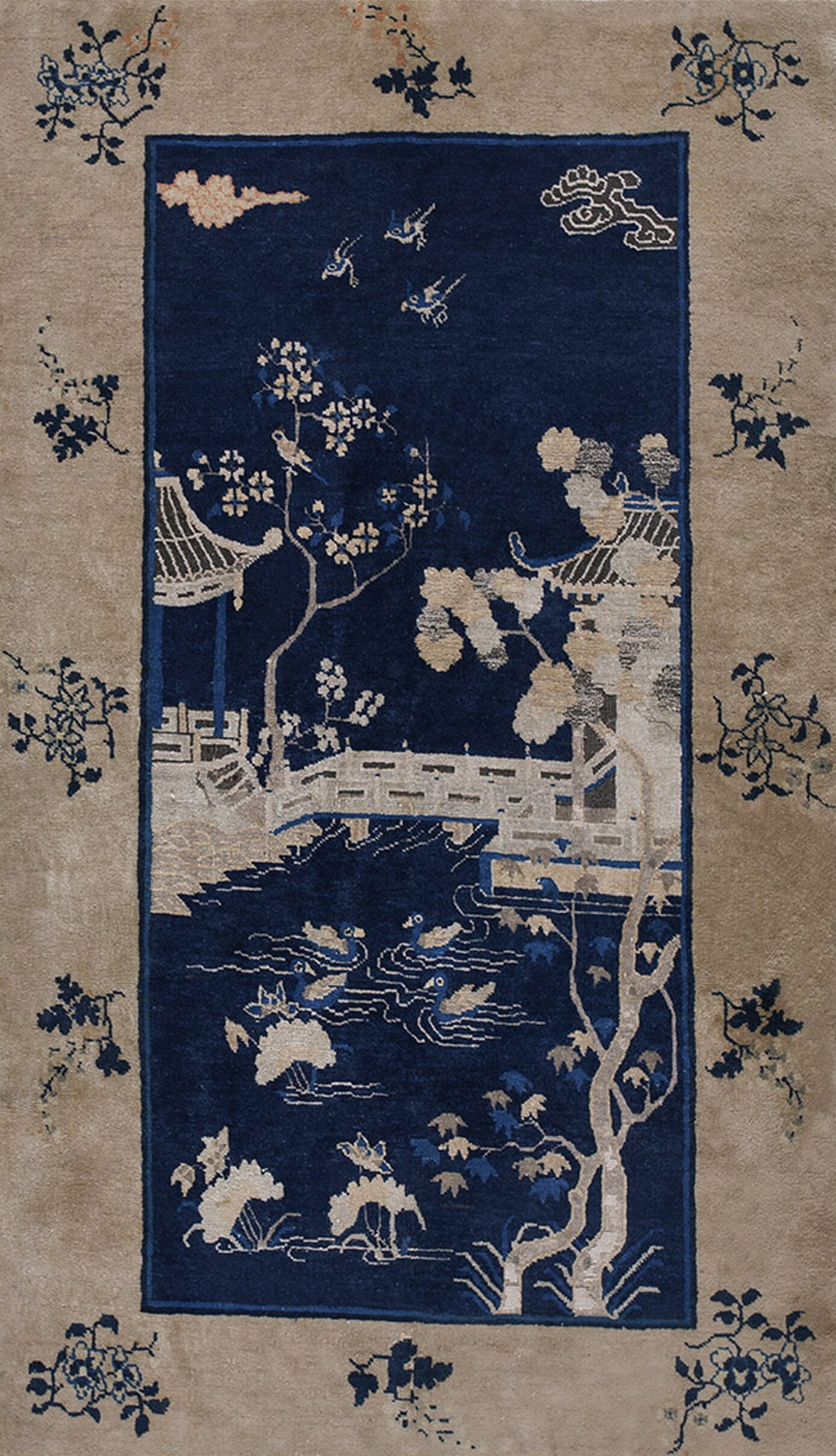The primary field is saturated in a rich, deep indigo, characteristic of the finest blue color rugs produced during this era of Chinese textile art. Against this dramatic backdrop, a detailed, narrative scene unfolds: a tranquil garden with a stone bridge, weeping willows, and water fowl gliding across the surface of a pond. The use of soft creams and muted taupes for the architecture and foliage provides striking contrast.