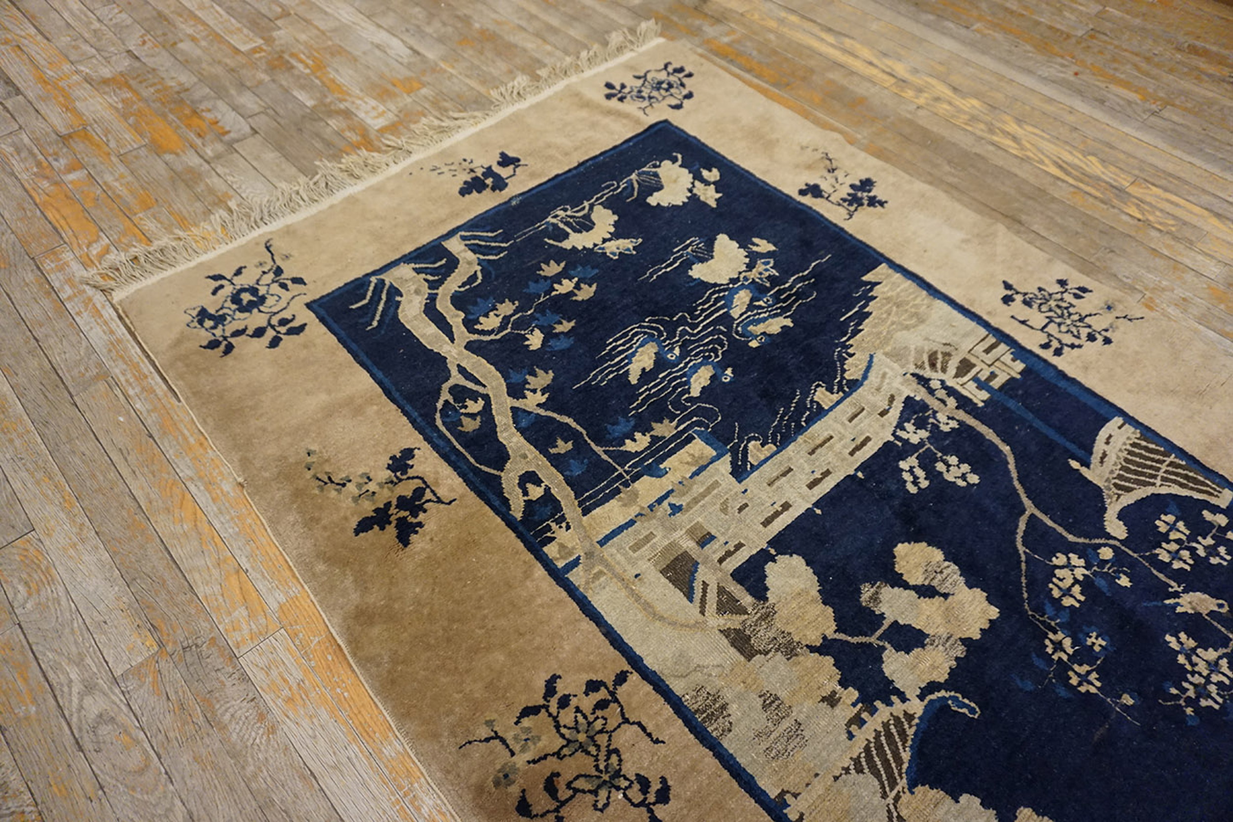 Wool Antique Chinese Rectangle – Peking 1920s Knotted Blue Small Scatter Size Rug, Circa Date: 1920s. This exquisite example of early 20th-century weaving captures the refined aesthetic of the Peking tradition. Its modest dimensions make it an ideal small scatter size rug for an entryway or beside a piece of fine furniture, offering a concentrated burst of historical artistry.