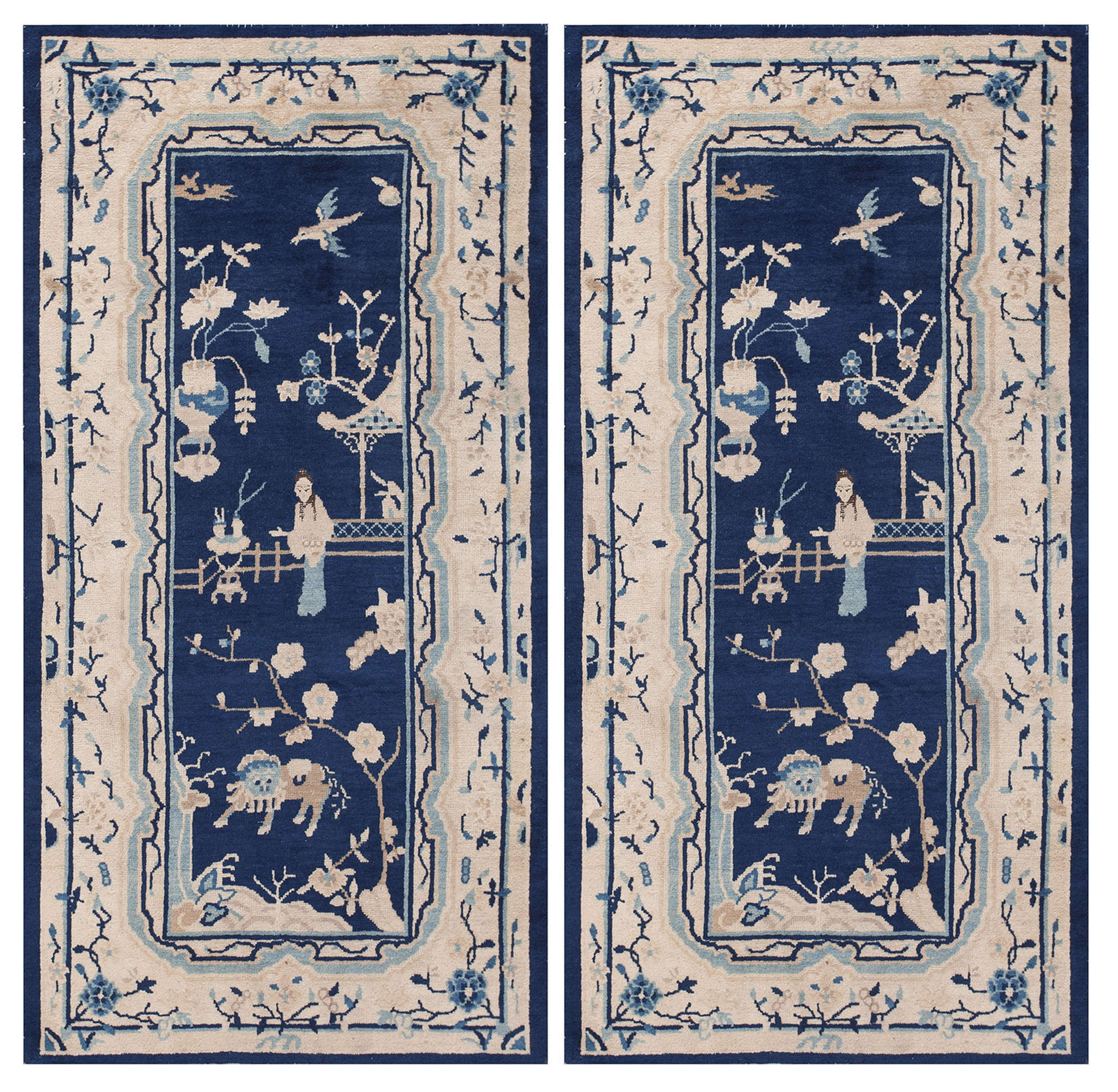 Wool Chinese – Peking Rectangle 1930s Knotted Antique Small Scatter Size Blue Rug, Circa Date: 1930s. This exceptional pair of Peking rugs, dating from the 1930s, represents the height of early 20th-century Chinese weaving, offering a rare example among antique rugs. The composition features a rich, deep indigo field, providing a dramatic backdrop for the delicate Chinoiserie motifs.