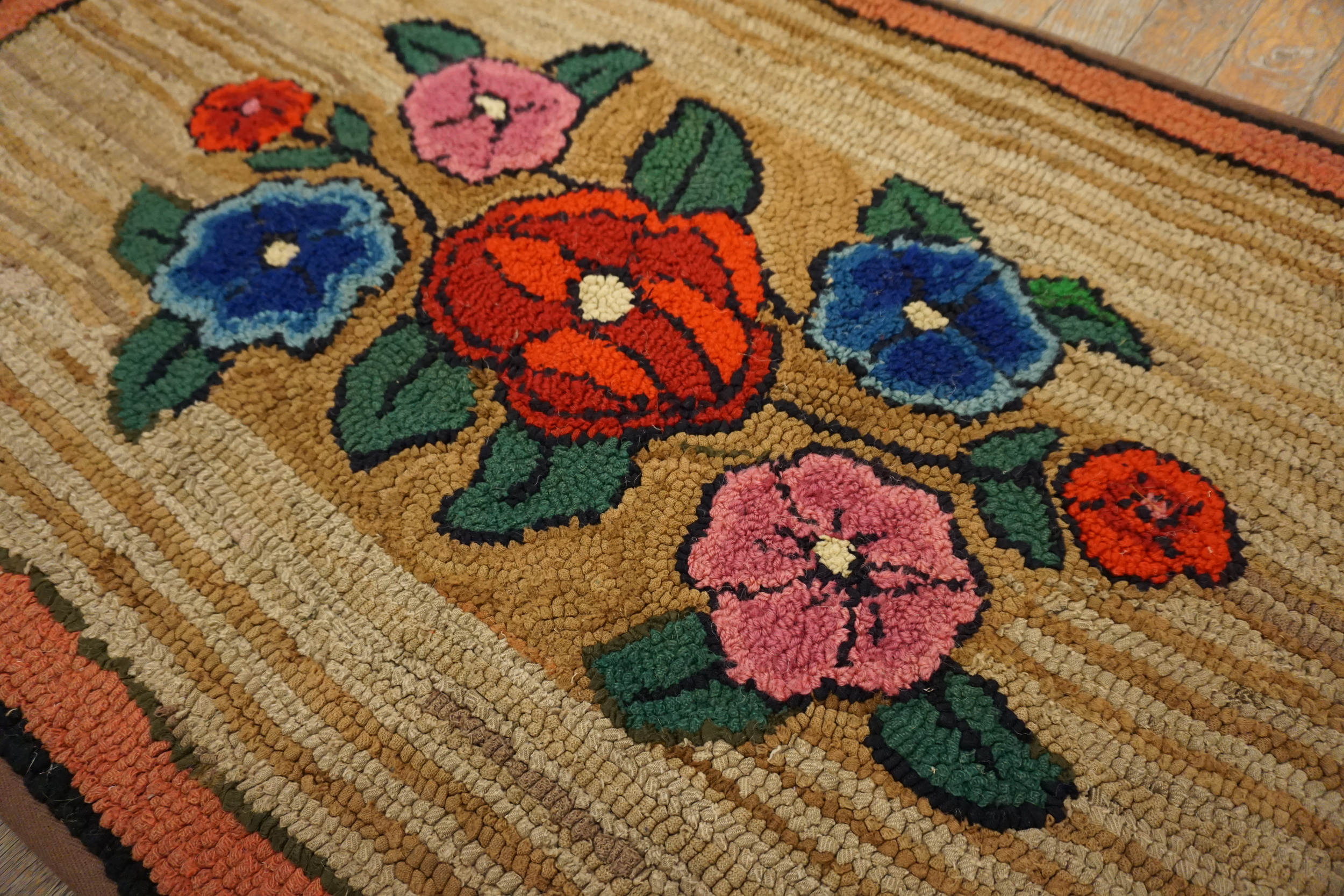 Wool Hooked Antique 1930s Small Scatter Size American Ivory Rug, Circa Date: 1930s. This charming example of an American hooked rug captures the enduring appeal of domestic textile artistry. Its practical, yet decorative, small scatter size makes it an ideal accent piece for an entryway or bedside.