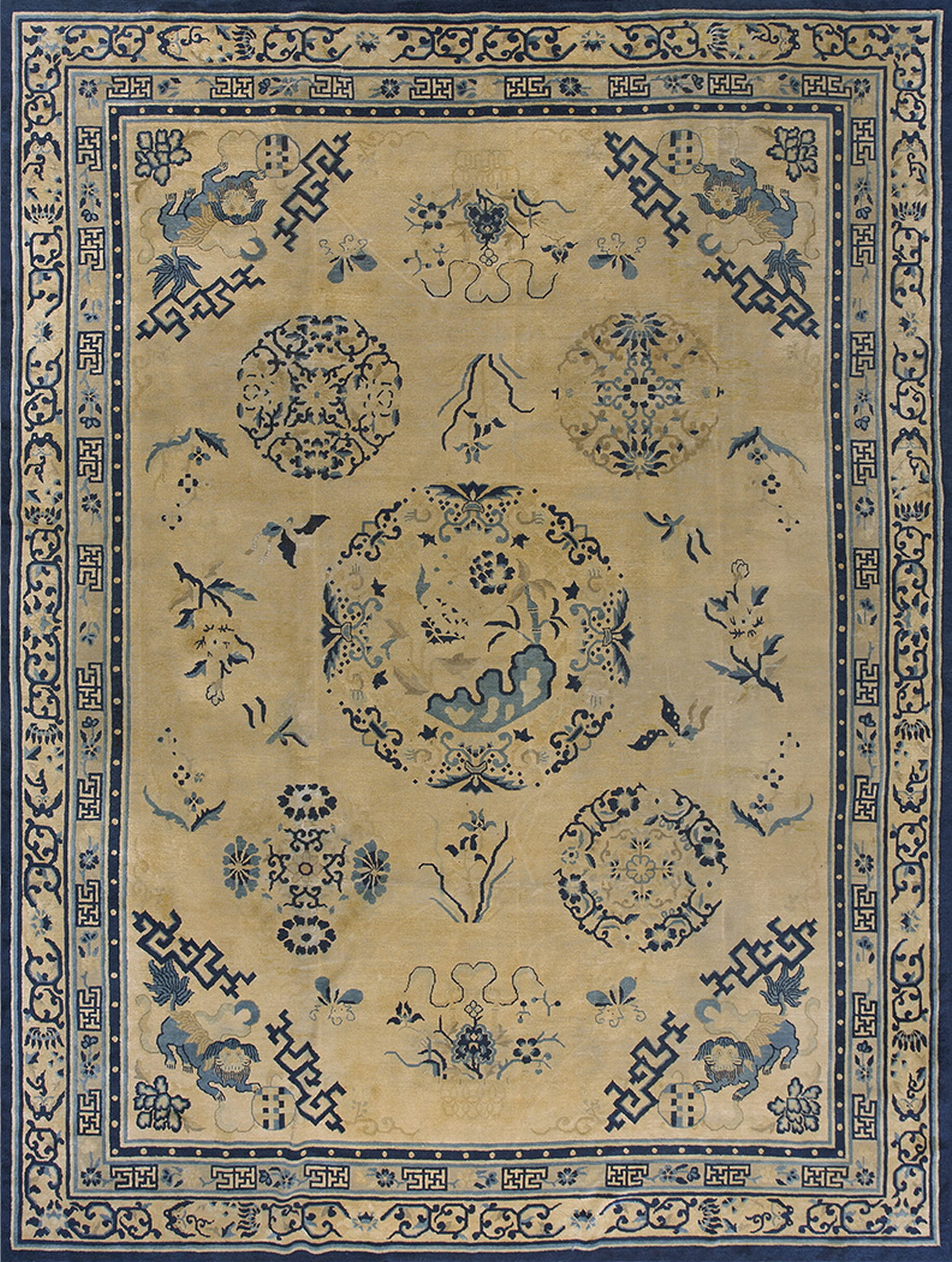 The complex border system, featuring multiple guard bands of geometric fretwork and scrolling vines, frames the composition with architectural precision. This piece represents a superb investment in textile history, offering collectors an authentic example of high-quality antique rugs from a pivotal era in Chinese decorative arts.