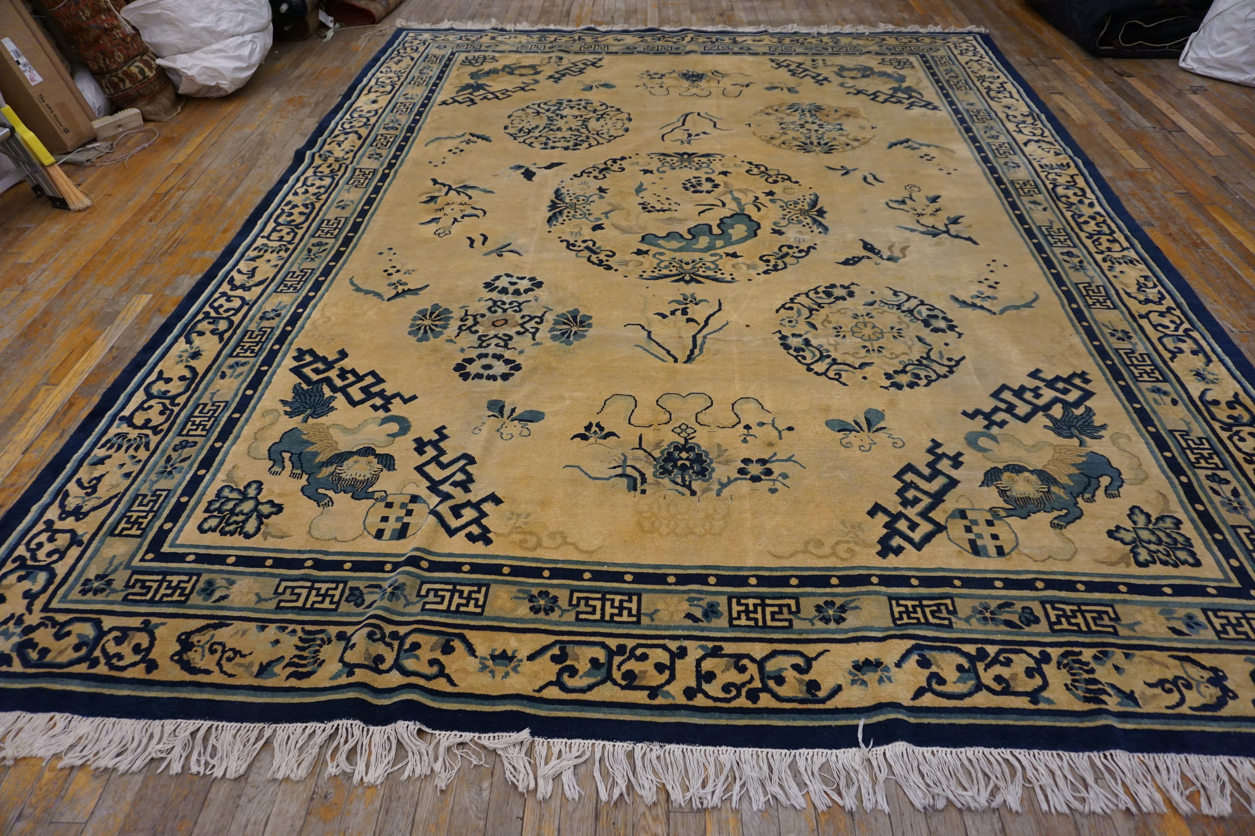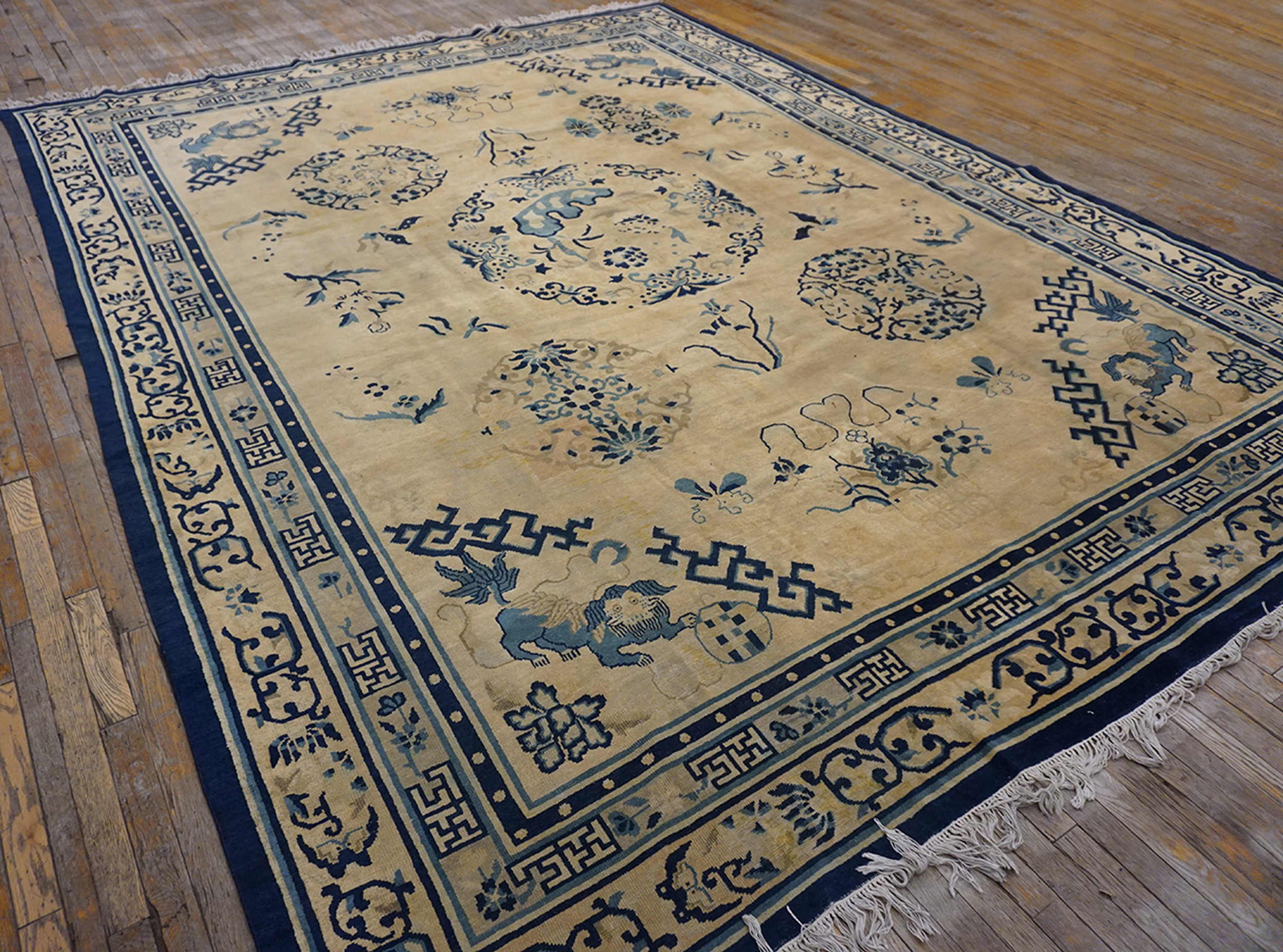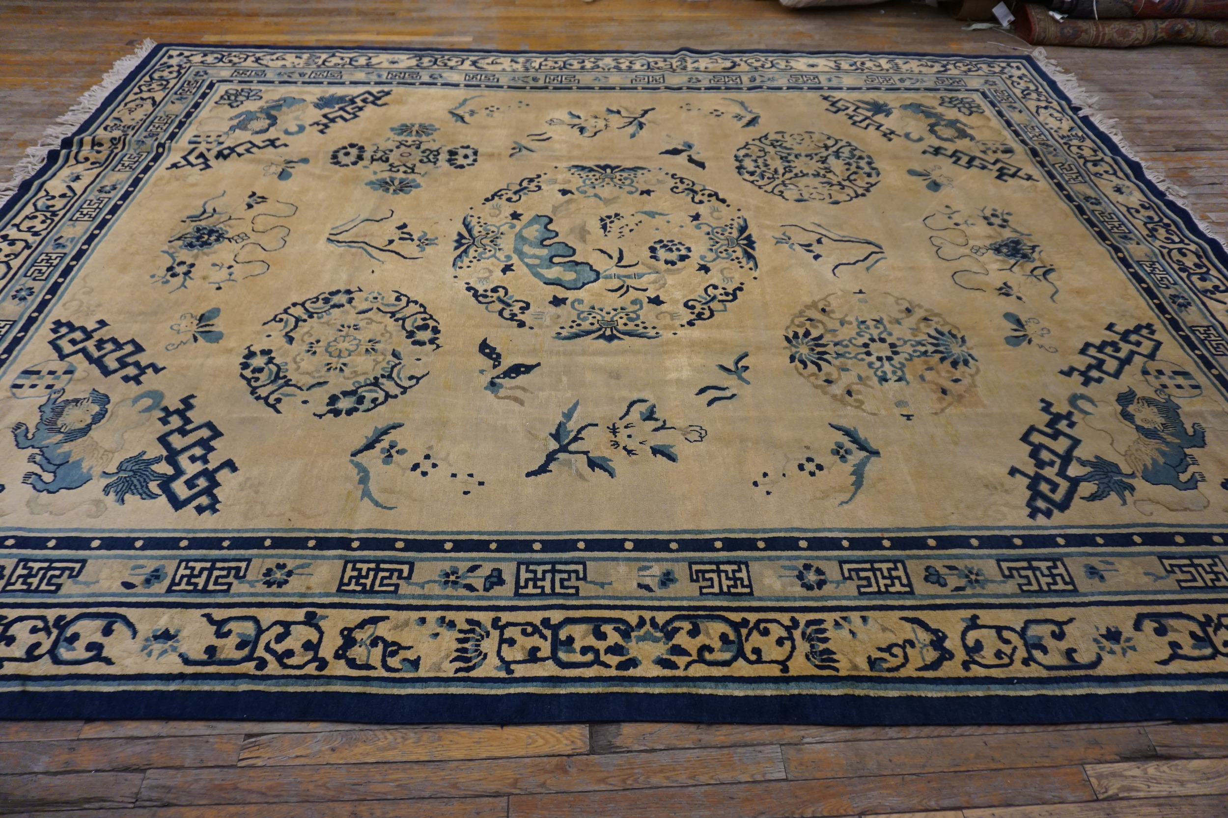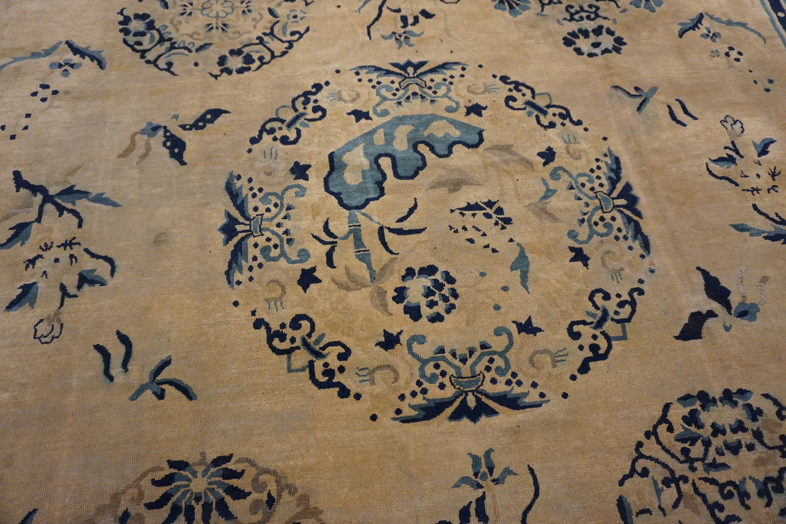Wool Ivory Chinese Antique Room Size – Peking 1920s Rectangle Knotted Rug, Circa Date: 1920s. This exceptional example of early 20th-century Chinese weaving captures the refined aesthetic prevalent during the Republic Period. Its generous scale qualifies it as a desirable room size rug, perfectly suited for anchoring a formal living space or dining area with historical gravitas.